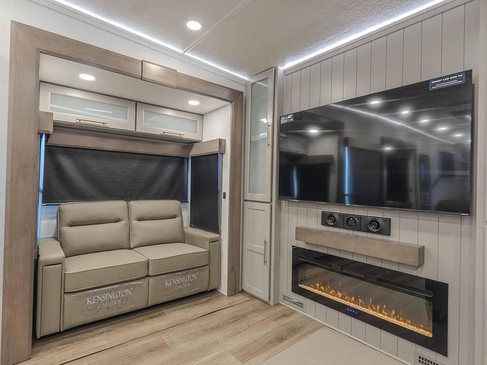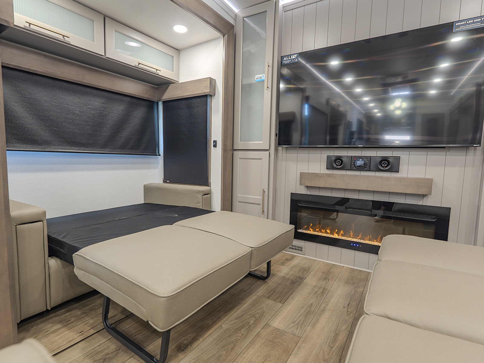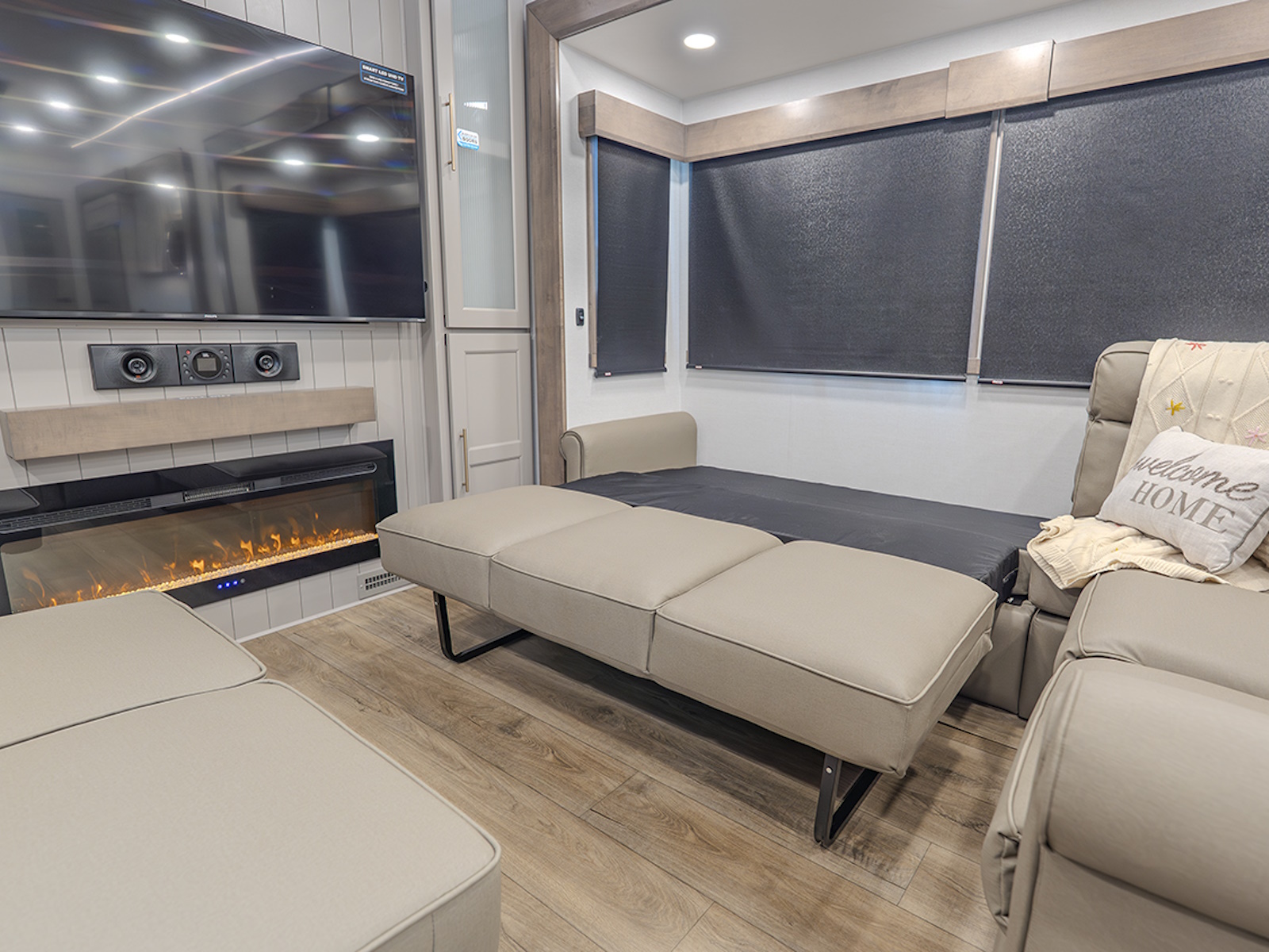 The rear living area is ideal for both relaxation and entertaining, with a dual recliner love seat positioned across from the massive 65" Smart TV. Guests will love the versatility of the area, which includes a sleeper sofa and a second sofa with overhead storage. This space can easily double as a cozy den or guest room.