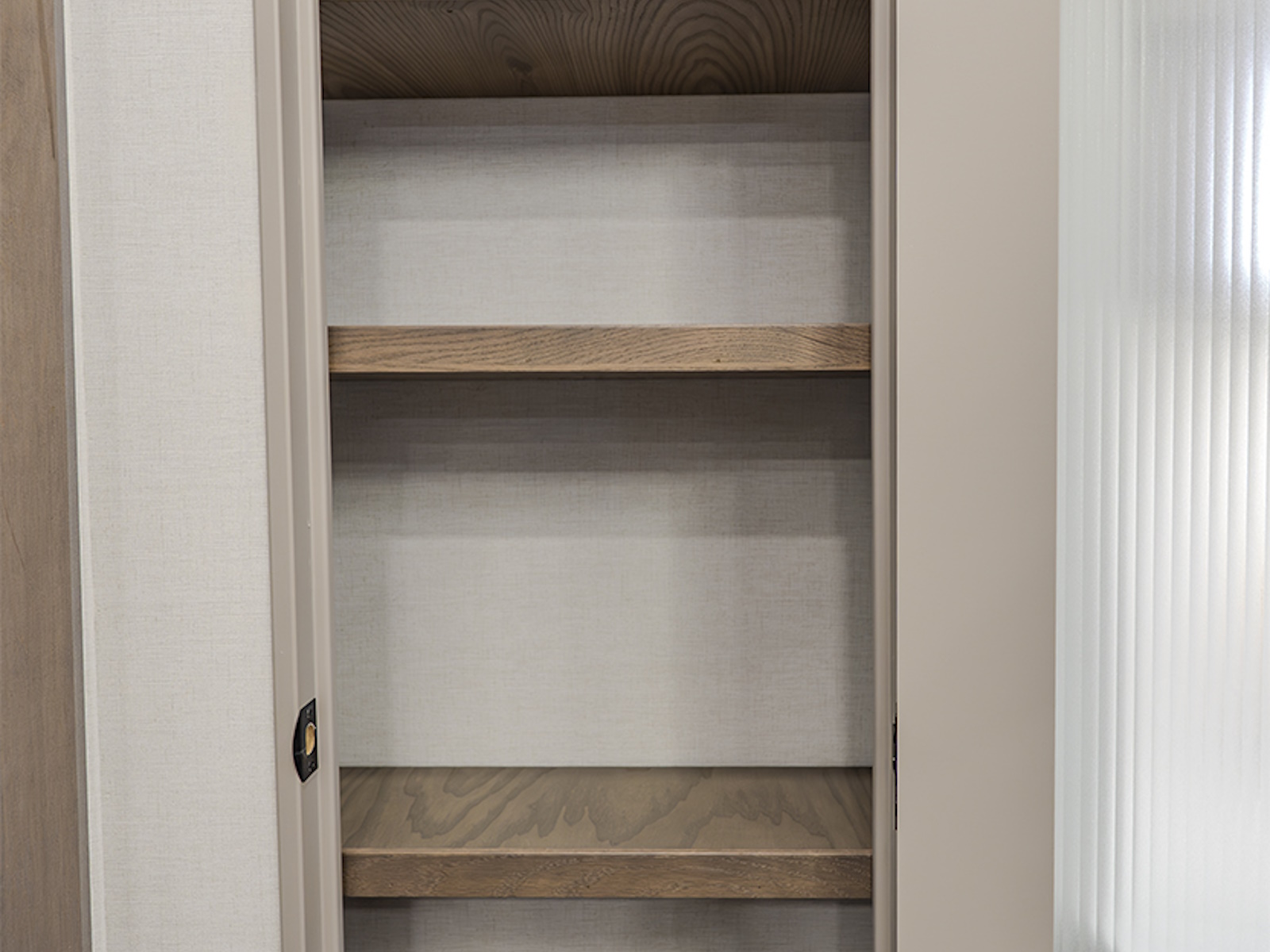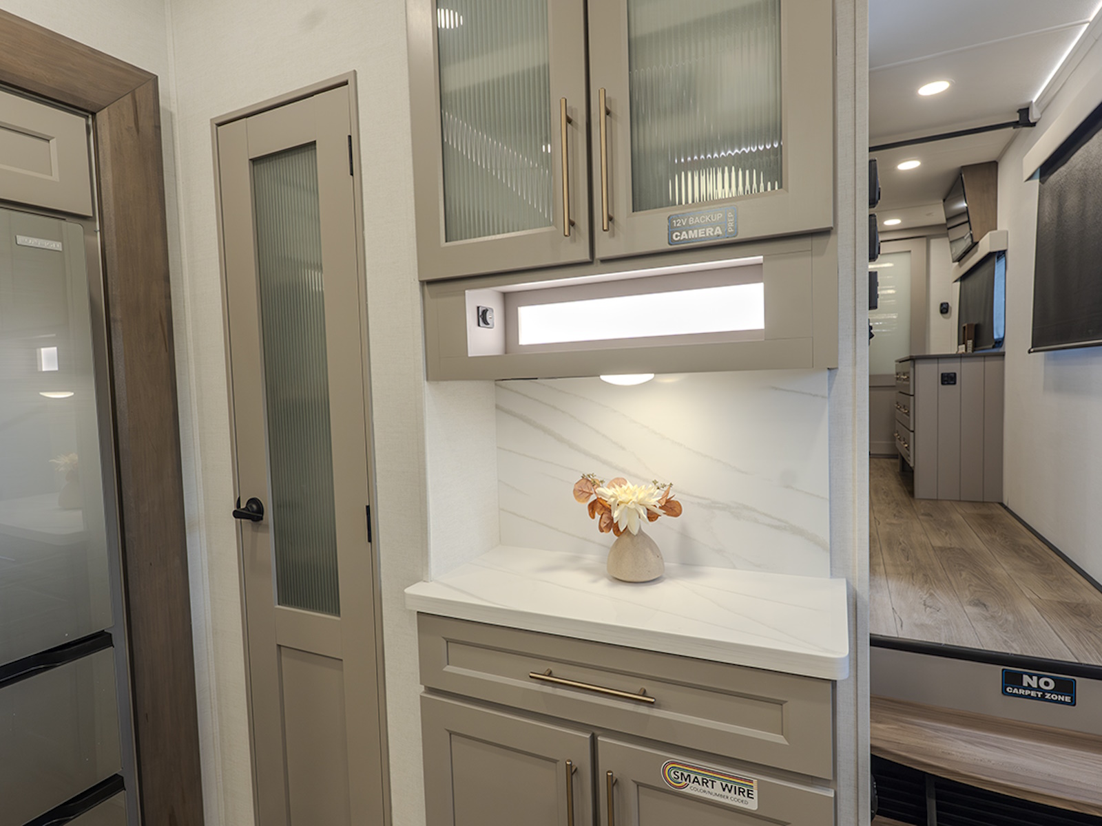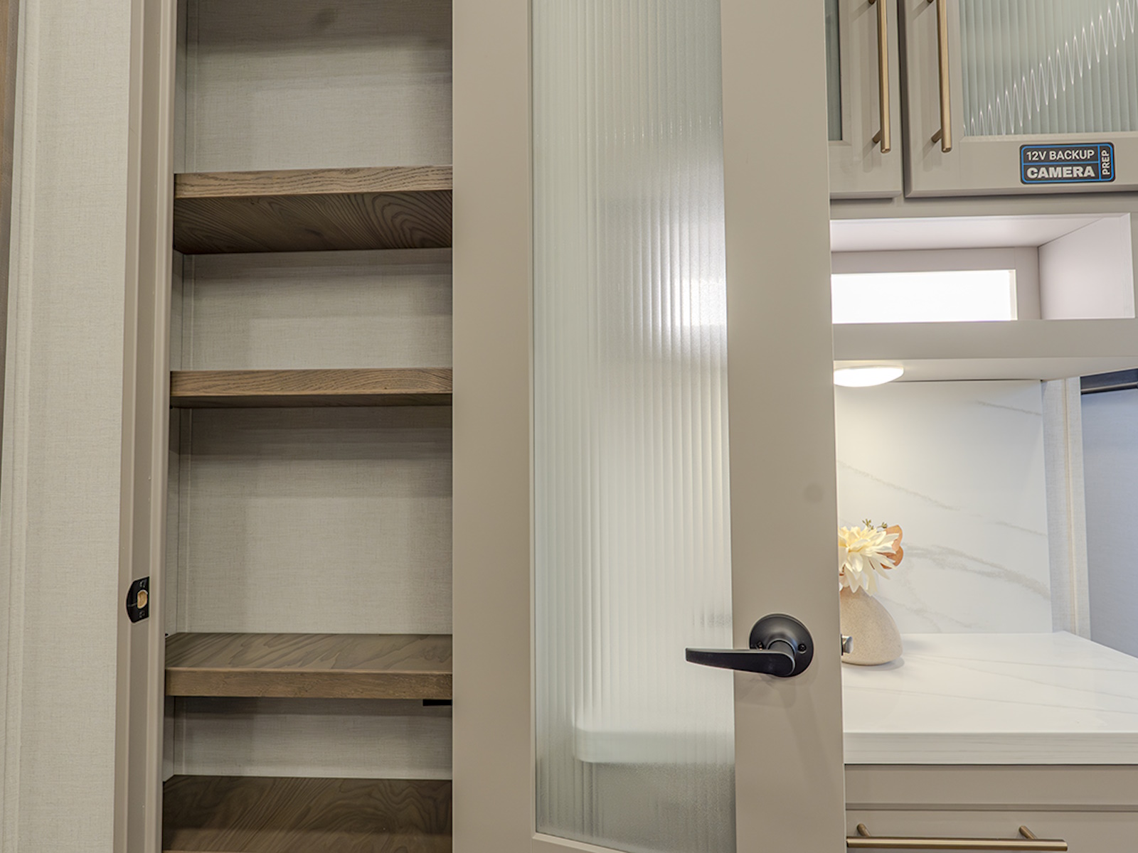 The middle kitchen is well-appointed for preparing meals, featuring a spacious kitchen island with dishwasher prep, plenty of counter space, and ample storage with both a pantry and a hutch. The swivel table and desk offers a convenient space for dining, working, or enjoying a cup of coffee.
