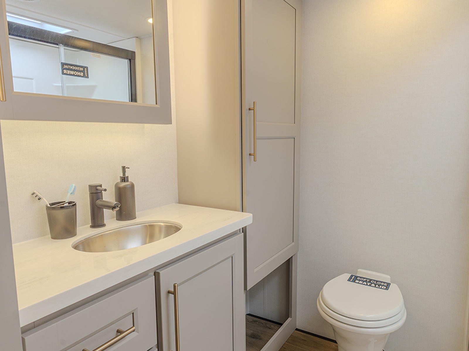 The spacious full bathroom includes a generous 61" x 30" shower, providing all the comfort and convenience of home. When it’s time to retire for the night, the private front bedroom includes a king bed slide-out, offering additional space. A walk-in closet with washer and dryer prep provides ample storage, while the flip-top dresser and Smart TV complete the luxurious bedroom setup. A seat with storage helps keep everything tidy and organized.