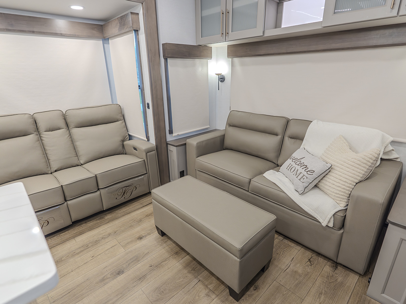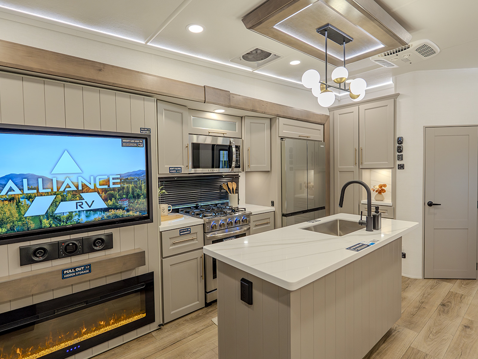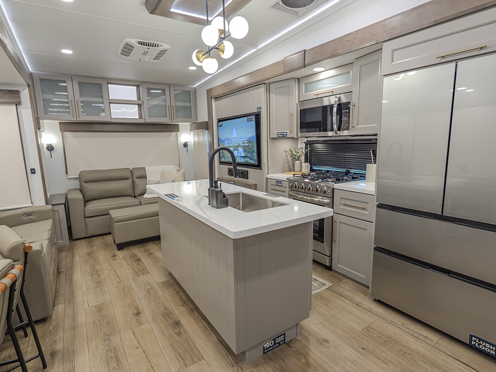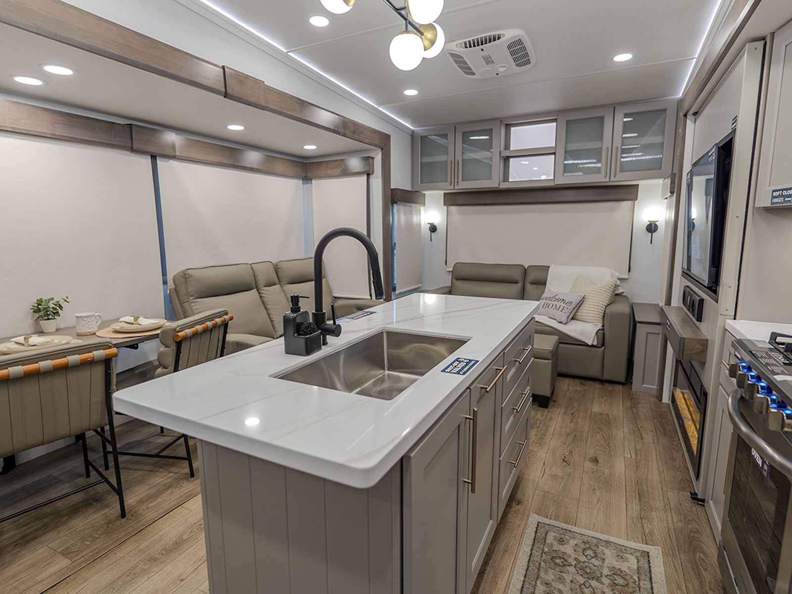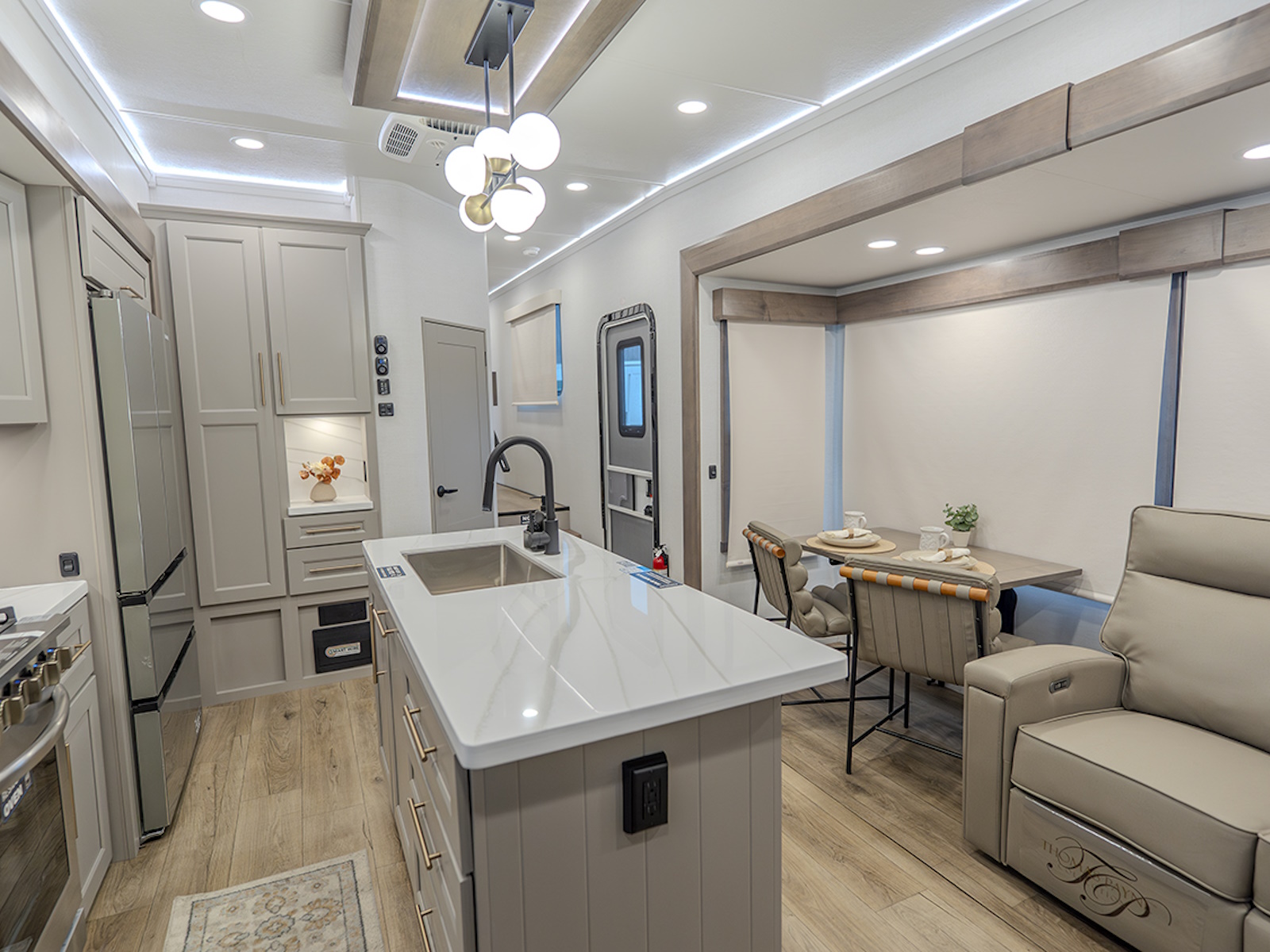 The main living and kitchen area is perfect for cooking, entertaining, and relaxing. It features residential appliances, including a kitchen island with dishwasher prep and a large sink. You’ll also find a pantry for snacks and hidden pantry storage behind the TV for extra convenience. The rear living area includes a dual recliner loveseat and a sleeper sofa along the back wall, offering plenty of seating for relaxation or socializing.