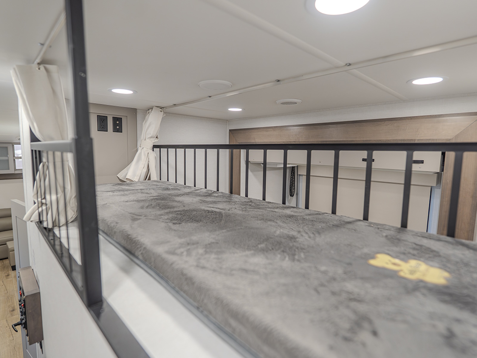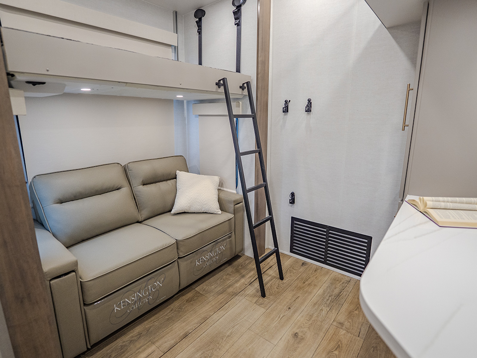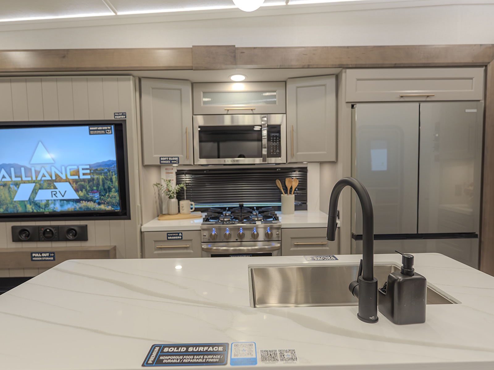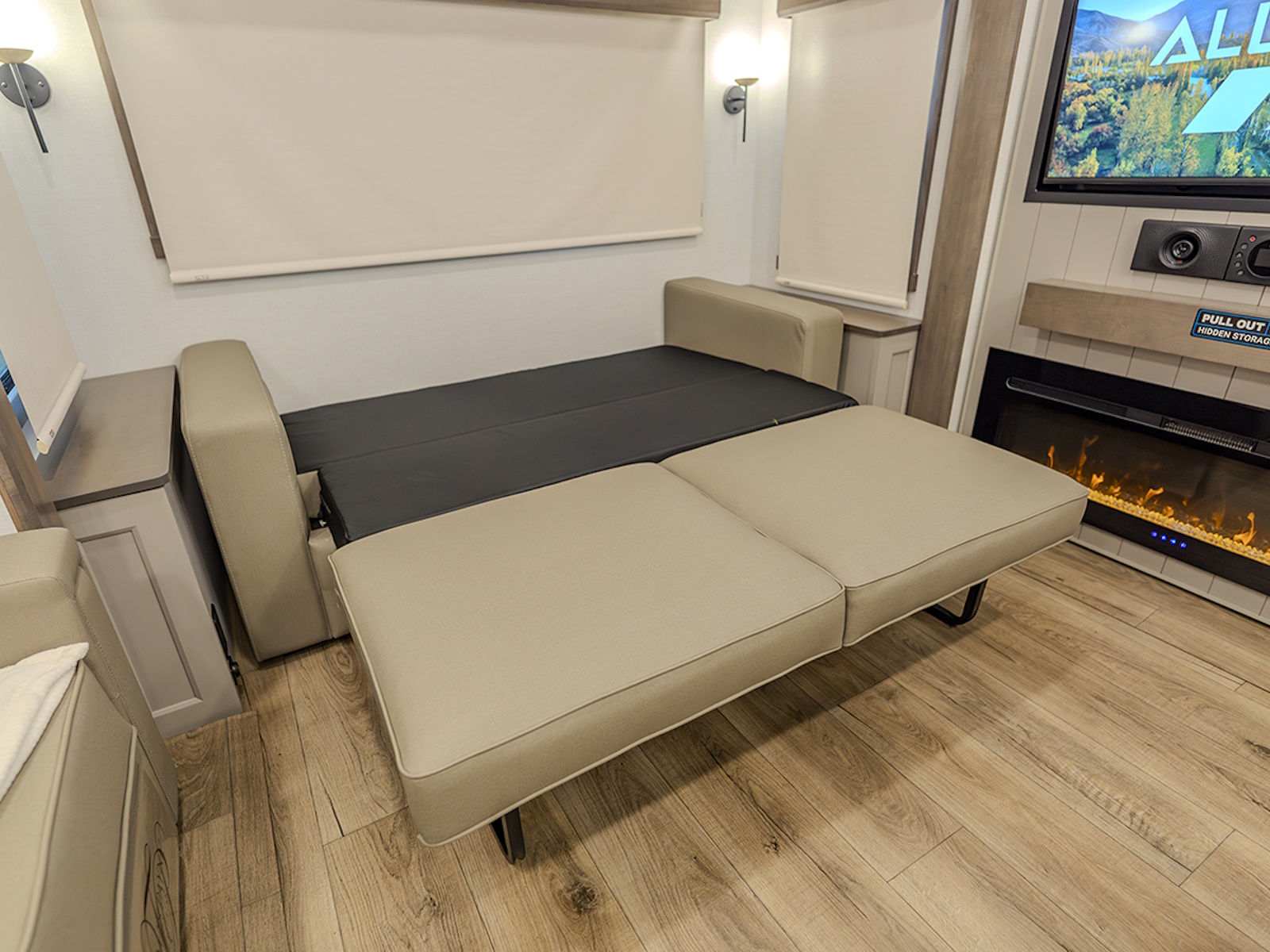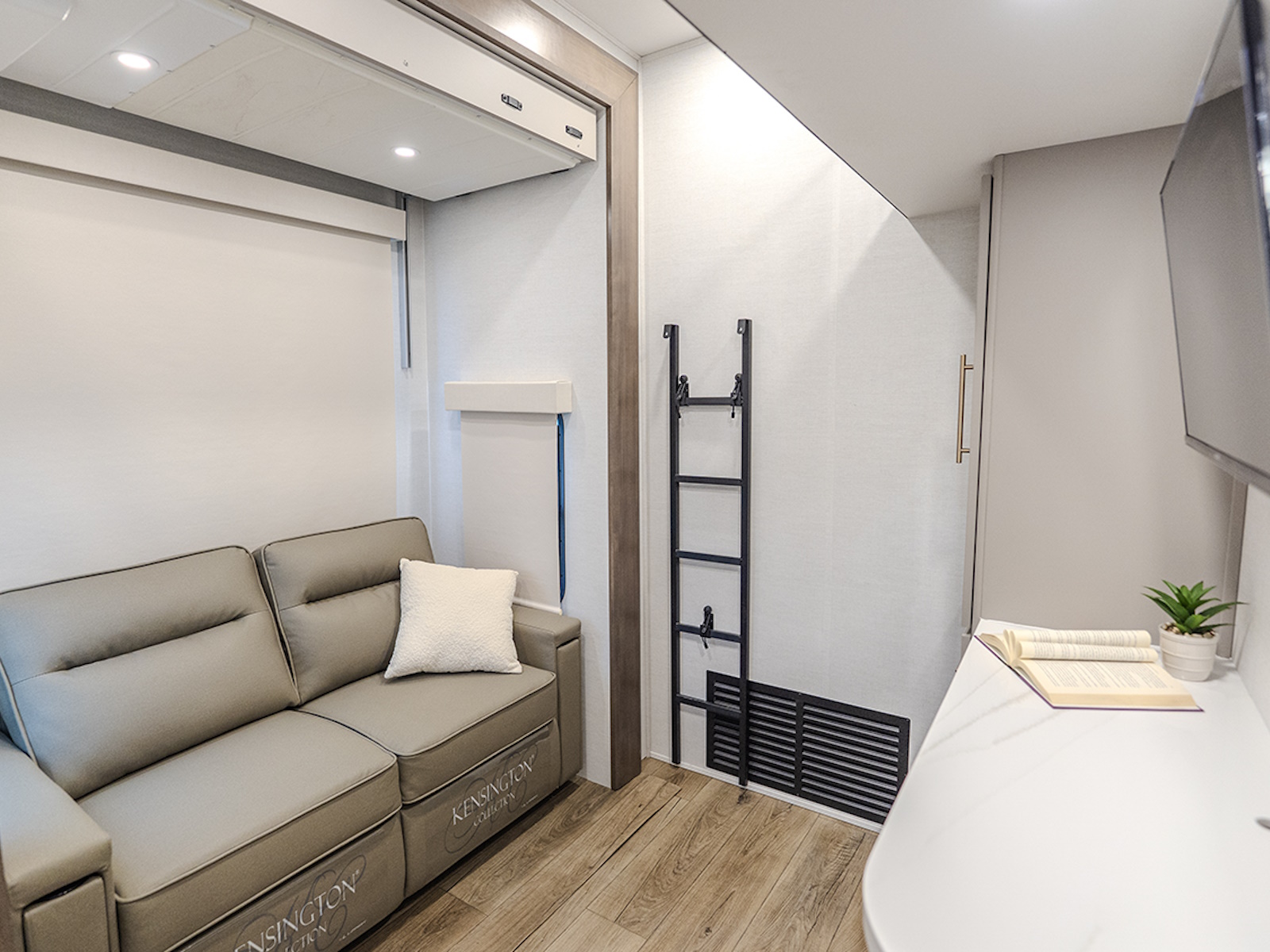 The main living and kitchen area is perfect for cooking, entertaining, and relaxing. It features residential appliances, including a kitchen island with dishwasher prep and a large sink. You’ll also find a pantry for snacks and hidden pantry storage behind the TV for extra convenience. The rear living area includes a dual recliner loveseat and a sleeper sofa along the back wall, offering plenty of seating for relaxation or socializing.