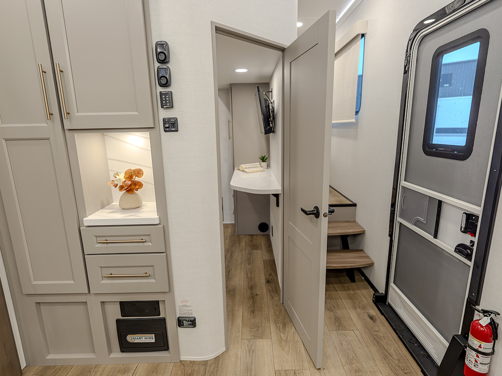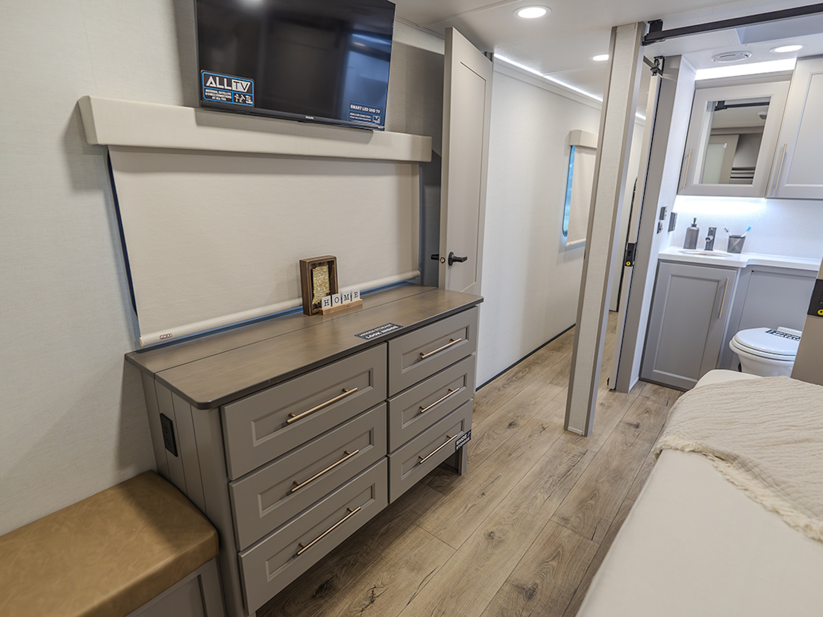 The private master bedroom features a king bed slide-out (with an optional queen bed for more floor space), a large front wardrobe with washer and dryer prep, and a flip-top dresser with a Smart TV above. Double sliding doors lead into the full bathroom, which includes a spacious 48" x 30" shower, toilet, and vanity with sink, and can be accessed from both the hall and the bedroom.