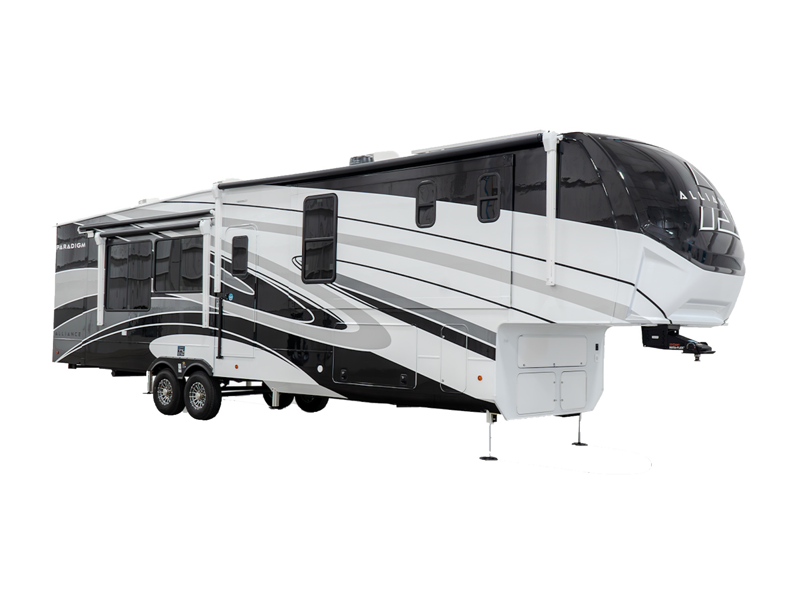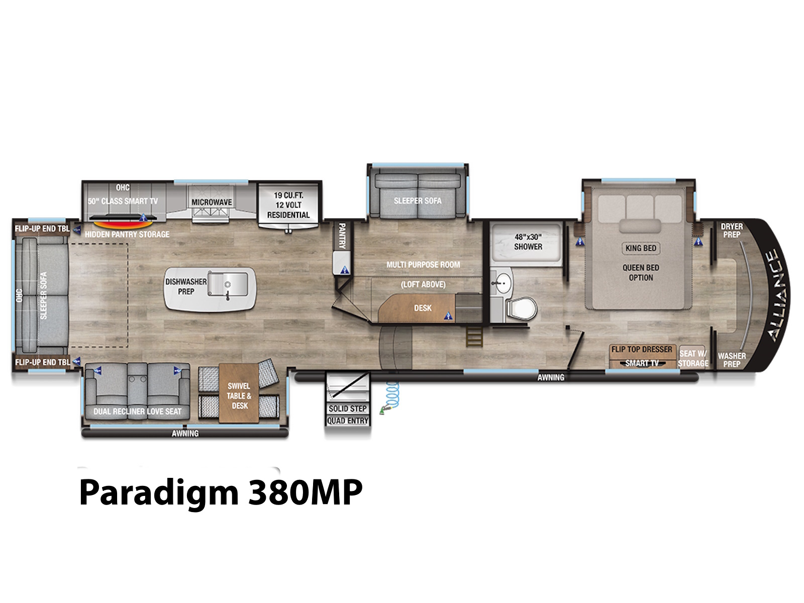 The Alliance RV Paradigm 380MP is designed for versatility, comfort, and luxury, making it the perfect fifth wheel for full-time living, remote work, or extended travel. Whether you need a dedicated work space or a guest room, this fifth wheel offers the ideal solution with its multi-purpose room in the center. This flexible space includes a sleeper sofa slide, a desk, and even a loft above, accessed via a ladder, providing extra sleeping or storage options.