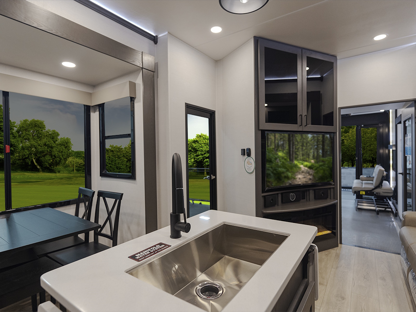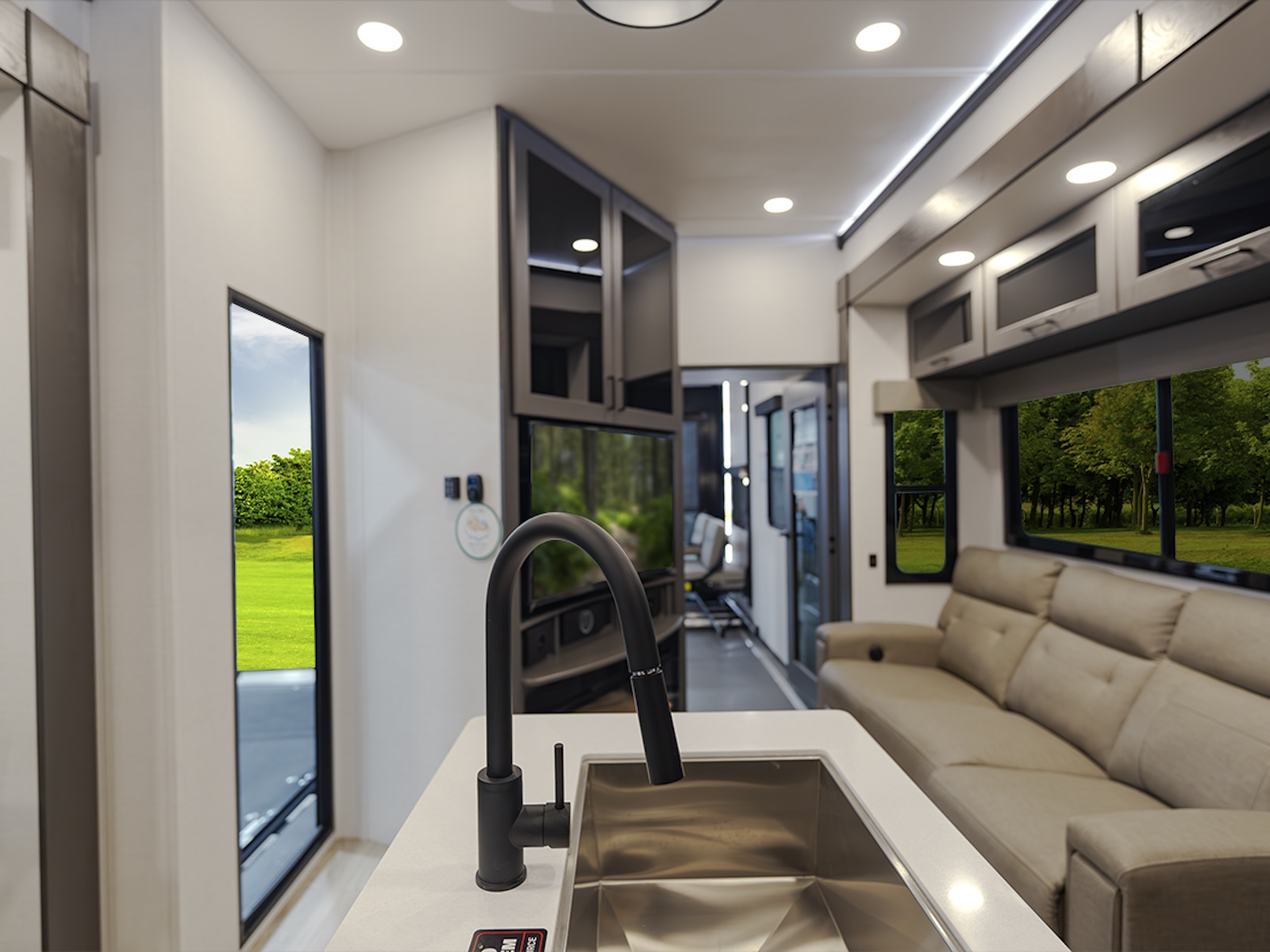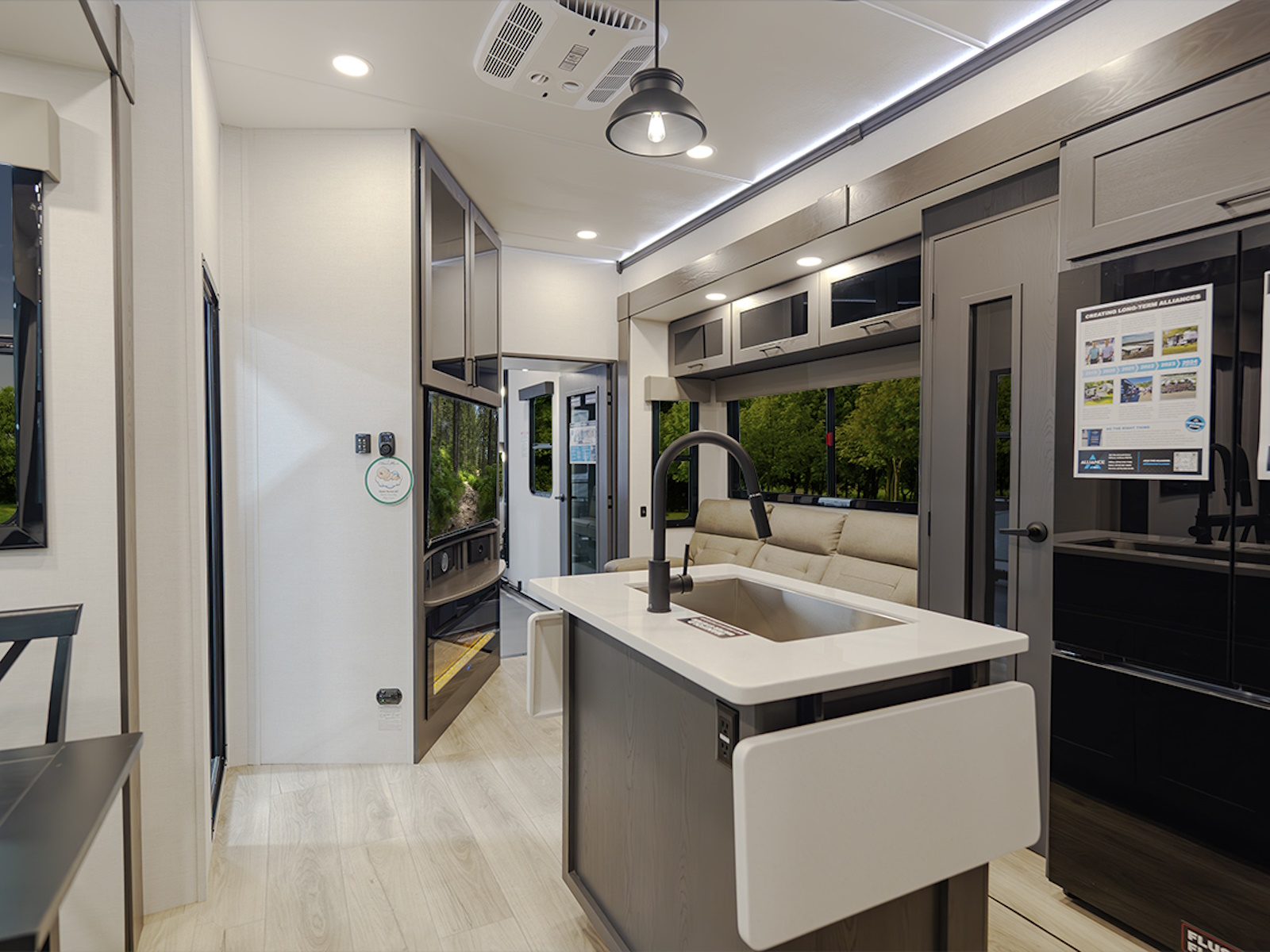 Inside, enjoy hardwood cabinetry, solid surface countertops, and commercial-grade vinyl flooring—easy to clean and perfect for rugged use. The Valor 42V14 also features 12V charging stations and a stainless steel refrigerator, making it easier than ever to stay powered and comfortable on your adventures.