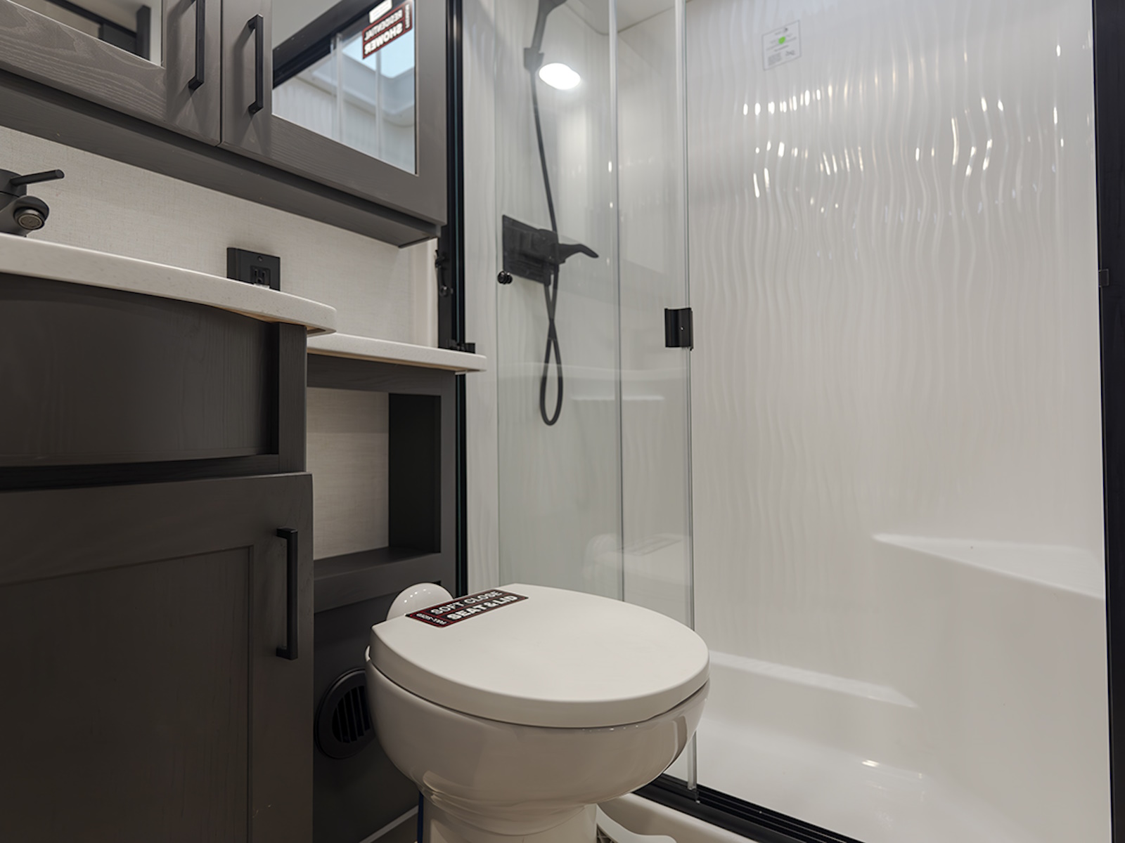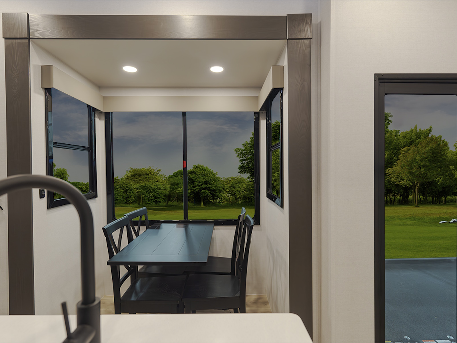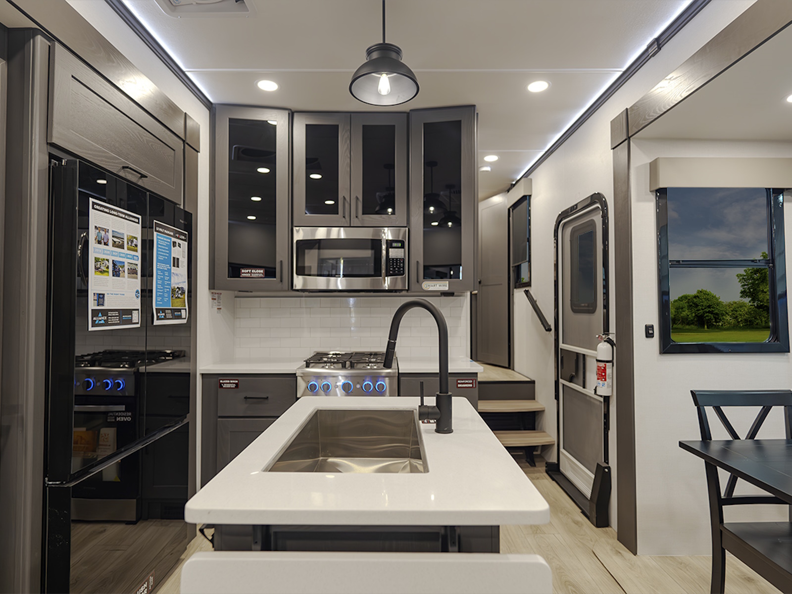Inside, enjoy hardwood cabinetry, solid surface countertops, and commercial-grade vinyl flooring—easy to clean and perfect for rugged use. The Valor 42V14 also features 12V charging stations and a stainless steel refrigerator, making it easier than ever to stay powered and comfortable on your adventures.