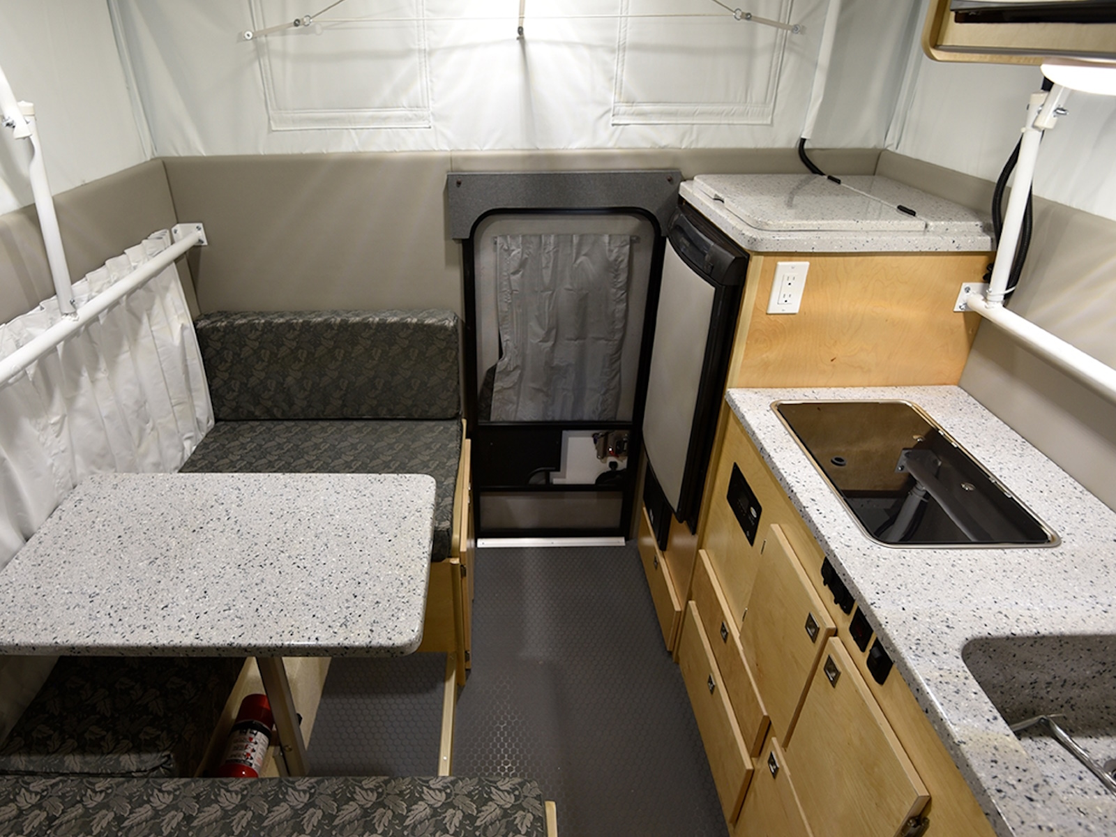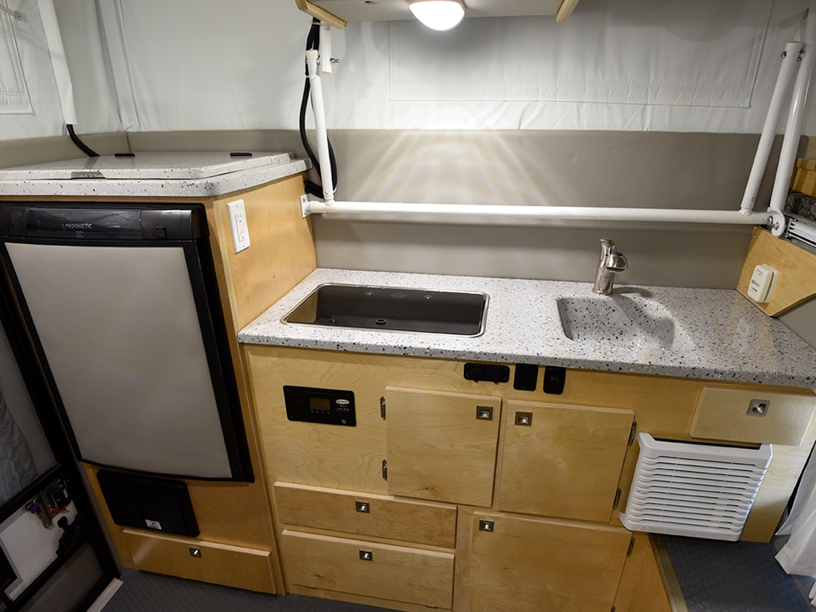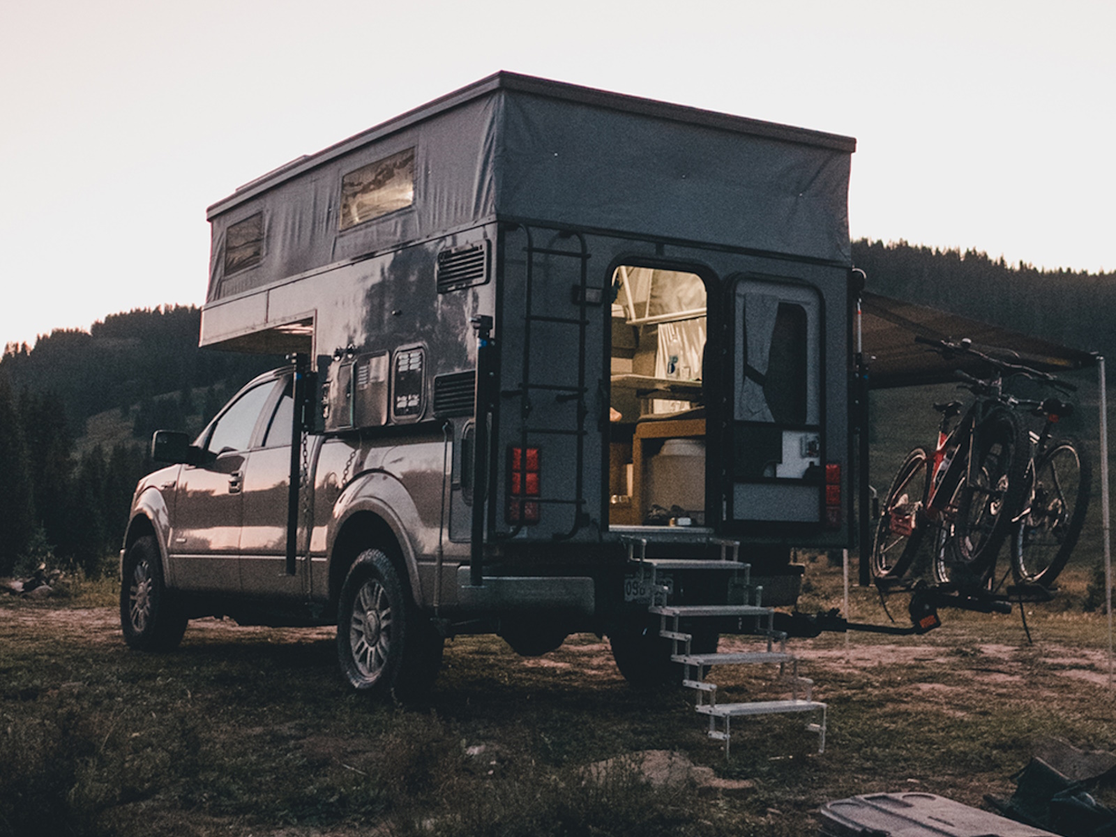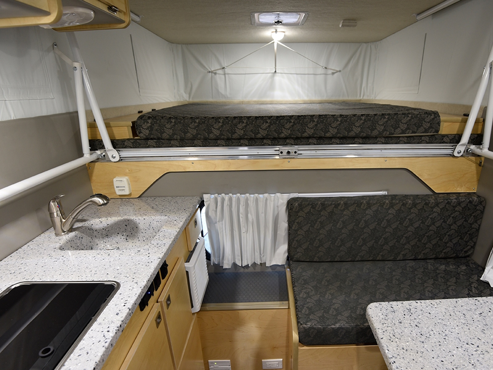 Designed for truck beds with an interior length less than eight feet, the Caribou Lite 6.5 slide-in truck camper is our lightest weight, lowest profile, and most economical camper. It features a fully welded aluminum roof and frame with vacuum bonded composite walls, torsion assisted roof lift system, and insulated Weblon softwall and a whole host of other standard features including a 2.0 cu. ft. compressor refrigerator, 2-burner cooktop, 16K BTU furnace, full size cabover bed that pulls out to a queen, power roof vent system, 200 Watt Solar Suitcase, and more. The perfect choice for ½ ton or even mid-sized pickups.
