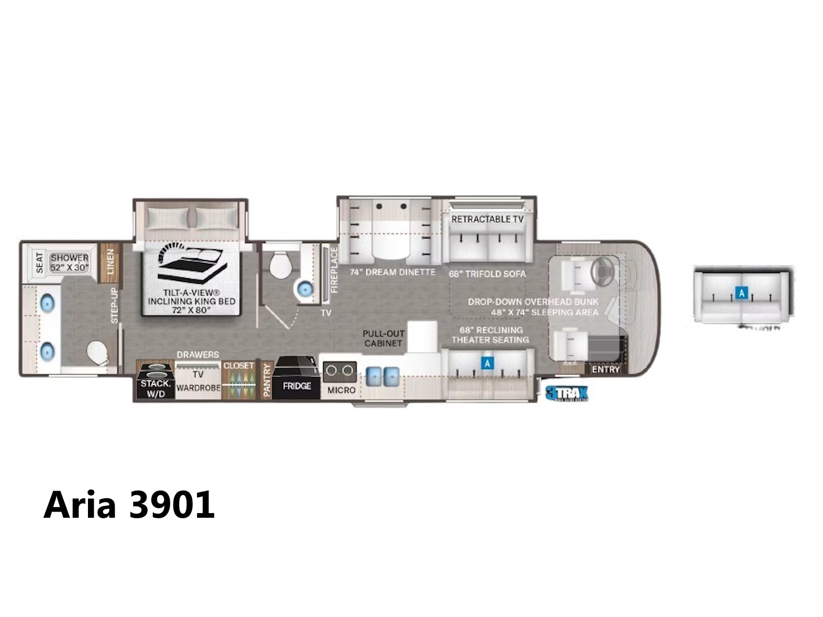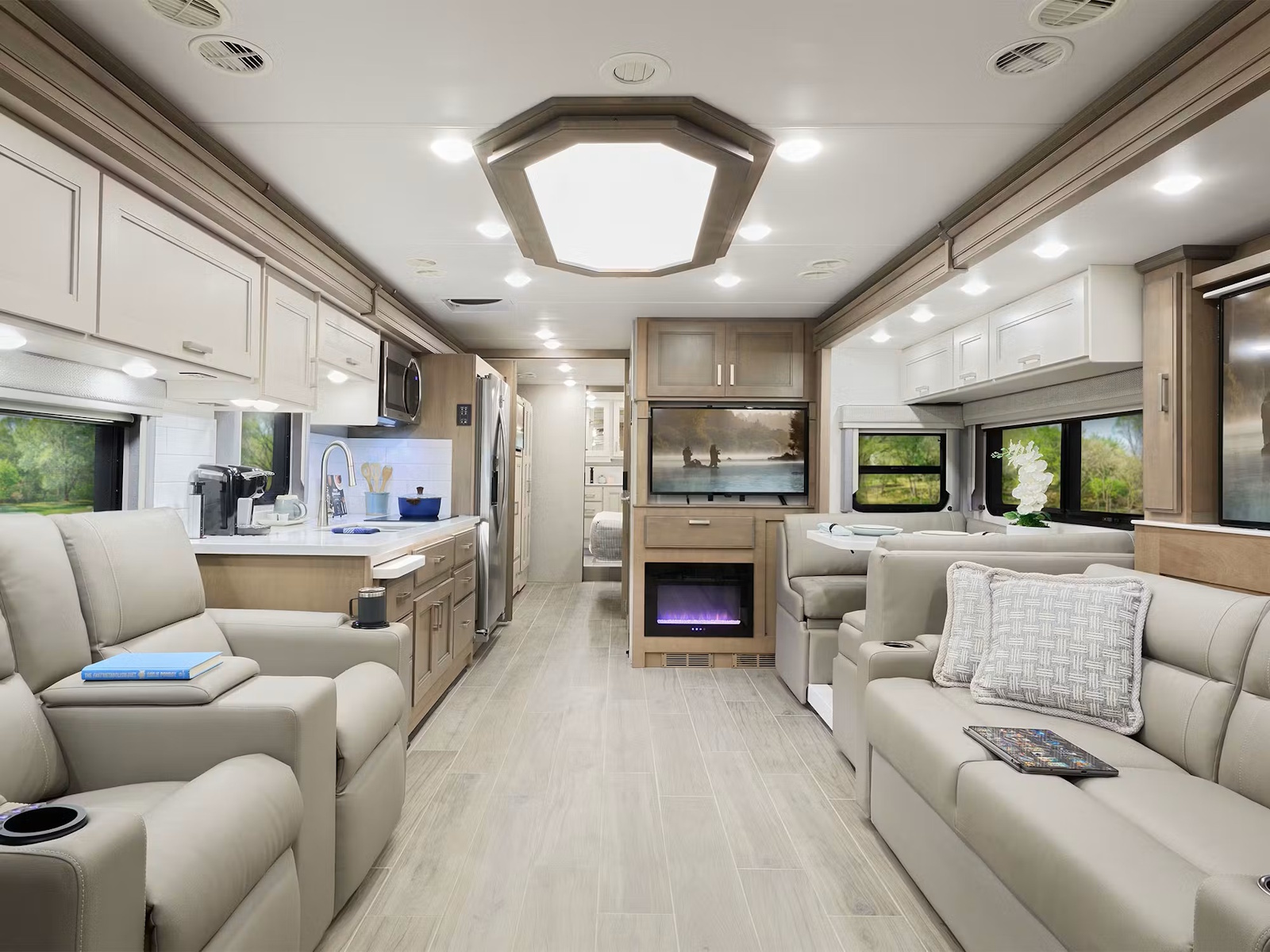 - Create the perfect space for special family moments in this RV. Every Aria motorhome has a spacious Dream Dinette® booth, perfect for enjoying your favorite meals with loved ones. Some models also feature plush theater seating or large sofa beds, so you can relax in style after a long day of exploring. Aria boasts a luxurious ambiance with LED lighting illuminating the polished porcelain tile. There’s also a cozy electric fireplace to entertain guests on the 3901 floor plan.