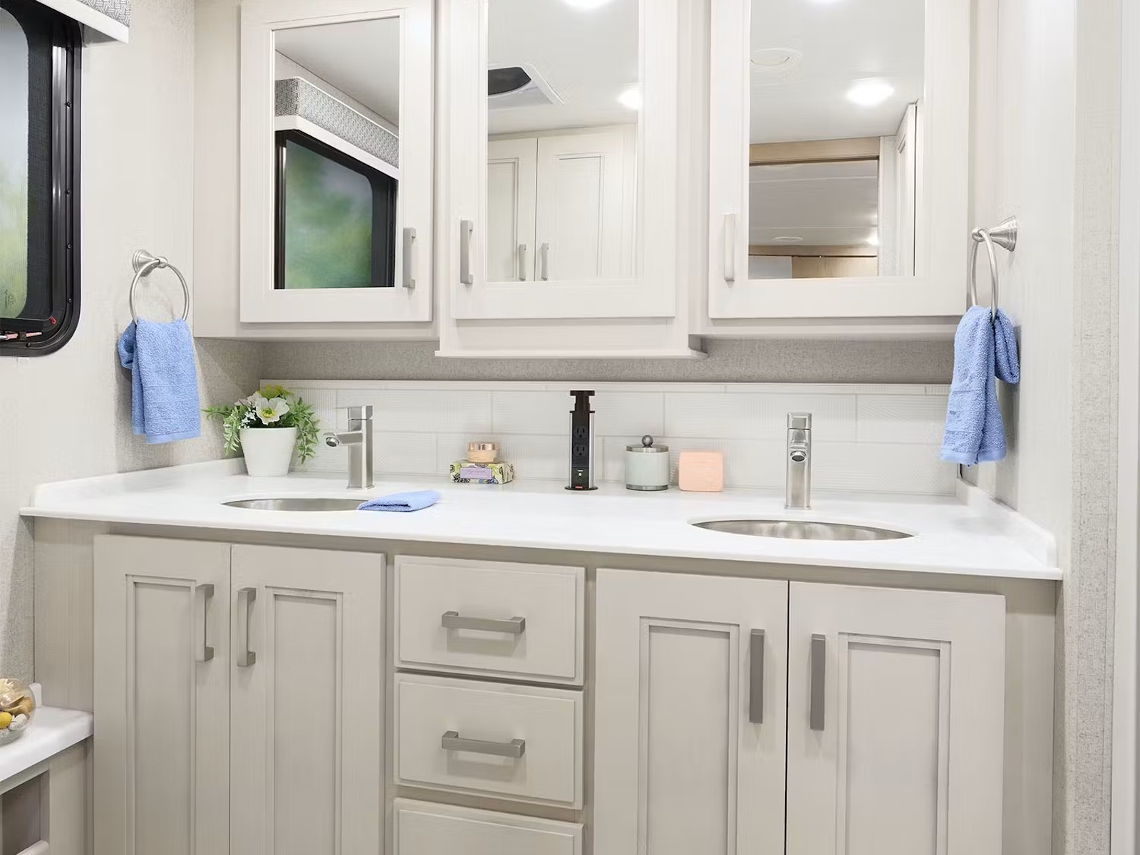 - Enjoy a restful night’s sleep in Aria’s bedroom with a plush King-size Tilt-A-View® bed that adjusts to the perfect angle for watching TV or reading a book. Plus, with USB ports in the nightstands, you can quickly charge your devices while you rest. The large wardrobes in the bedroom offer plenty of space for all your clothes, making it perfect for full-time living. With a stackable washer and dryer in every model, you won’t have to worry about finding a laundromat on the road.