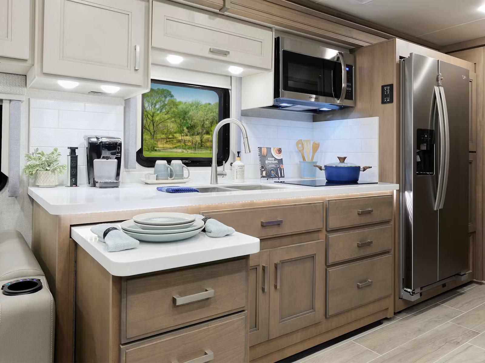 - This luxurious diesel pusher kitchen feels just like home, with everything you need to create delicious meals on the go. The expansive solid surface countertops provide ample space for meal prep. At the same time, the residential refrigerator keeps your ingredients fresh and chilled. Clean-up is also easy, thanks to the large double bowl sink with a convenient pull-down sprayer. Cook your favorite dishes perfectly with the electric induction cooktop and convection microwave oven.