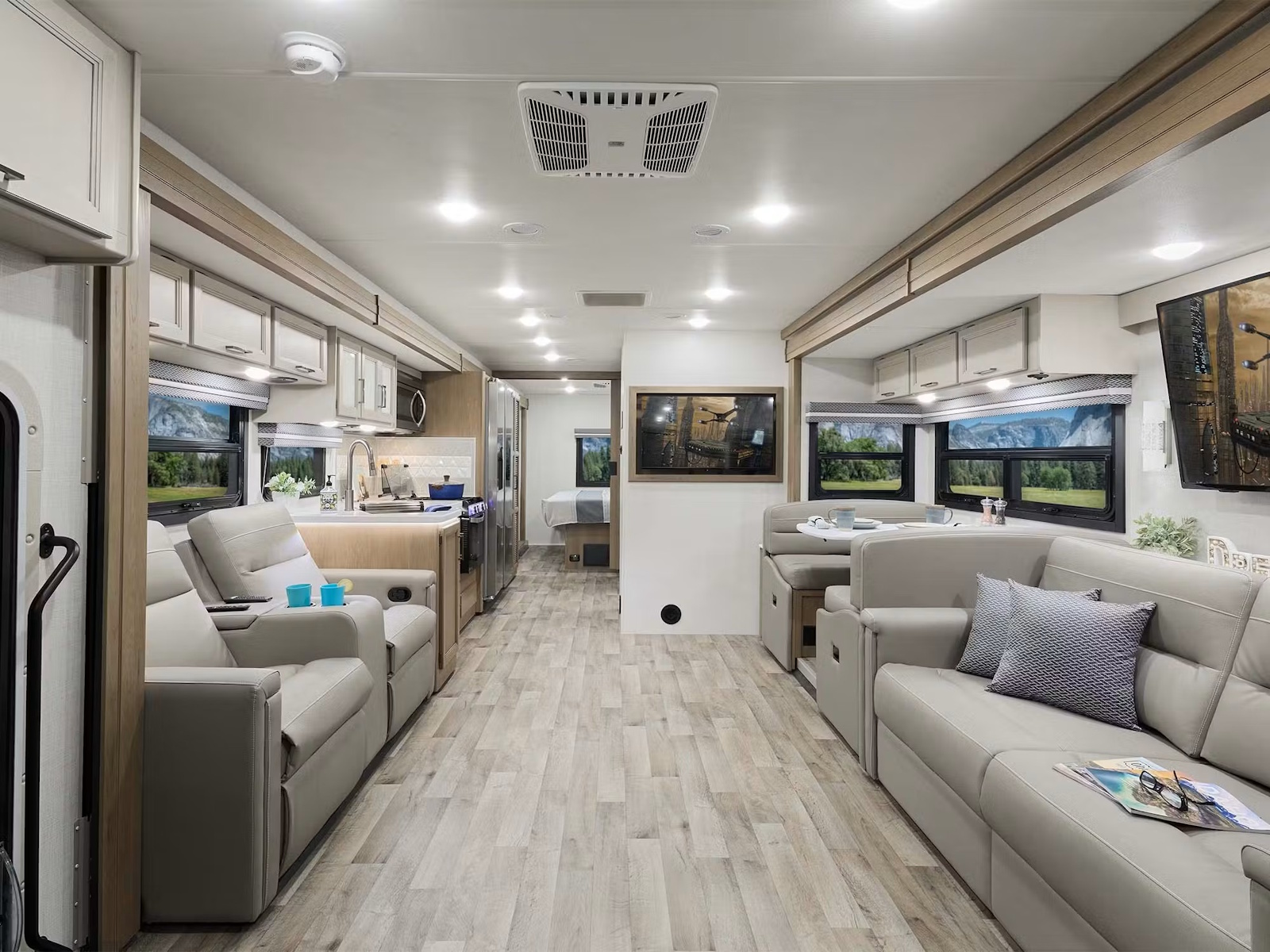 - Whether traveling as a large family or hosting guests, the Hurricane® is built for gatherings. With flexible seating throughout, there's always room to relax in this Class A RV. Every floor plan includes a Dream Dinette® and a leatherette sofa bed, great for daytime lounging and converting into extra sleeping space at night. For added comfort, the 35R model comes with theater seating and integrated footrests, while the 29L offers this setup as an option. Thanks to the 35G’s cozy electric fireplace, you can keep warm on chilly nights at the campsite.