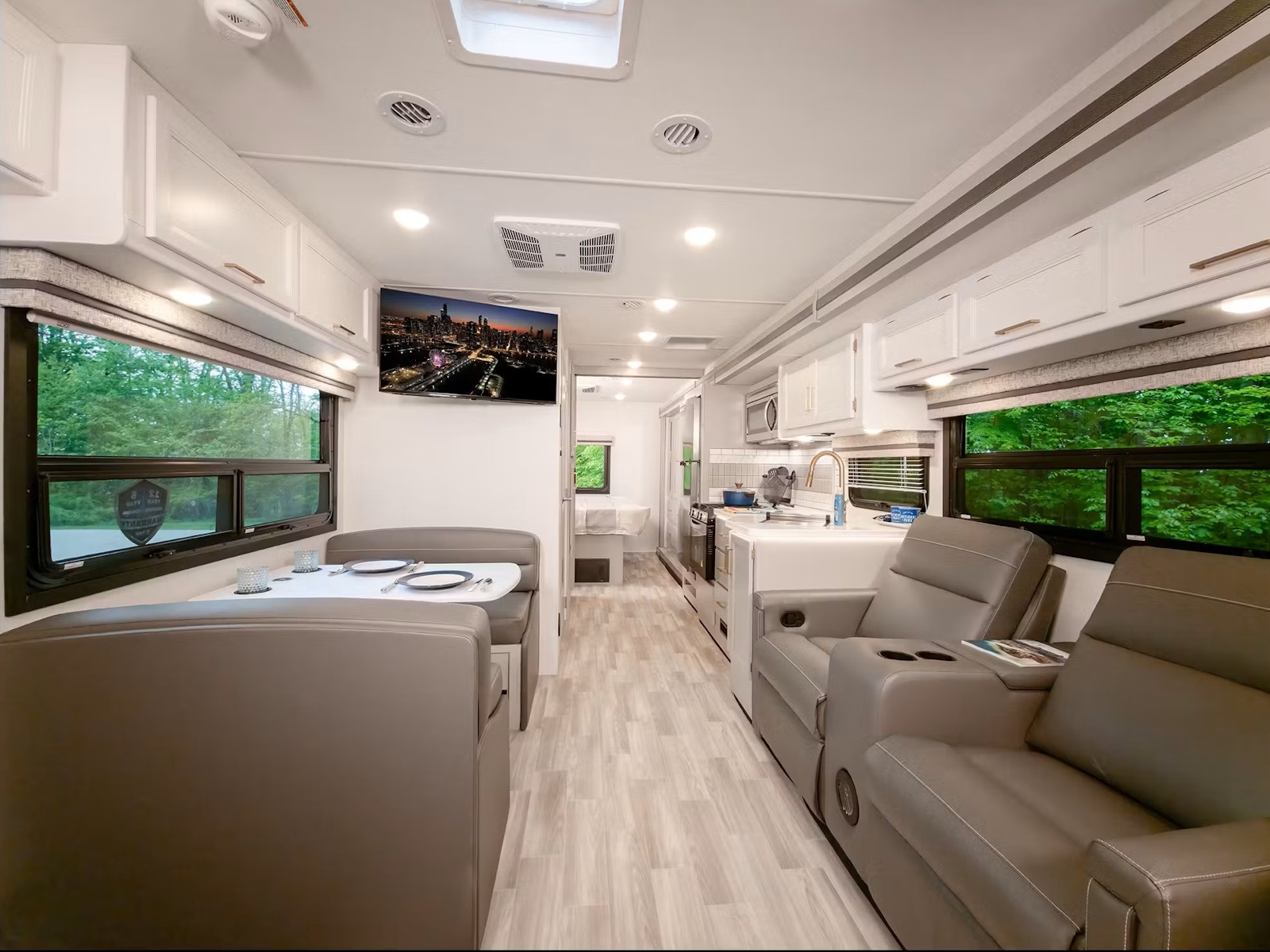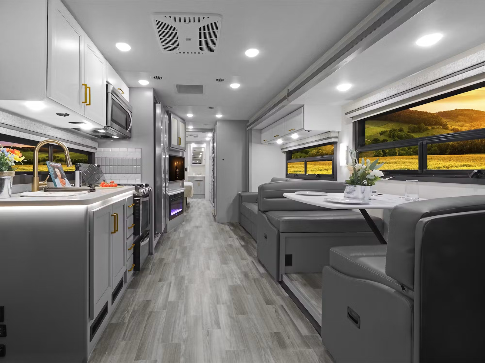 - If you have a big family or love to host, the Windsport® is the perfect RV! With various seating arrangements onboard, you’ll never have to worry about running out of space for your guests. Every model has a Dream Dinette® booth and leatherette sofa bed that can be used as comfortable seating during the day and an additional sleeping area at night. The 35R floor plan also has theater seating with integrated footrests, while the 29L offers this setup as an option. The 35G layout even has an electric fireplace for chilly nights at the campsite.