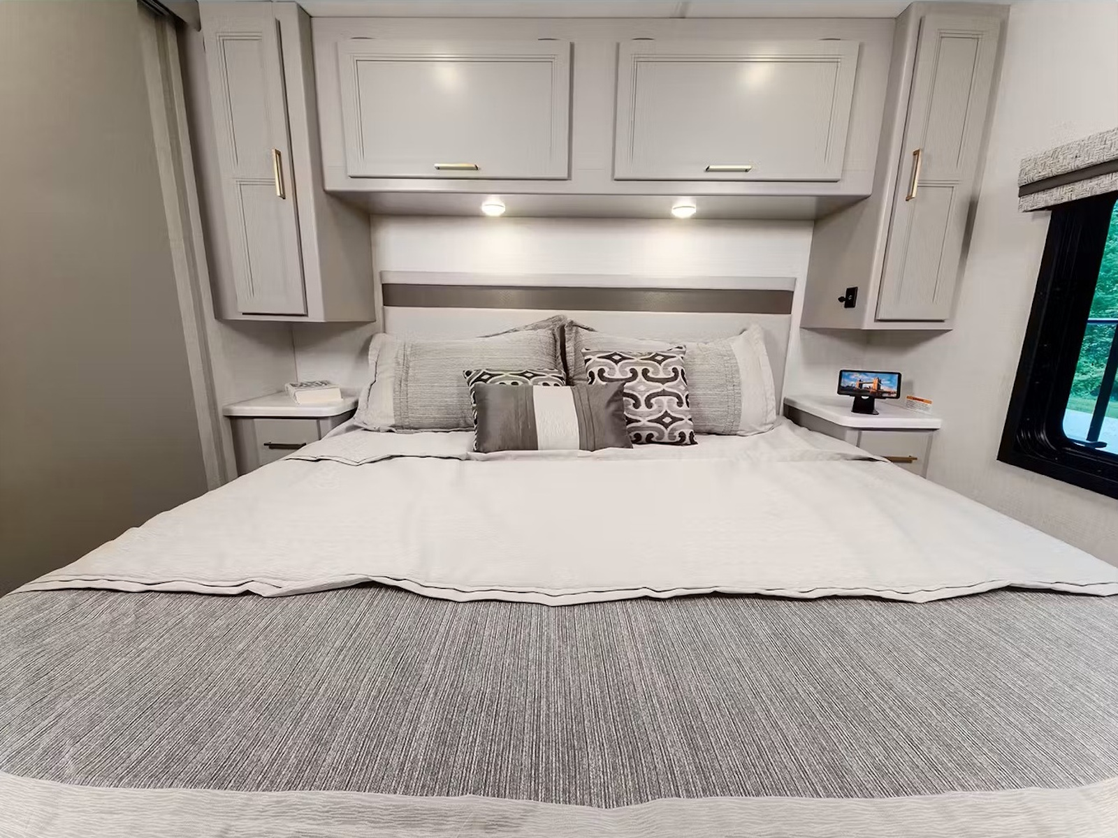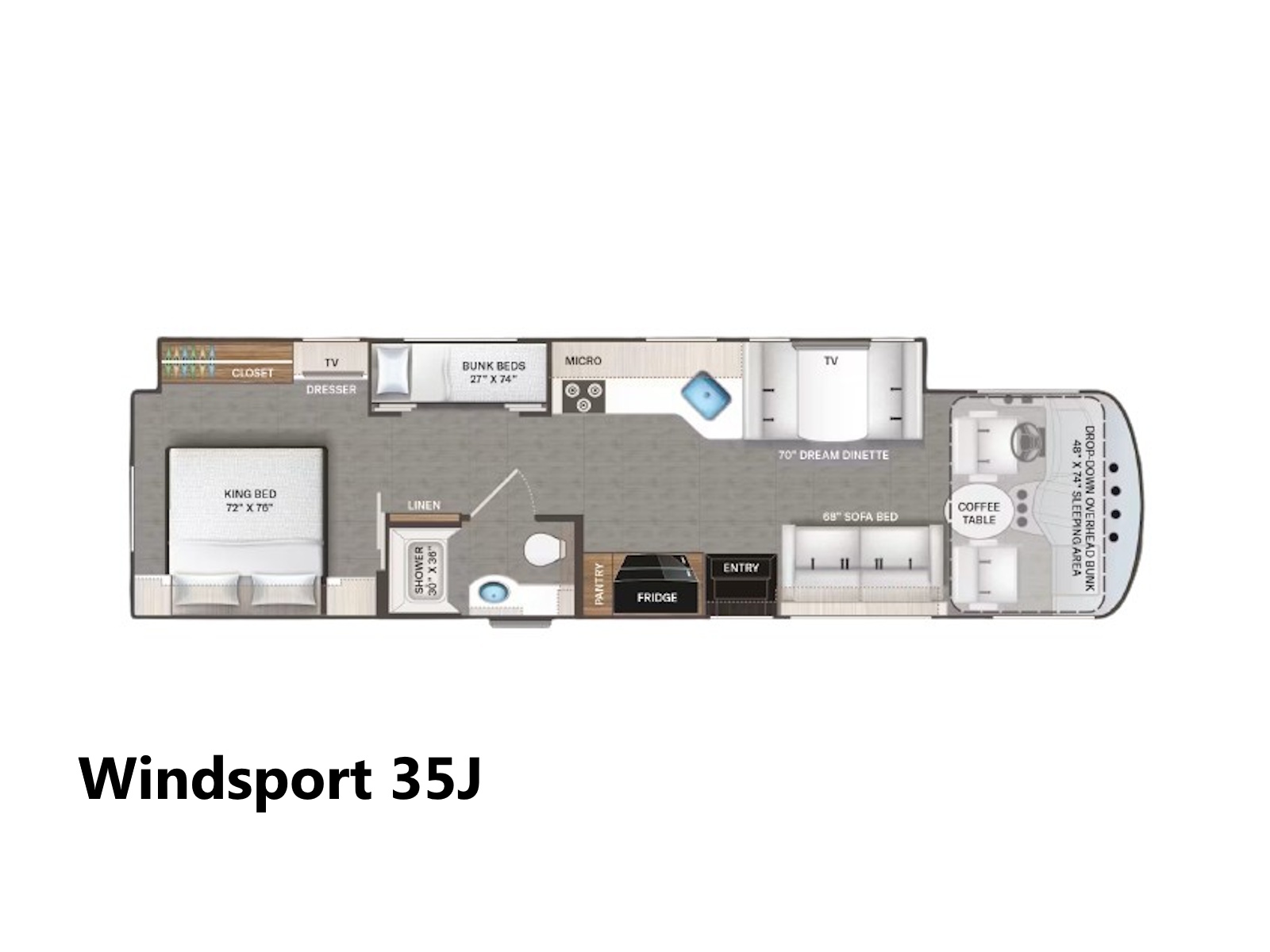 - When it’s time to wind down, the Windsport® is the perfect place to relax and recharge. With a luxurious King-size bed in every model featuring a designer headboard, bedspread, and pillow shams, you’ll feel like you’re sleeping in a five-star hotel every night. If you’re traveling as a large family or with guests, use the power drop-down overhead bunk with a Cotton Cloud™ mattress and a bunk ladder. The 35J floor plan also has bunk beds, which little ones will especially love.