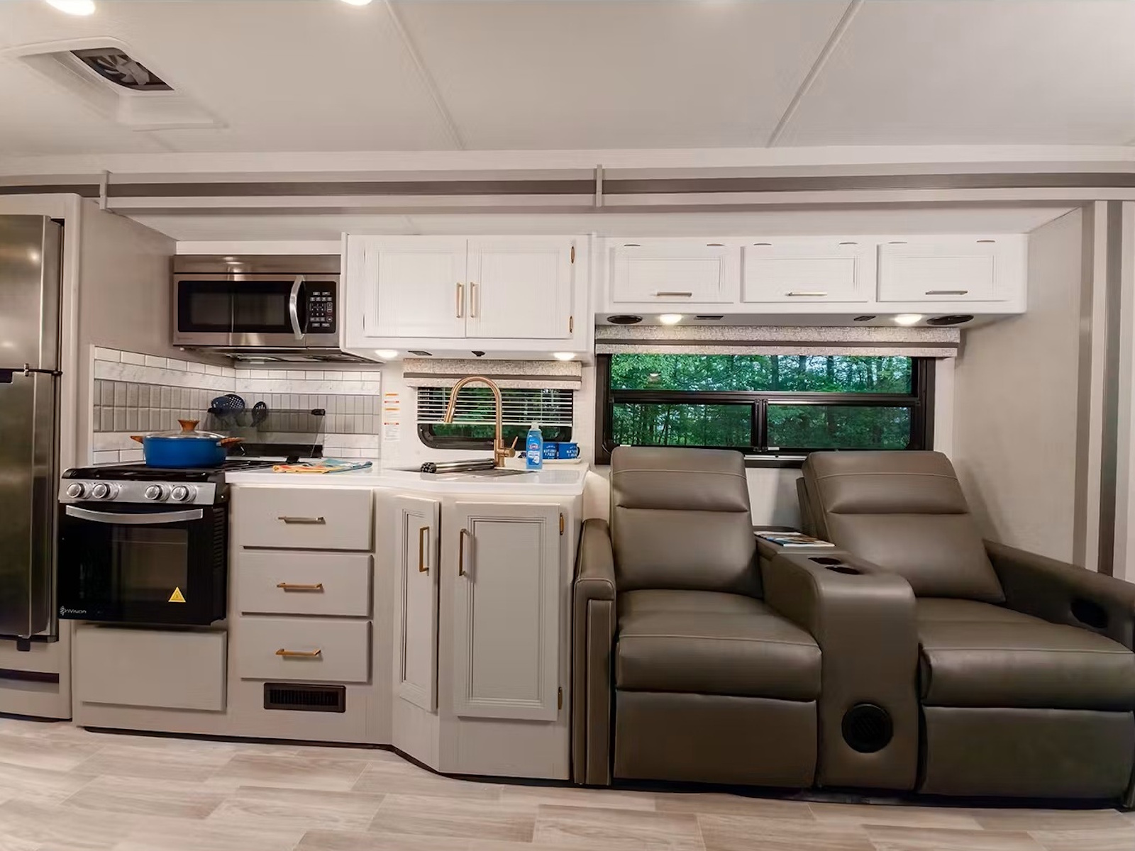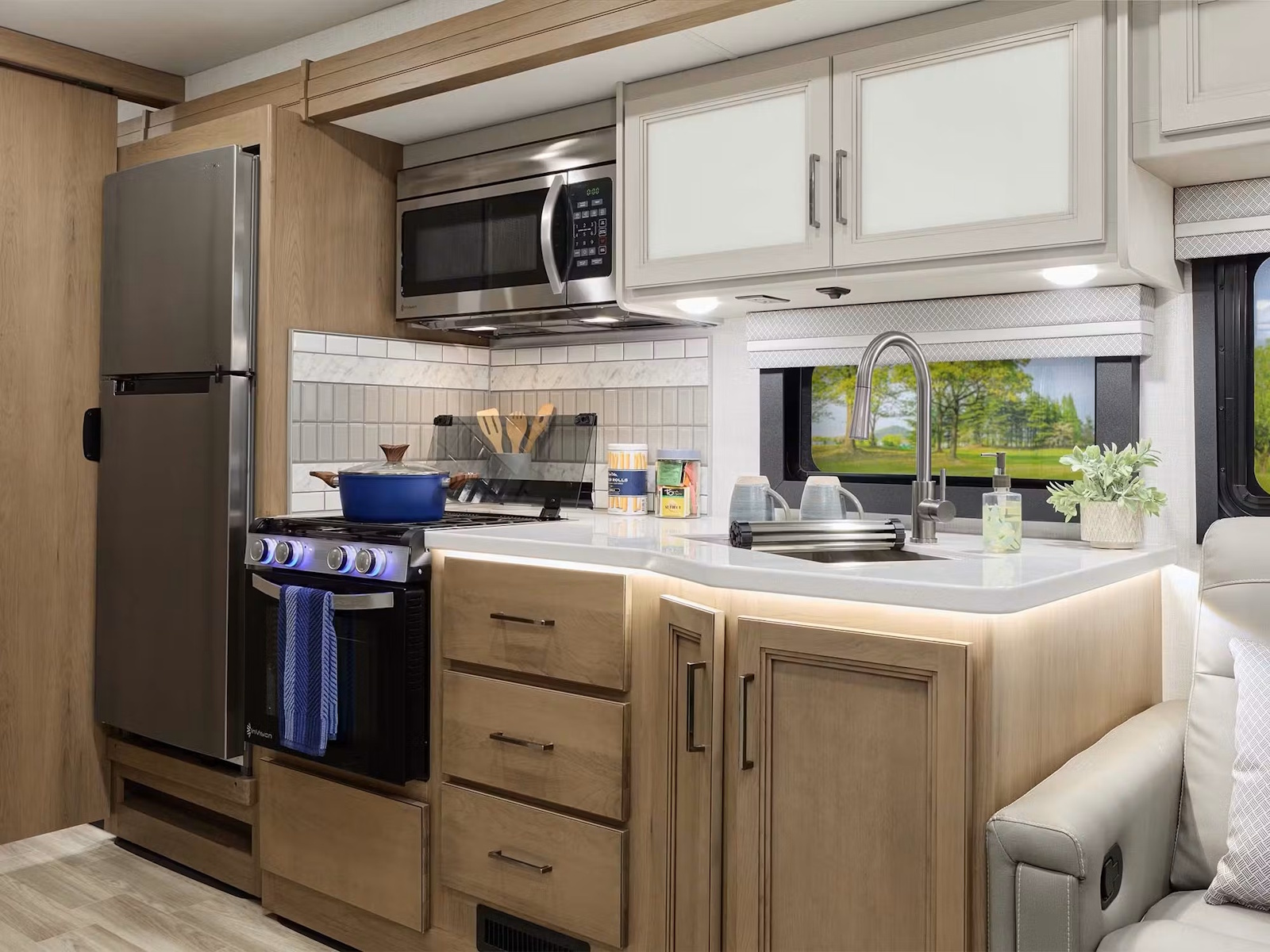 - Whether whipping up a camping feast or a quick snack, the Windsport® has everything you need to make meals on the go. Keep your ingredients fresh in the large refrigerator with plenty of space for groceries. When it’s time to get cooking, you’ll love the convenience of the three-burner gas cooktop/oven and over-the-range microwave oven. Wash dishes easily thanks to the large stainless-steel single-bowl sink with a pull-down sprayer and roll-up stainless-steel sink cover.