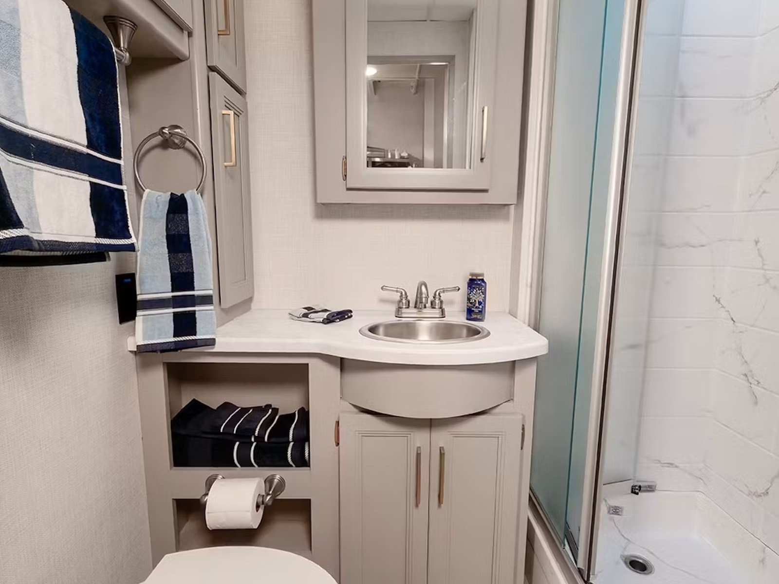- Whether whipping up a camping feast or a quick snack, the Windsport® has everything you need to make meals on the go. Keep your ingredients fresh in the large refrigerator with plenty of space for groceries. When it’s time to get cooking, you’ll love the convenience of the three-burner gas cooktop/oven and over-the-range microwave oven. Wash dishes easily thanks to the large stainless-steel single-bowl sink with a pull-down sprayer and roll-up stainless-steel sink cover.