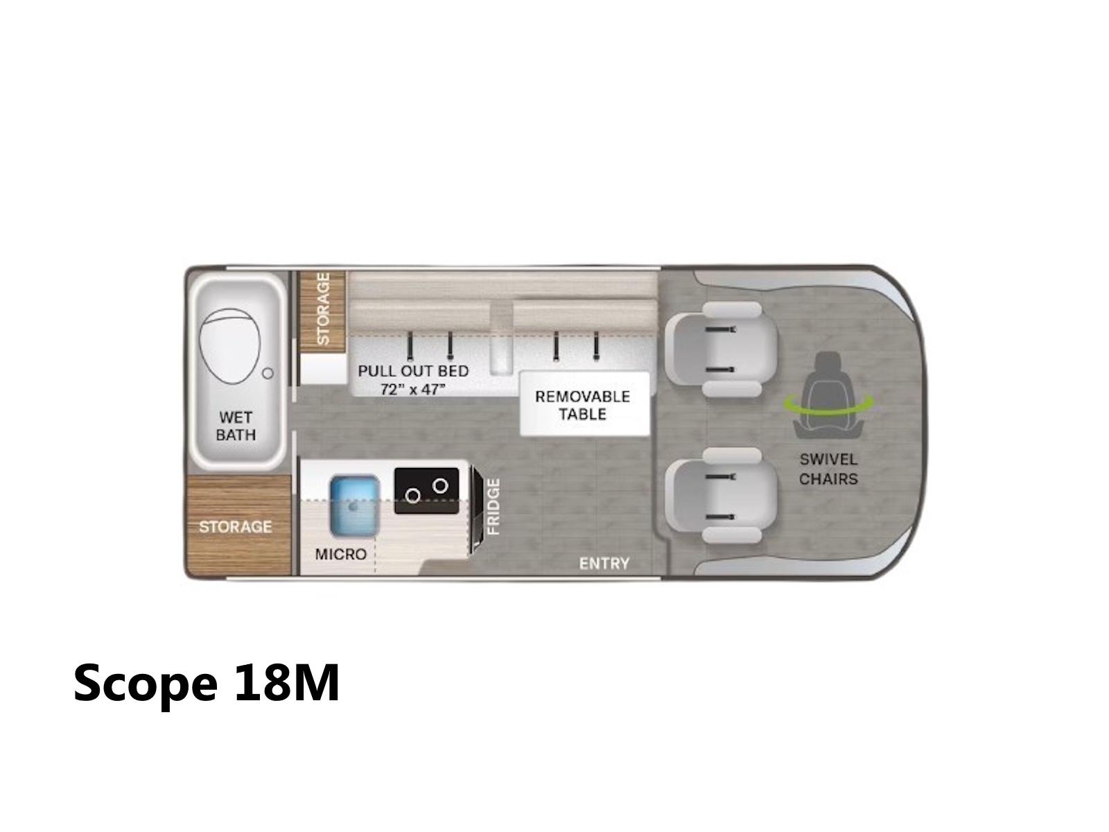 The Scope® is the perfect vehicle for first-time RVers or seasoned adventurers who want a smaller setup without giving up comfort. Its compact size and clever design make navigating city streets and scenic byways a breeze while offering the essentials for life on the road. Easy to drive and even easier to park, this camper van is built for spontaneous getaways, quick stops, and freedom wherever your journey leads.