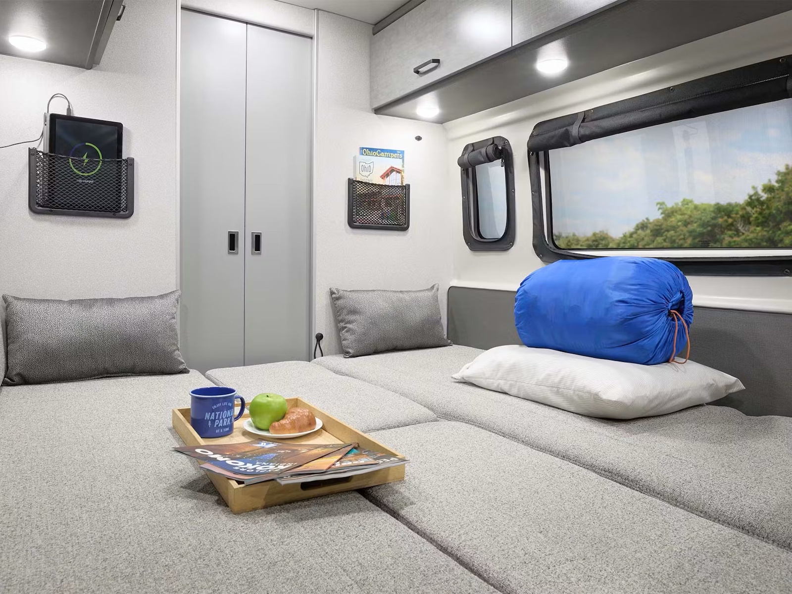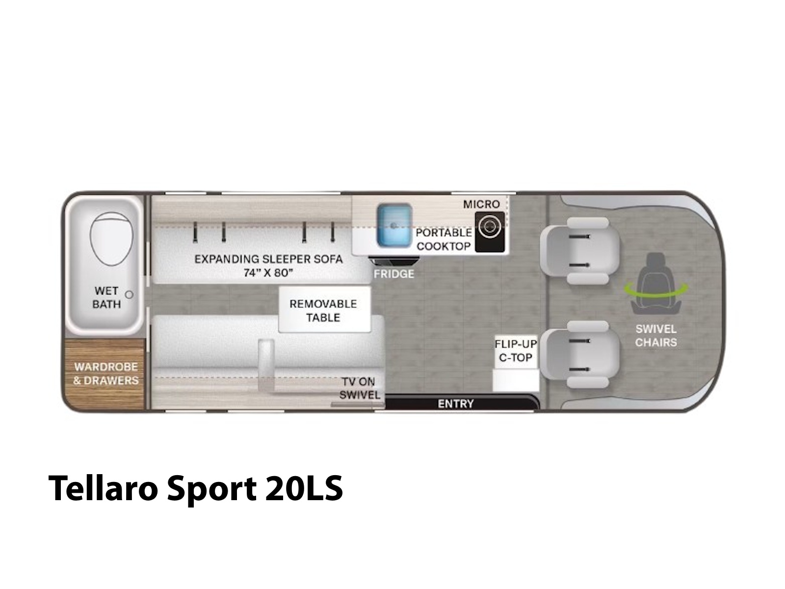 - After a full day of hiking, rest easy in the Tellaro® camper van. The 20Y and 20YS floor plans feature a rear pull-out sofa bed, perfect for kicking back and recharging. If you need more flexibility, the 20L, 20U, 20LS, and 20US models include twin beds with plush memory foam cushions that seamlessly convert into a roomy King-size bed. Add the optional retractable roof top with a Sky Bunk™ sleeping area to the 20L, 20U, 20LS, or 20US layouts for even more sleeping space or extra gear storage.