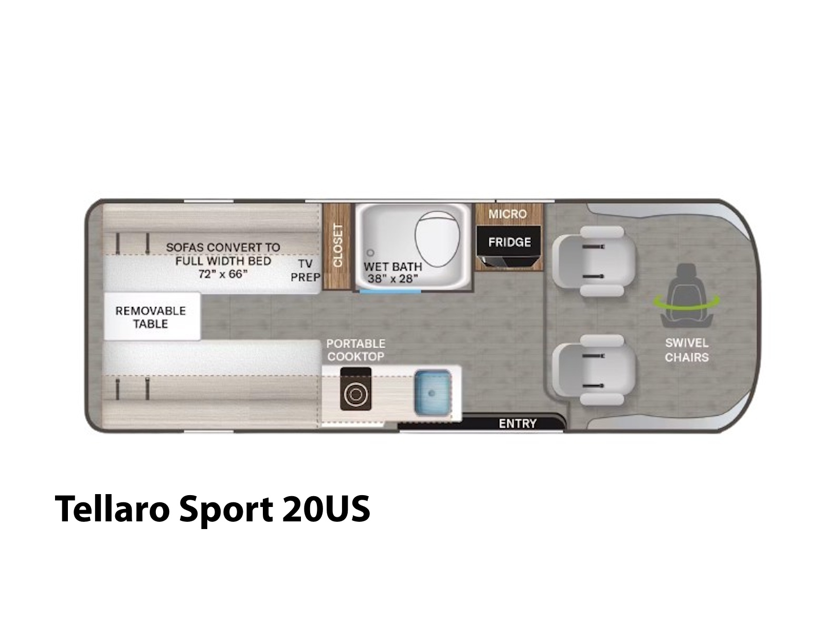 - After a full day of hiking, rest easy in the Tellaro® camper van. The 20Y and 20YS floor plans feature a rear pull-out sofa bed, perfect for kicking back and recharging. If you need more flexibility, the 20L, 20U, 20LS, and 20US models include twin beds with plush memory foam cushions that seamlessly convert into a roomy King-size bed. Add the optional retractable roof top with a Sky Bunk™ sleeping area to the 20L, 20U, 20LS, or 20US layouts for even more sleeping space or extra gear storage.