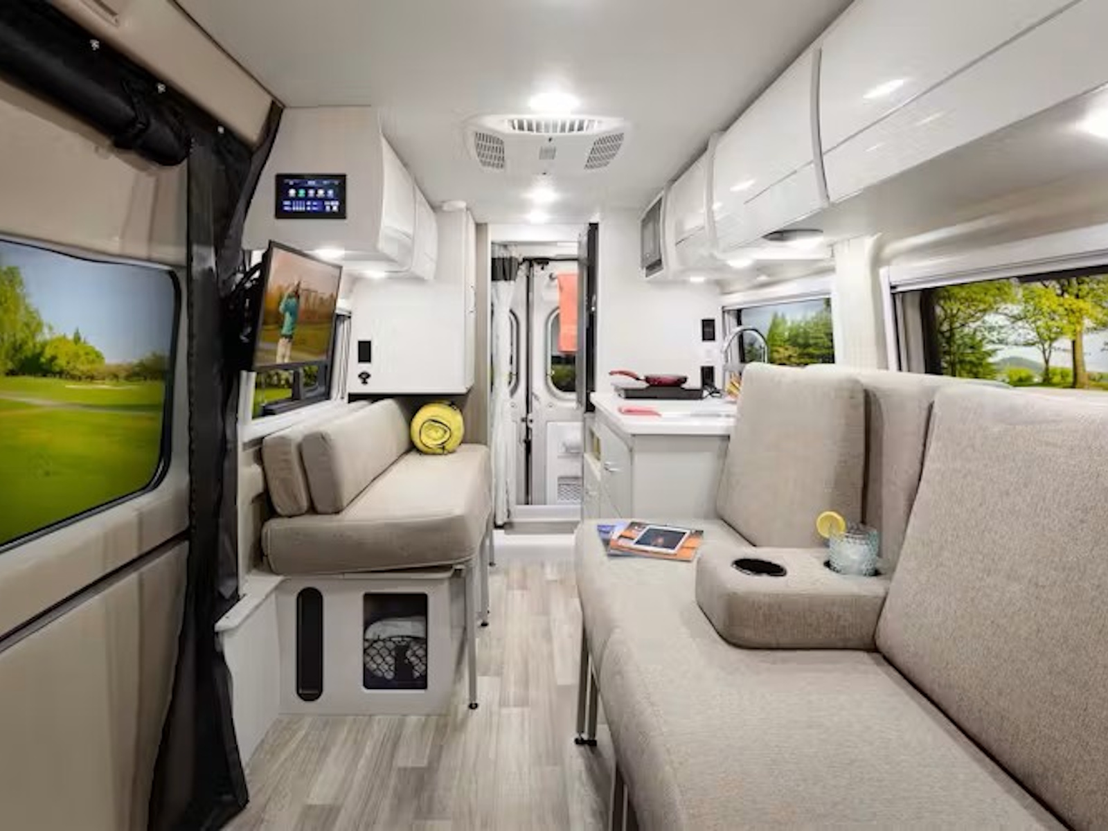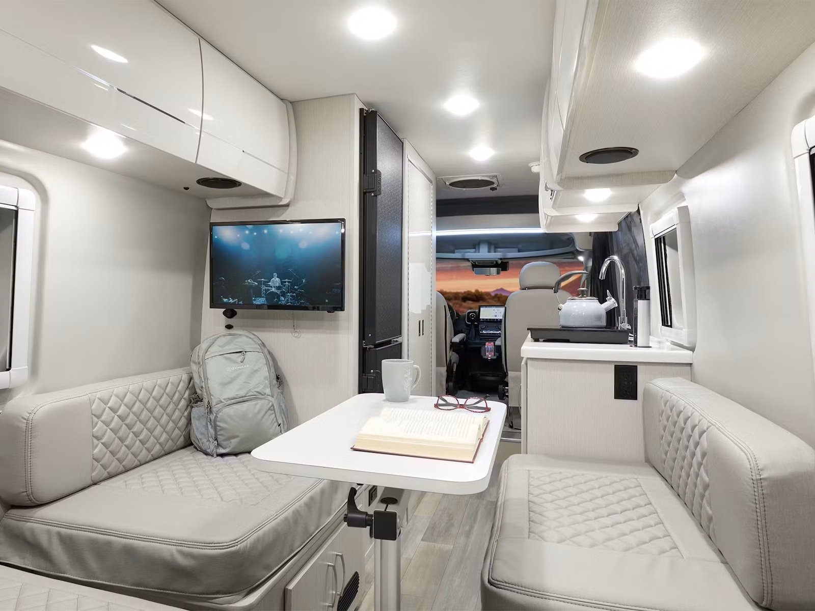 - The Tellaro® is designed for life on the road, featuring modern upper cabinets that keep your gear organized and out of sight. The bench-style seating effortlessly transforms into a cozy bed when it’s time to unwind. Swivel the captain’s chairs around to expand your lounge space, and pull down the privacy shades once the sun goes down. With the Rapid Camp+® system by Firefly Integrations, you can control lighting, climate, tank heaters, and the generator from the coach’s touchscreen or your smartphone, making van life easy.