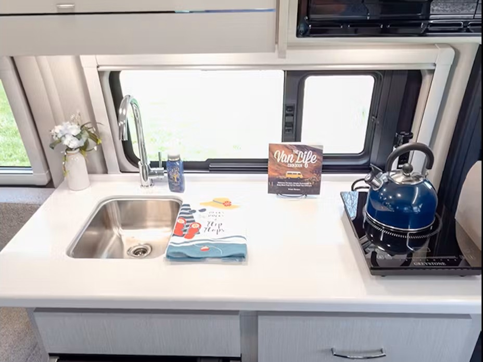 - Whip up tasty meals wherever you roam with the Tellaro®. A single-burner induction cooktop makes it easy to prep quick bites on the fly. Store fresh ingredients in the single-door 12-volt fridge in the 20L and 20LS floor plans or choose between the 20U, 20Y, 20US, and 20YS if a double-door refrigerator is more your speed. Reheat any leftovers in the microwave, then clean up fast with the stainless-steel single-bowl sink. If you need to plug in a coffee maker or blender, use the pop-up countertop outlet for instant power.