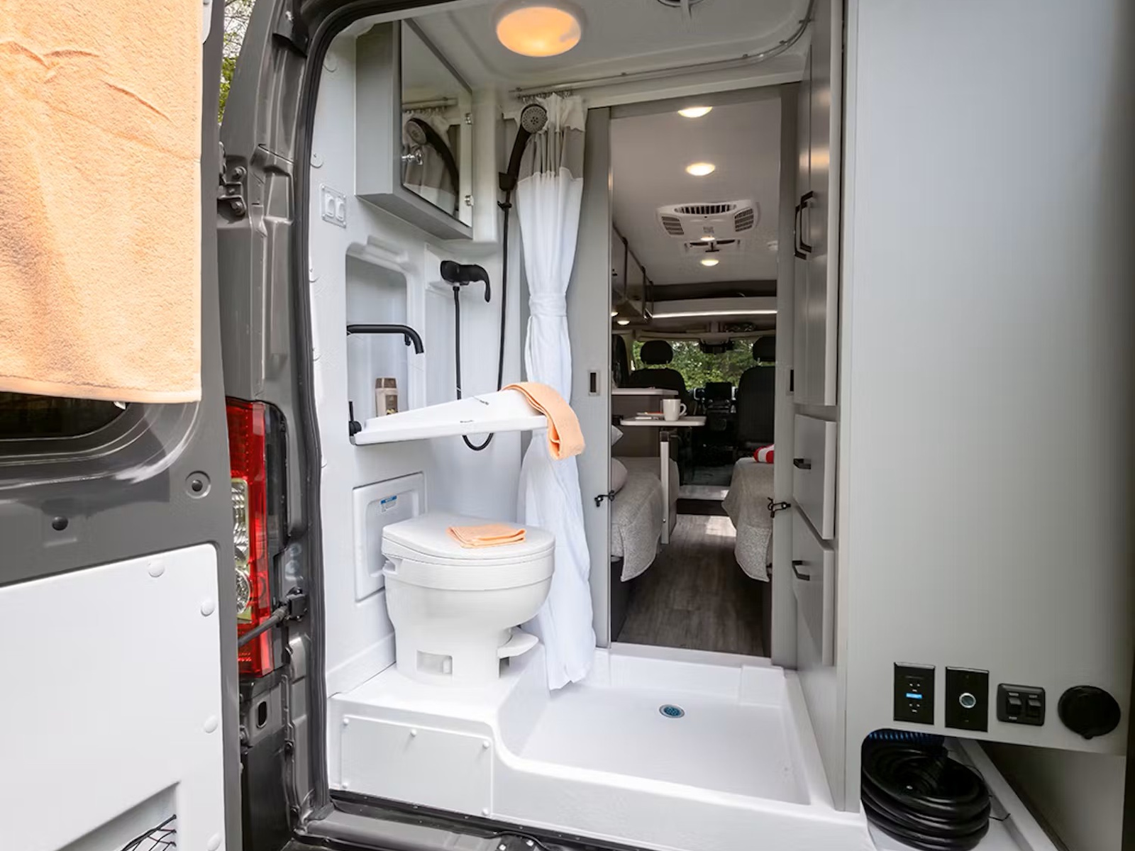 - The Tellaro® is designed for life on the road, featuring modern upper cabinets that keep your gear organized and out of sight. The bench-style seating effortlessly transforms into a cozy bed when it’s time to unwind. Swivel the captain’s chairs around to expand your lounge space, and pull down the privacy shades once the sun goes down. With the Rapid Camp+® system by Firefly Integrations, you can control lighting, climate, tank heaters, and the generator from the coach’s touchscreen or your smartphone, making van life easy.