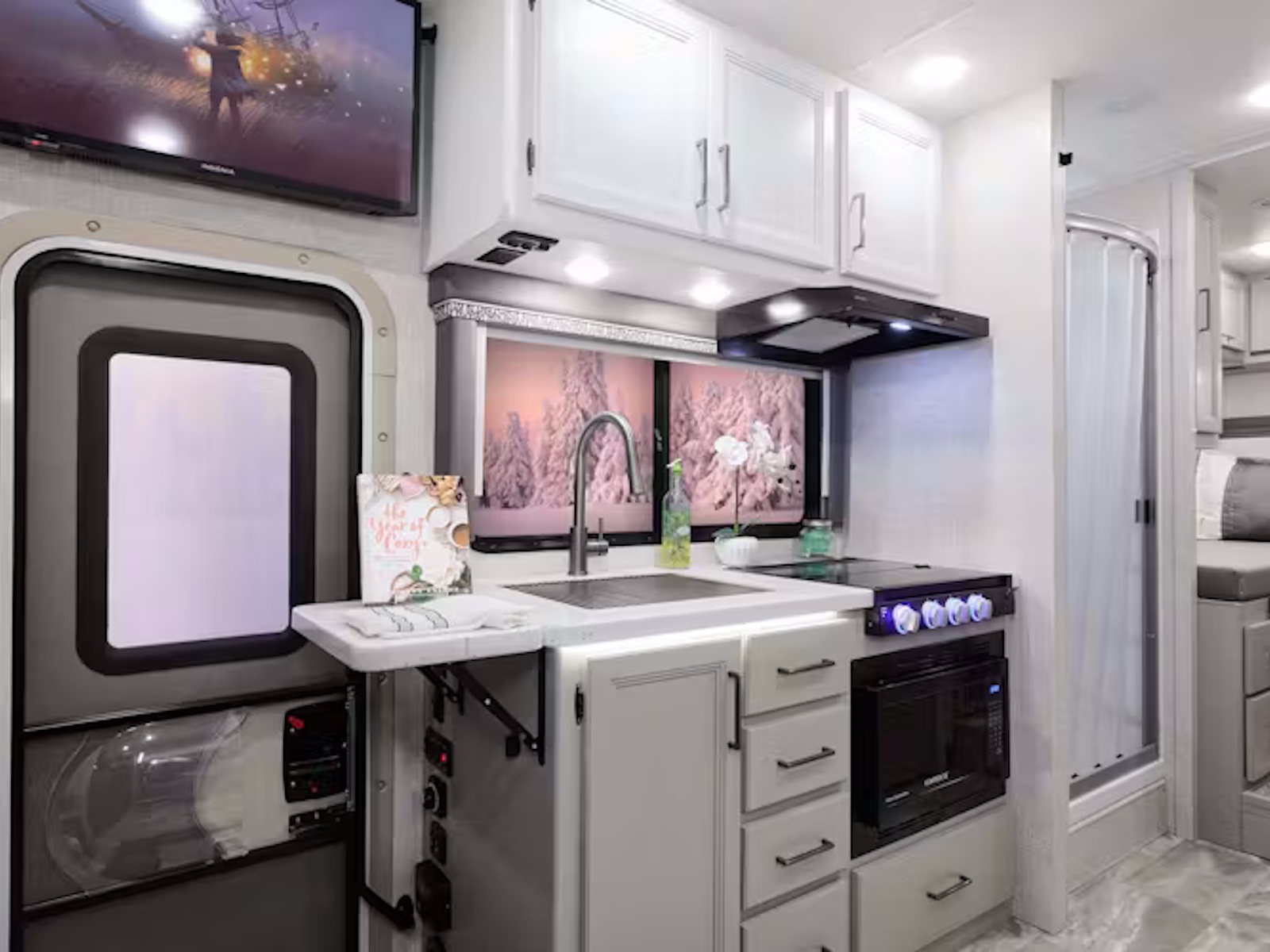 - Ditch the takeout and cook your favorite meals inside the Quantum®, featuring a 12-volt refrigerator and a single-bowl stainless-steel sink with a pull-down sprayer. The LX19 floor plan has an additional quick-access pull-out fridge. All ESpec models feature a two-burner gas cooktop and a convection microwave oven with an air fryer. The KW29, LF31, and HS31 offer a two-burner gas cooktop with a single induction burner for more versatility, while the LC28 has a recessed three-burner gas cooktop/oven with a microwave oven. Many floor plans also have a flip-up countertop extension for additional prep space.
