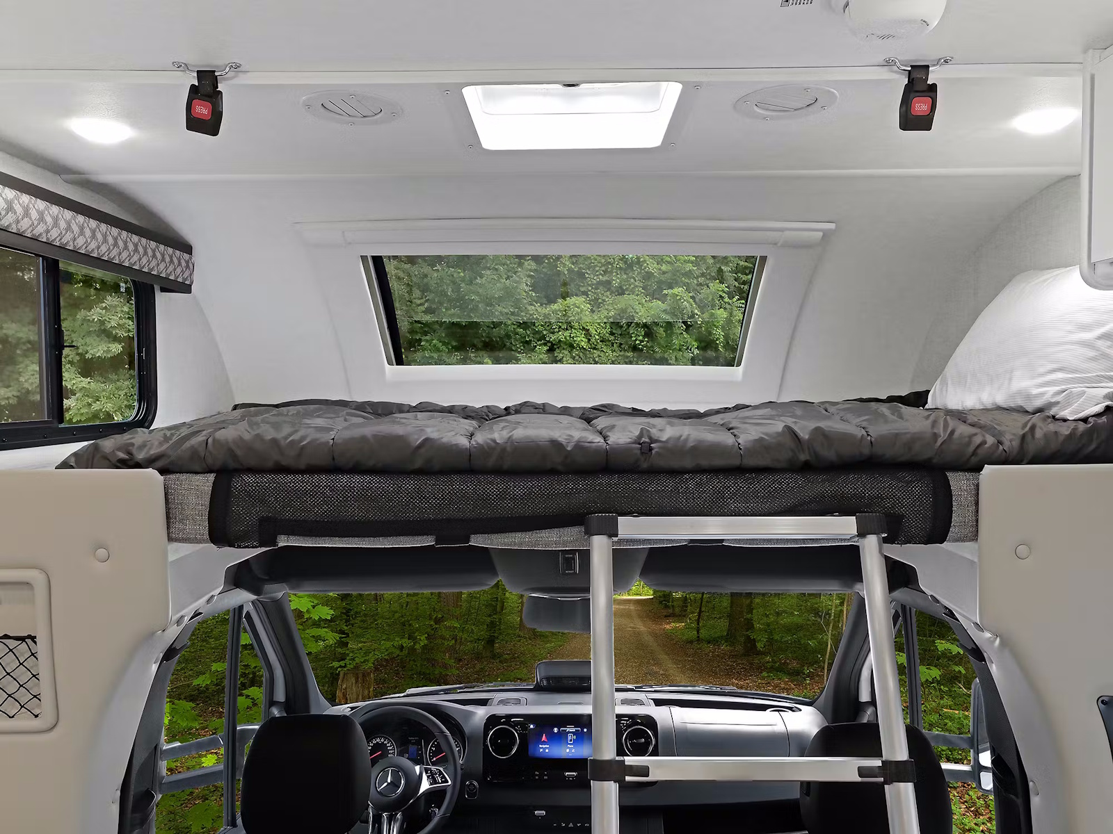 Cab-Over Sleeping Area with Cup Holders, and Telescoping Bunk Ladder