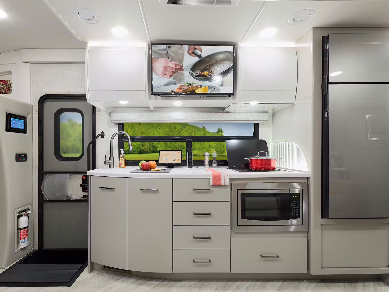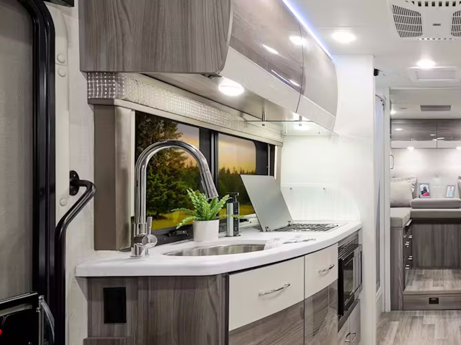 - Cook your favorite meals wherever the road takes you in the Tiburon®. This well-equipped kitchen includes a 12-volt refrigerator, convection microwave oven with air fryer, stainless-steel single-bowl sink, and a two-burner gas cooktop to prepare tasty dishes on the go. The 24RW floor plan features a convenient flip-up countertop extension if you need more room to prep. In the 24FB, 24TT, and 24XL models, a pop-up countertop outlet charging center powers your devices and keeps them close at hand while you cook.