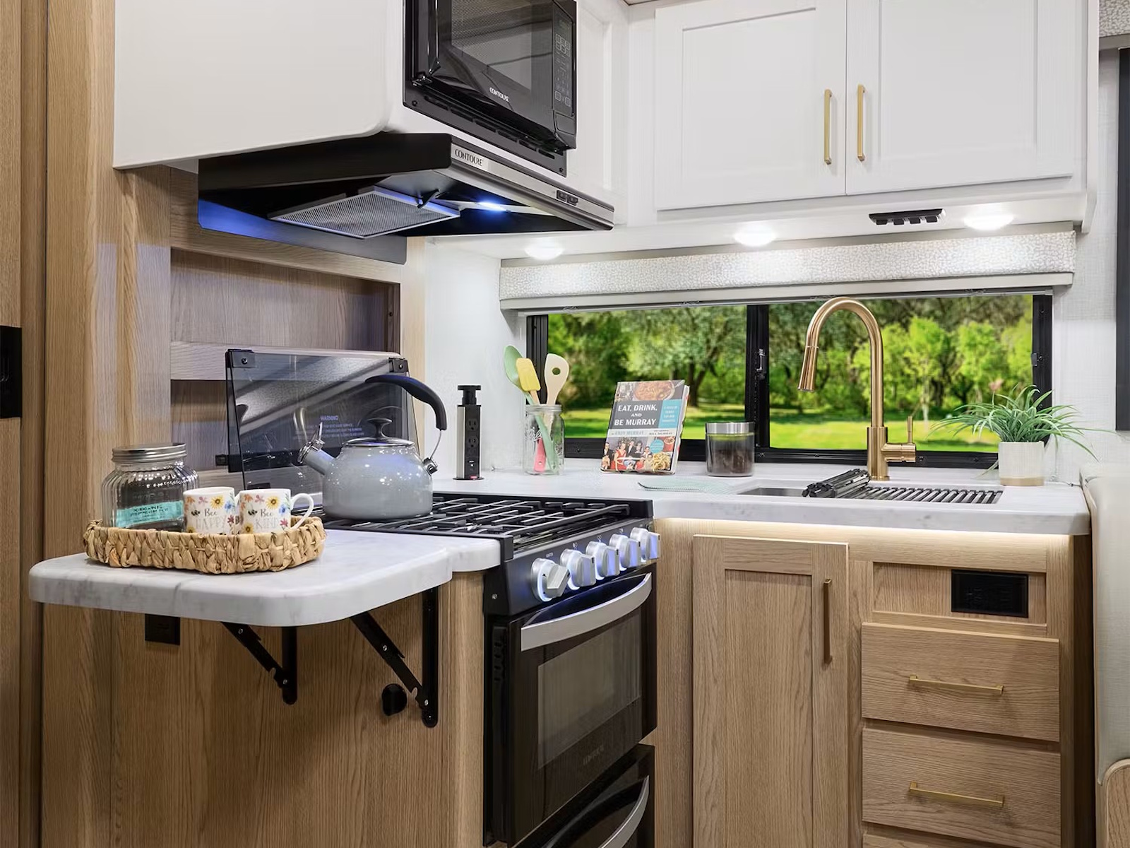 - Whip up meals easily in the Chateau®. All floor plans include a 12-volt refrigerator and a stainless-steel single-bowl sink with a pull-down sprayer. Store more snacks and drinks in the 19X model’s additional pull-out fridge. Inside the 28Z, 29K, 31E, and 31H, you’ll have a three-burner gas cooktop, microwave oven, and a pop-up countertop charging center to power your appliances. ESpec models switch things up with a two-burner gas cooktop and a convection microwave with an air fryer for flexible cooking solutions on the go.