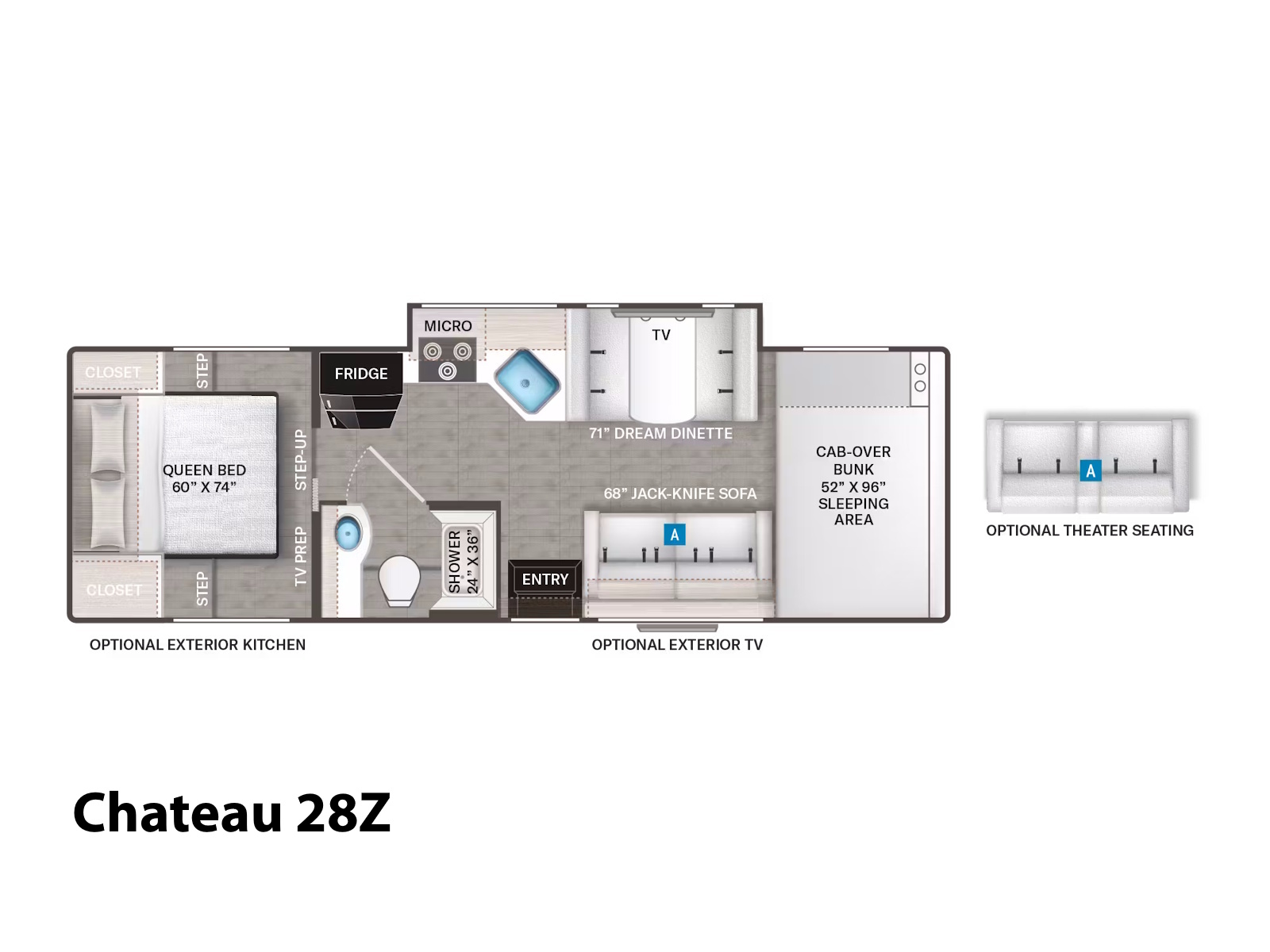 - Step into the Chateau® and experience an interior that’s functional and inviting. Most layouts include the Dream Dinette®, which converts from mealtime seating to an extra sleeping space. The 19Z features a roomy rear U-shaped dinette with the same dual-purpose design instead of a dinette booth, while the 19X has bench-style seating and a Lagun table system for more flexibility. In the 28Z, 29K, 31E, and 31H floor plans, unwind on the jack-knife sofa or replace it with the optional theater seating. The 28G model also has a jack-knife sofa.