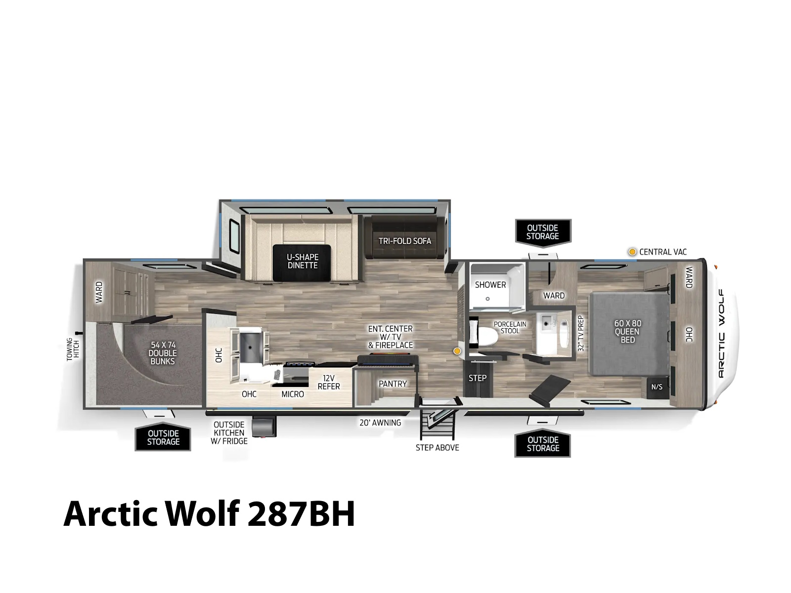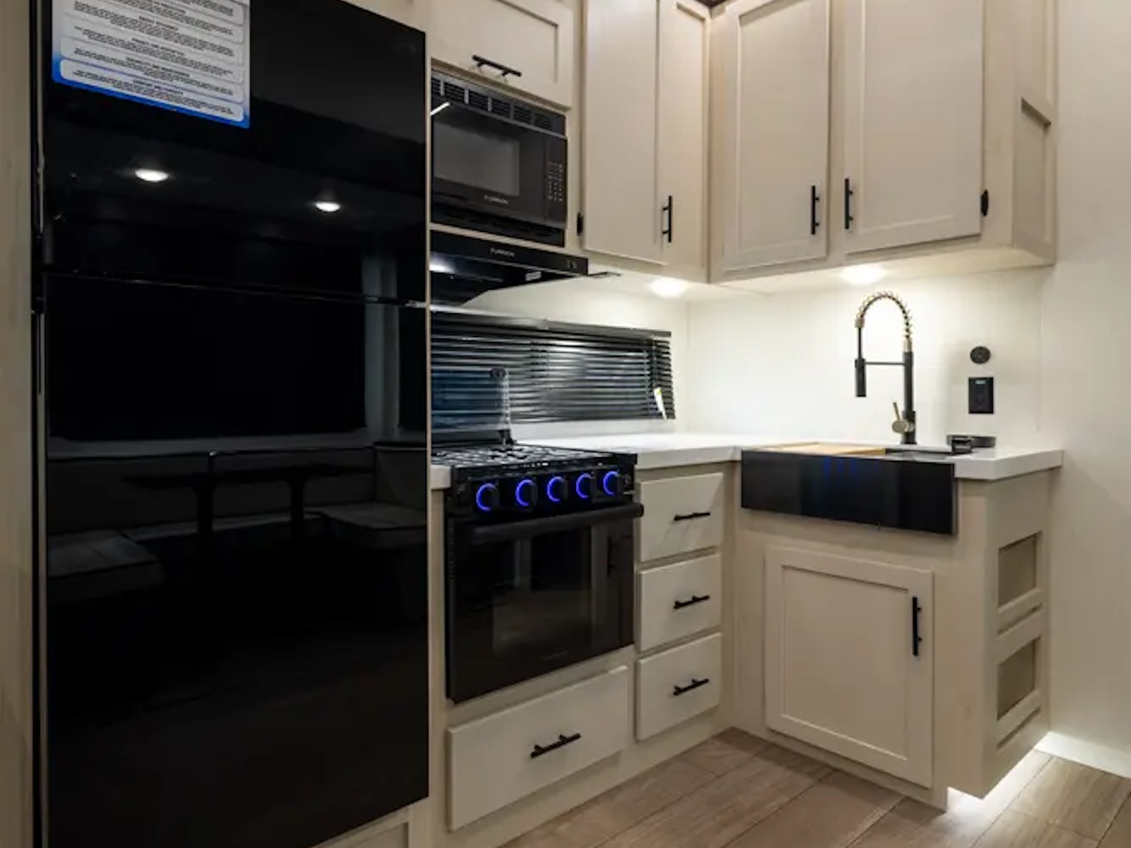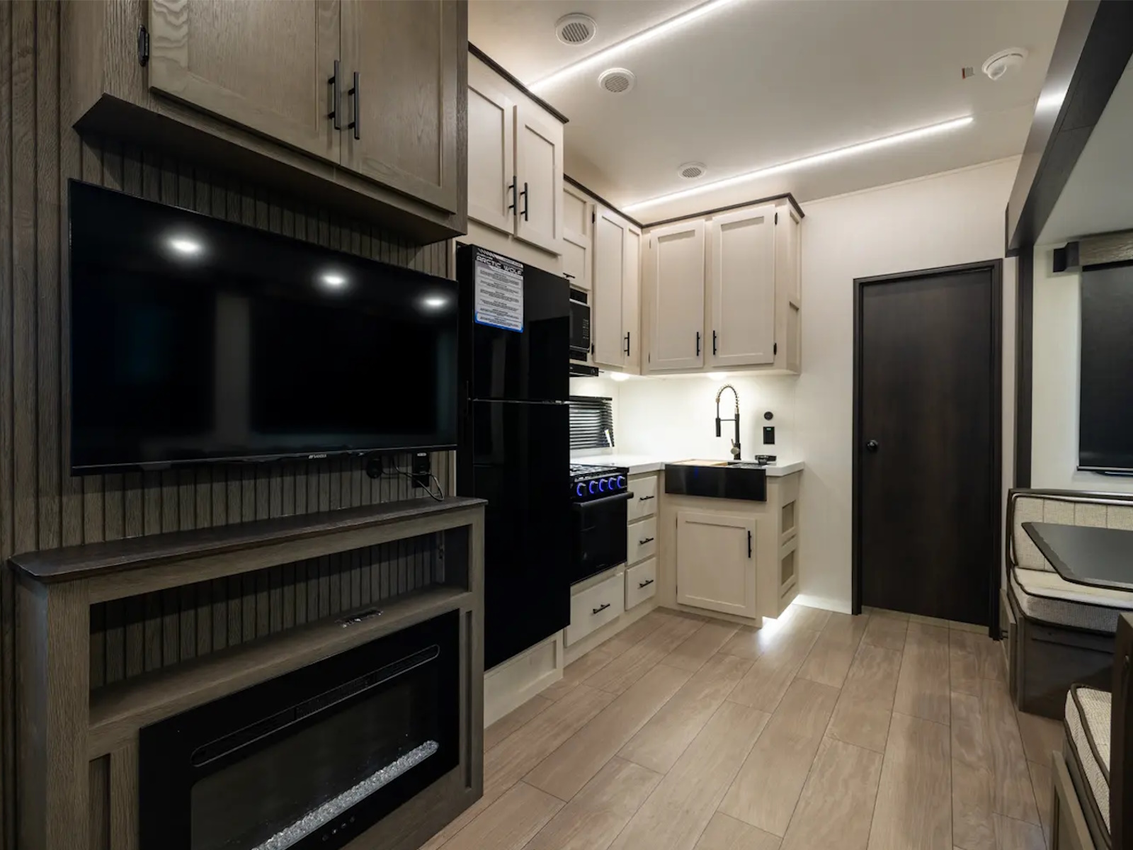 Our most popular multi-sleeper and family fun coach! Interior highlights include an oversized u-dinette seating surface for all the kids, dual pots and pans drawers, oversized double bunk beds, farm-style sink and 6’4” tall slide rooms, electric fireplace and an 80” queen size bed. Some exterior refinements include an oversized 20’ exterior awning, 15,000 BTU A/C, basement storage, Cherokee “Step Above” entry step, one-touch auto leveling and a deluxe outside kitchen for the camp chef!