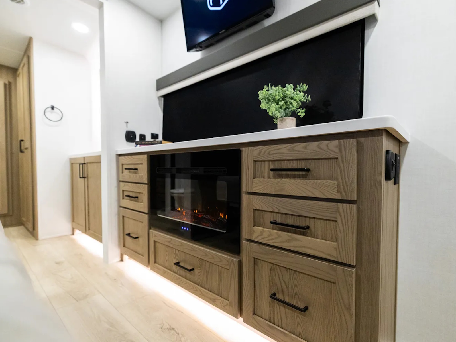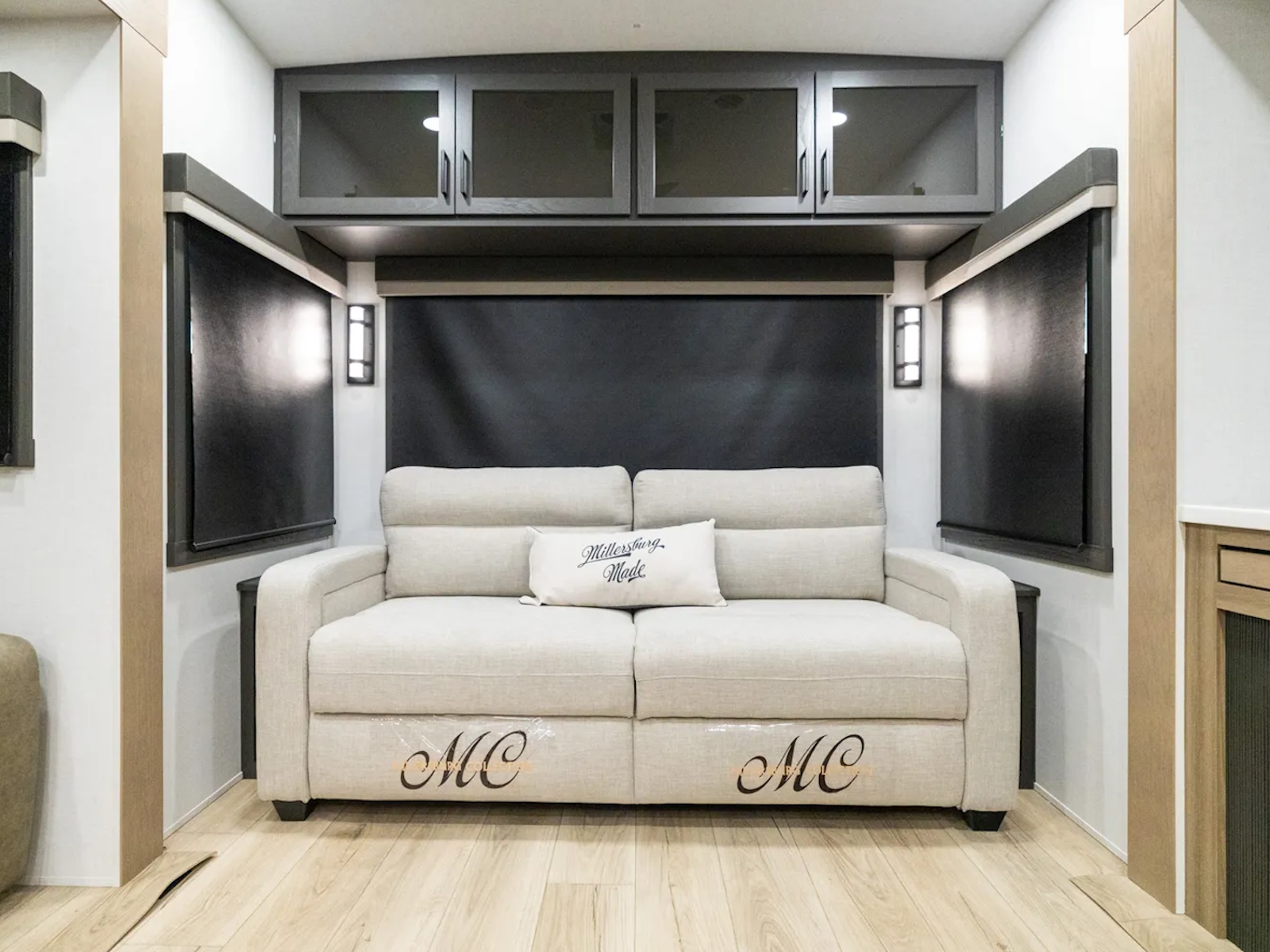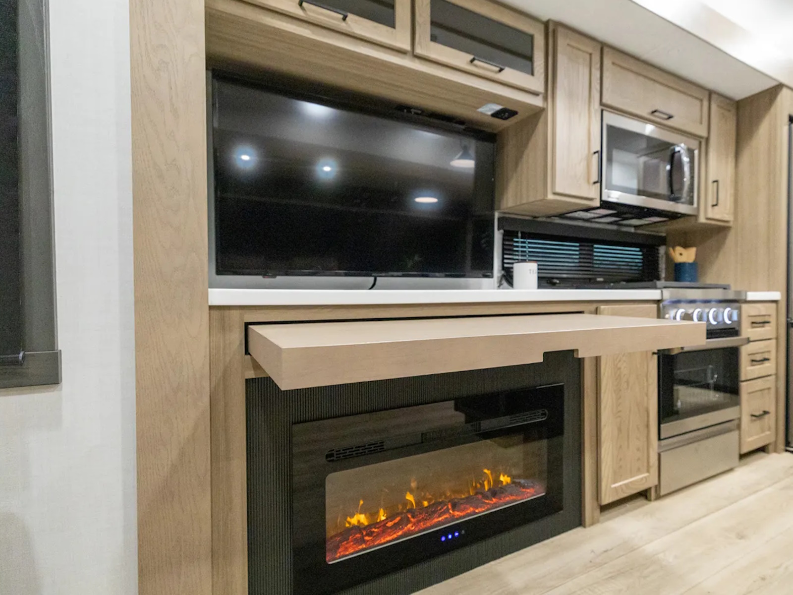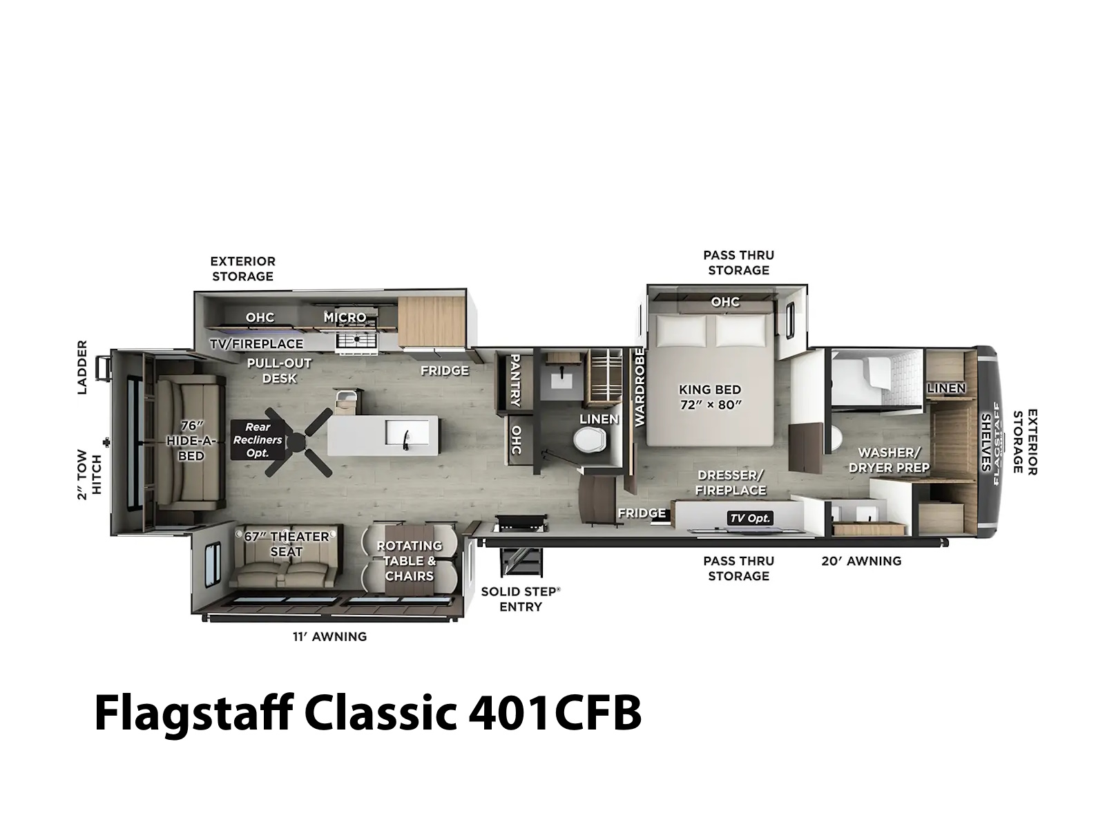 This 40' rear living fifth wheel combines comfort and versatility! The spacious living area features a 76" hide-a-bed, 67" theater seating, a fireplace, and a pull-out desk for remote work or hobbies. The kitchen offers an island, pantry, and rotating dinette seating, while the private bedroom includes a king bed, dresser with fireplace, and washer/dryer prep. With dual awnings and pass-thru storage, it’s built for extended stays in style.
