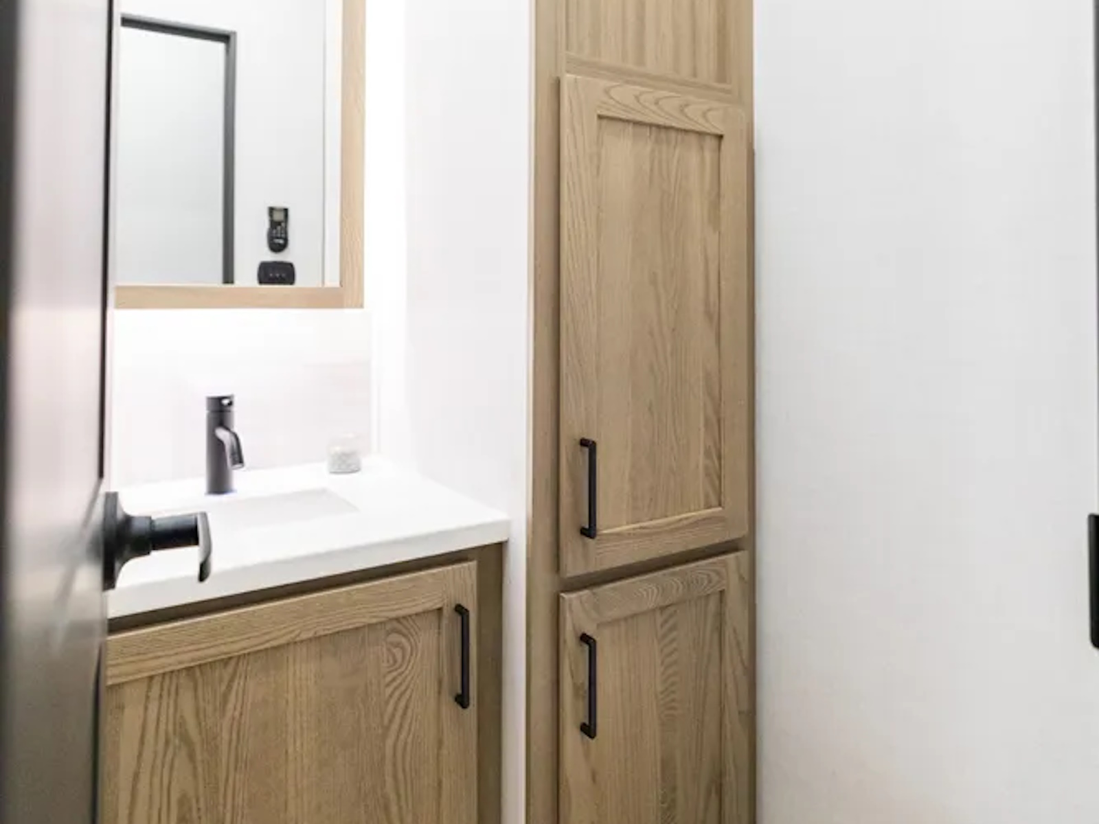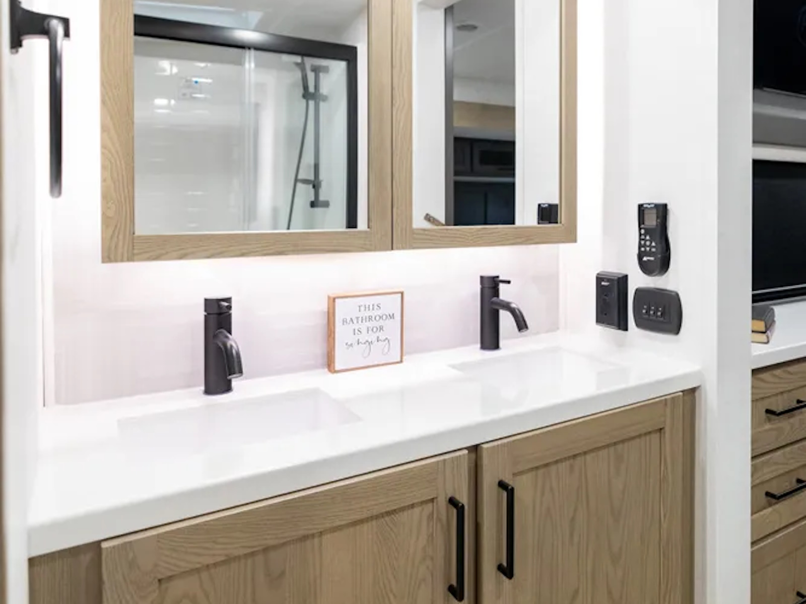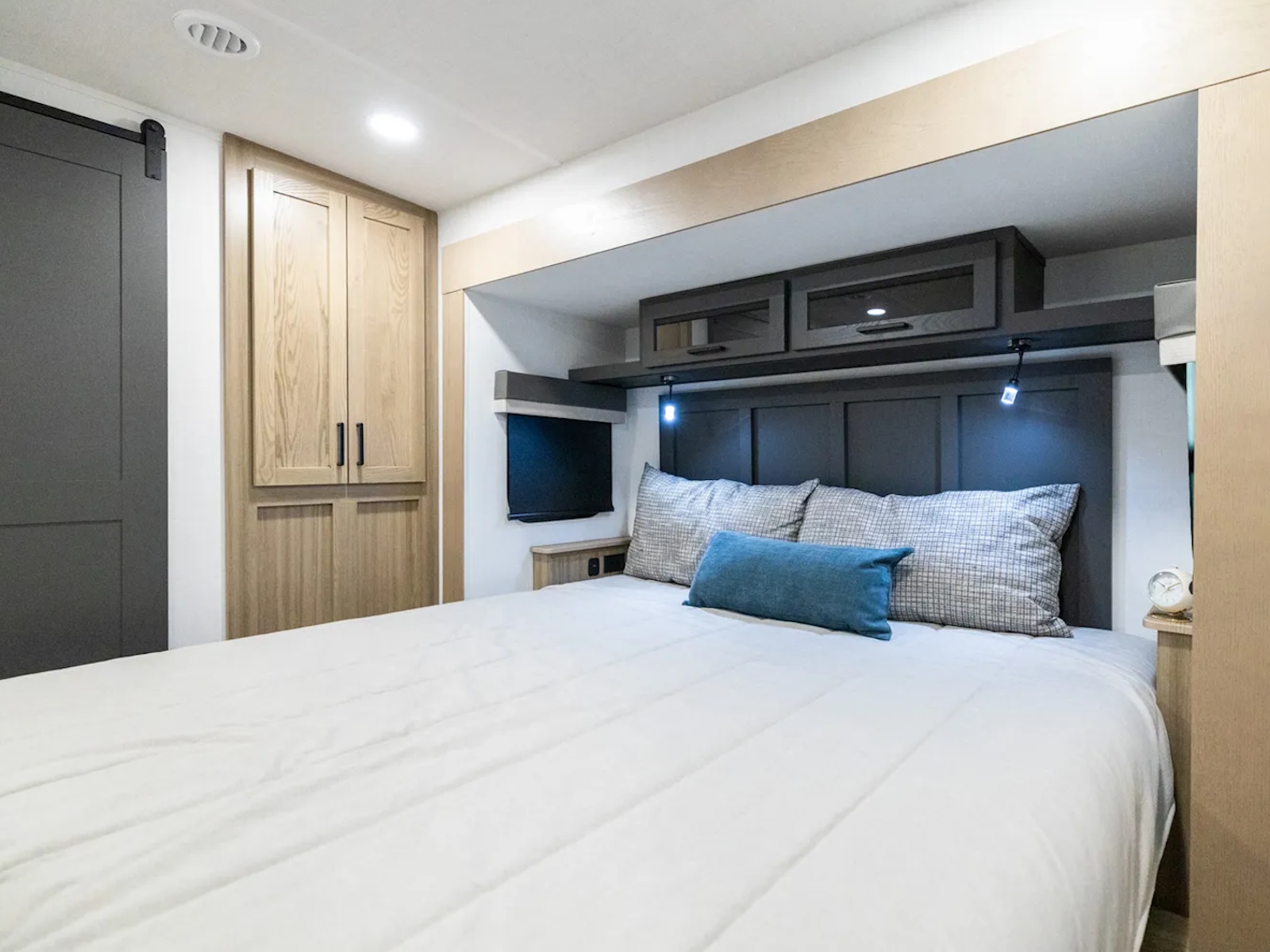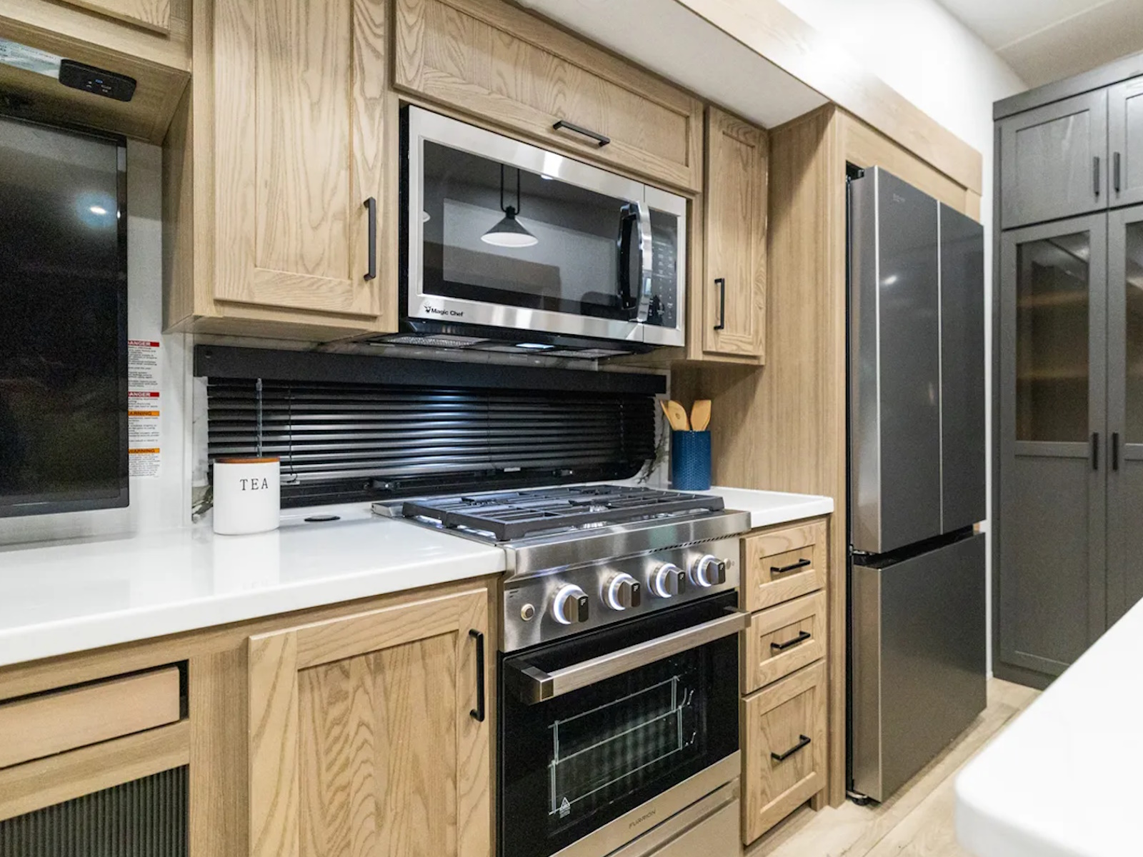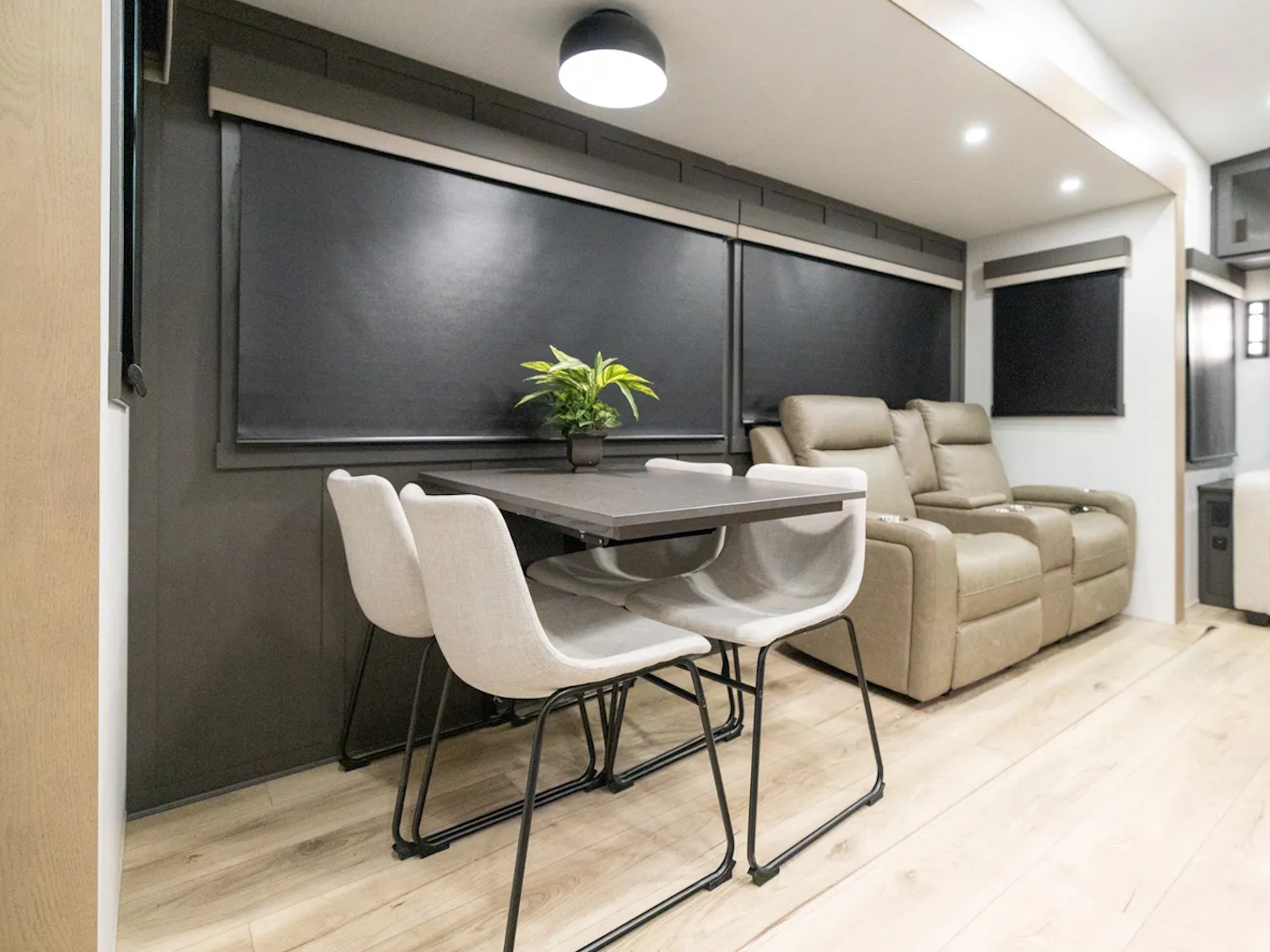 This 40' rear living fifth wheel combines comfort and versatility! The spacious living area features a 76" hide-a-bed, 67" theater seating, a fireplace, and a pull-out desk for remote work or hobbies. The kitchen offers an island, pantry, and rotating dinette seating, while the private bedroom includes a king bed, dresser with fireplace, and washer/dryer prep. With dual awnings and pass-thru storage, it’s built for extended stays in style.