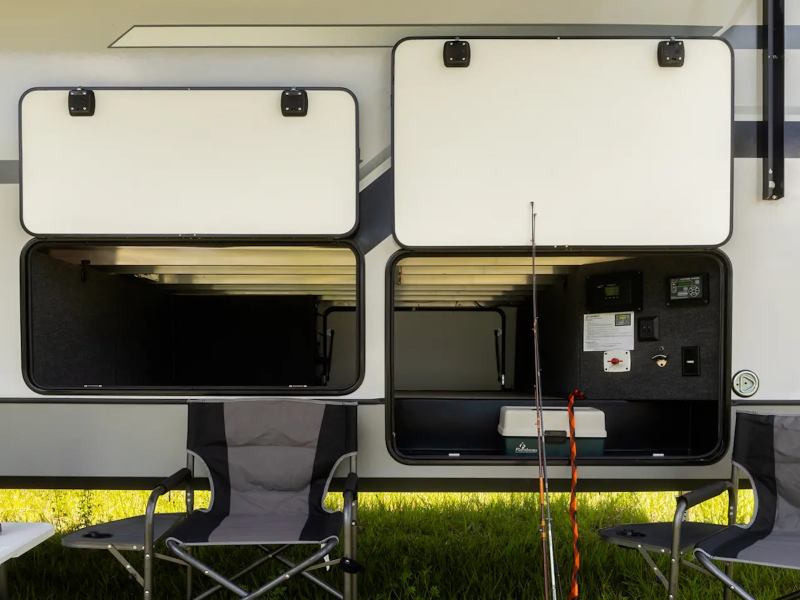 - Extra Large Pass Thru Storage with Metal Slam Latch Baggage Doors