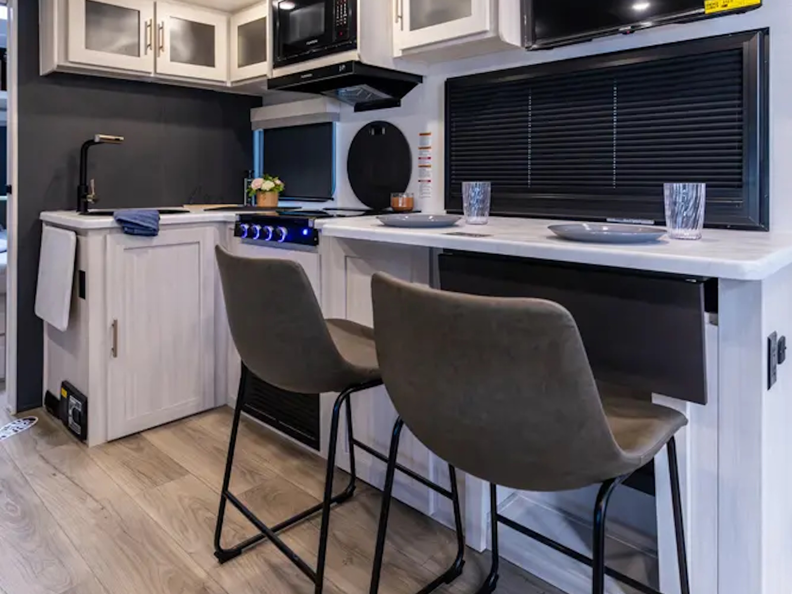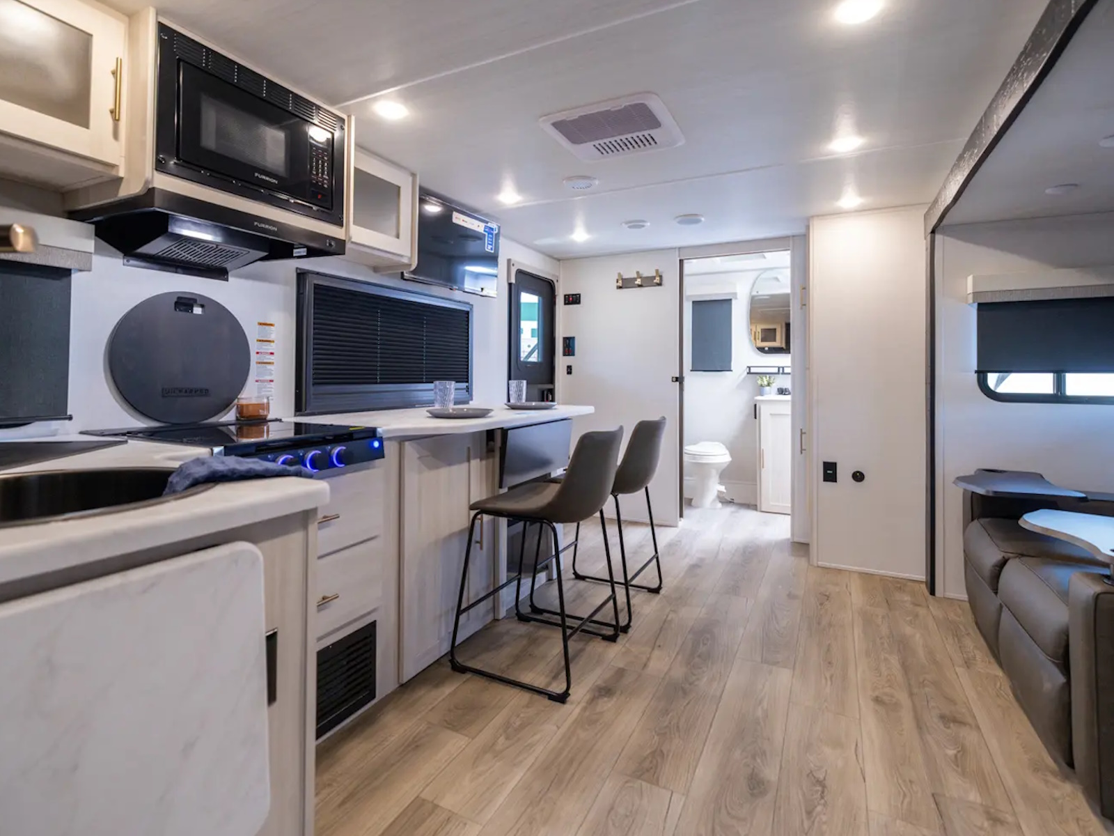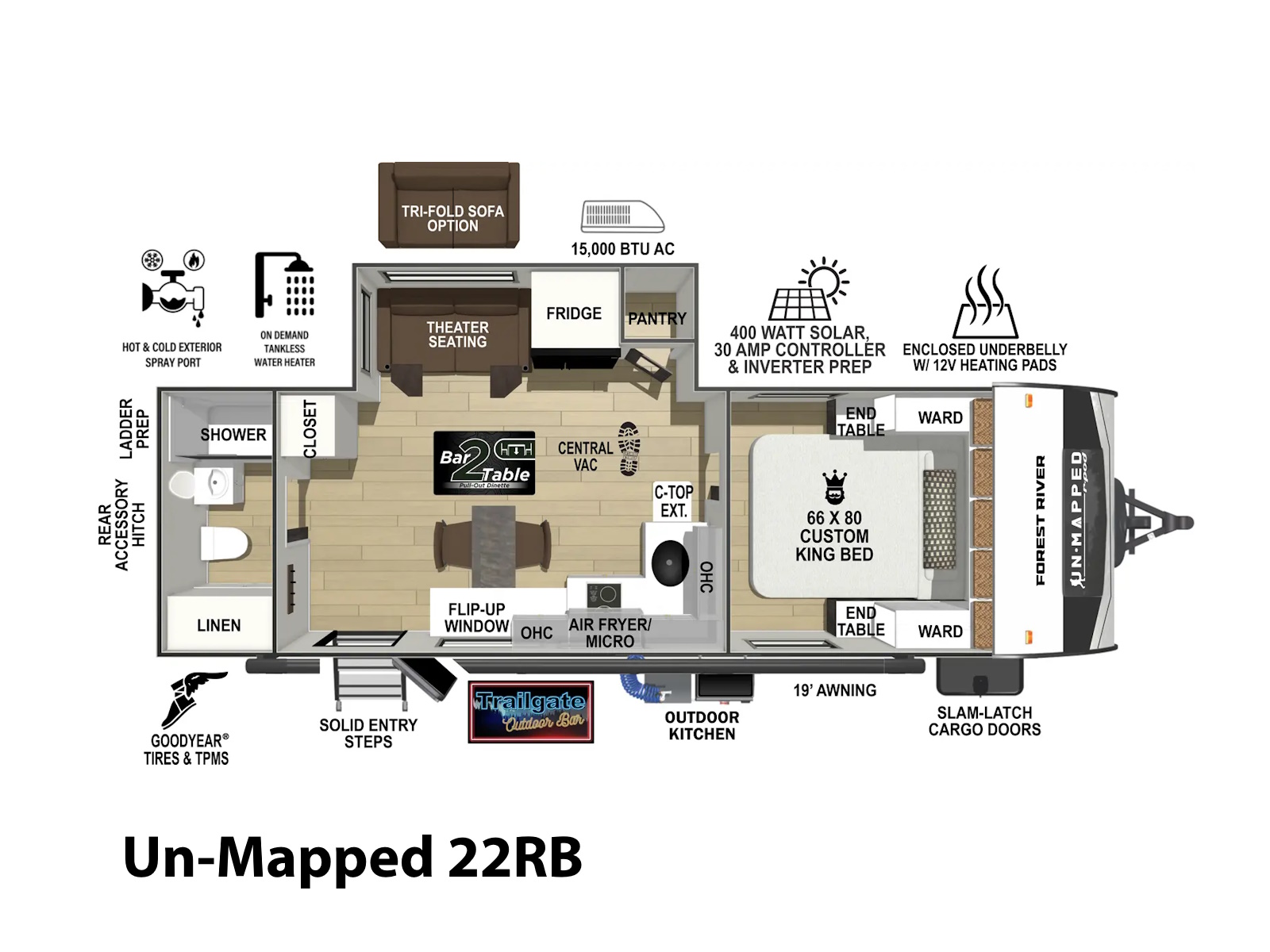 The Un-Mapped 22RB offers a front king bed and full rear bath. The kitchen features a bar top with flip-up window, convection microwave, and 12V refrigerator, plus a bar-to-table conversion for flexible dining. Inside, theater seating provides comfort, while outside, enjoy a TrailGate outdoor bar, 19' power awning, and hot & cold spray port—perfect for compact adventures.