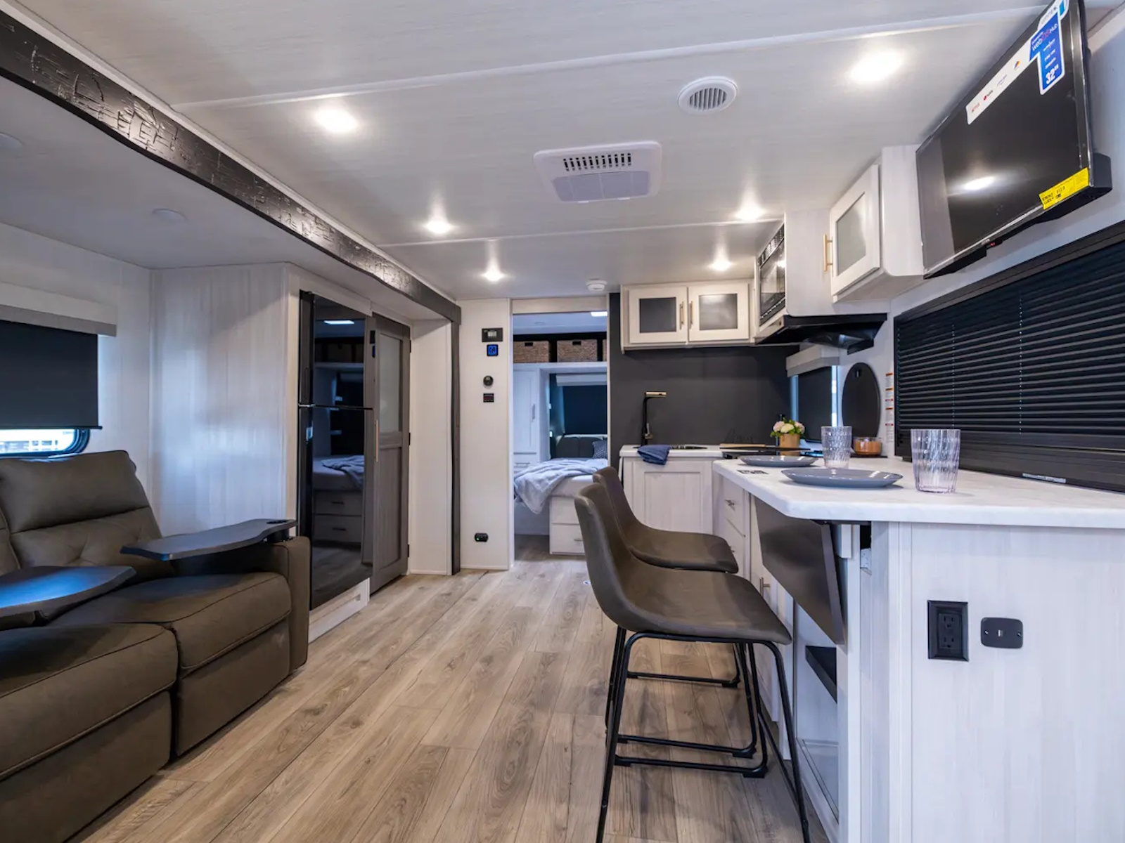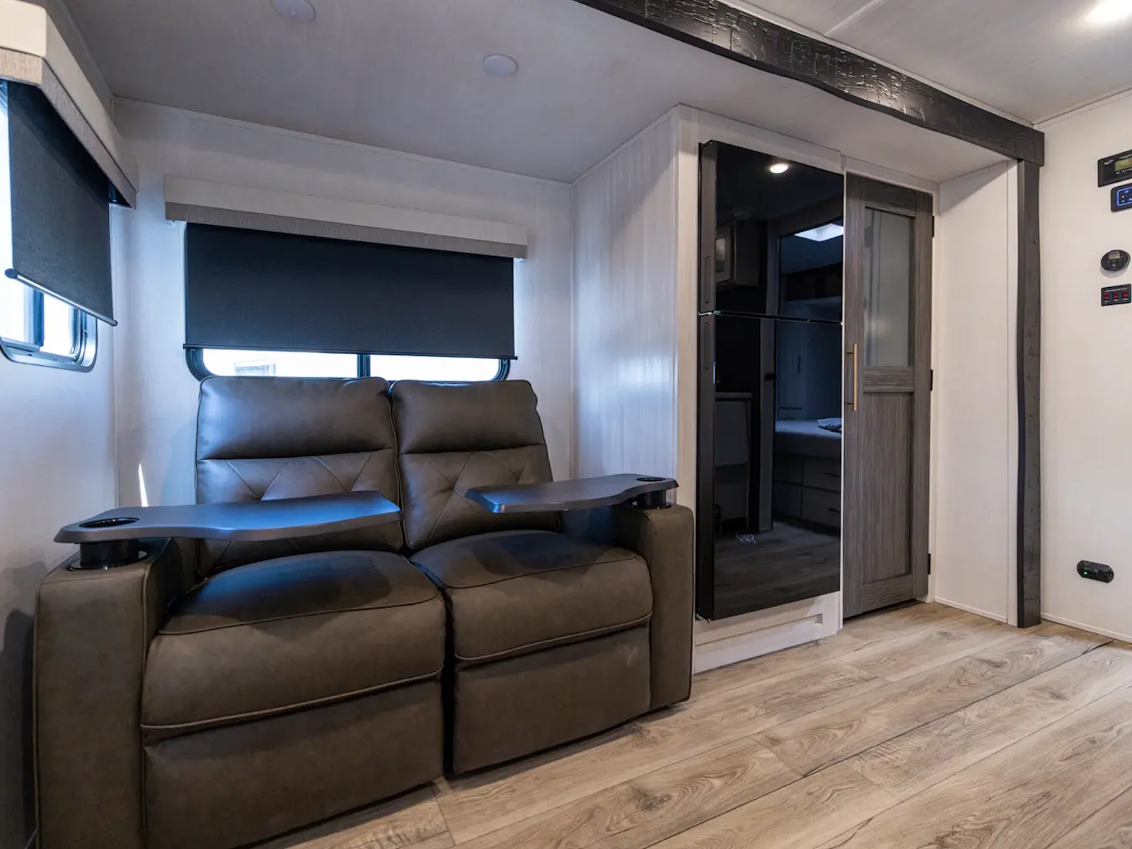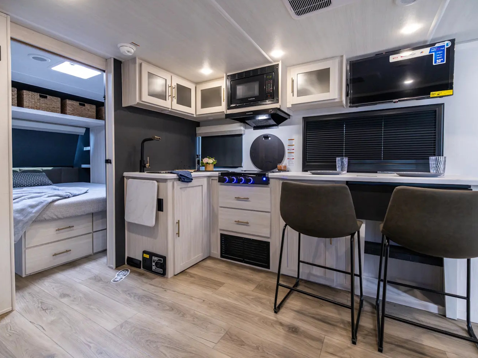The Un-Mapped 22RB offers a front king bed and full rear bath. The kitchen features a bar top with flip-up window, convection microwave, and 12V refrigerator, plus a bar-to-table conversion for flexible dining. Inside, theater seating provides comfort, while outside, enjoy a TrailGate outdoor bar, 19' power awning, and hot & cold spray port—perfect for compact adventures.