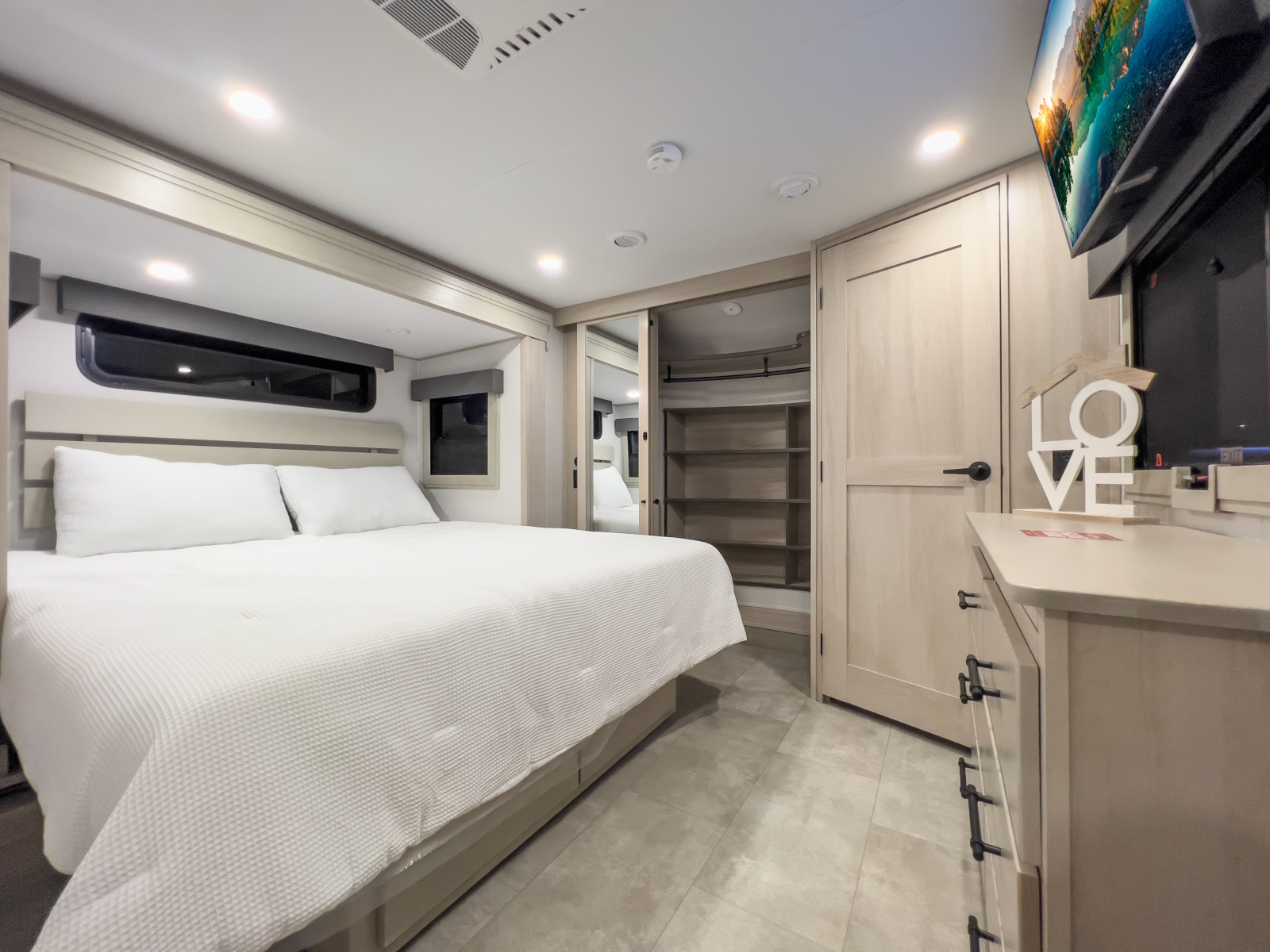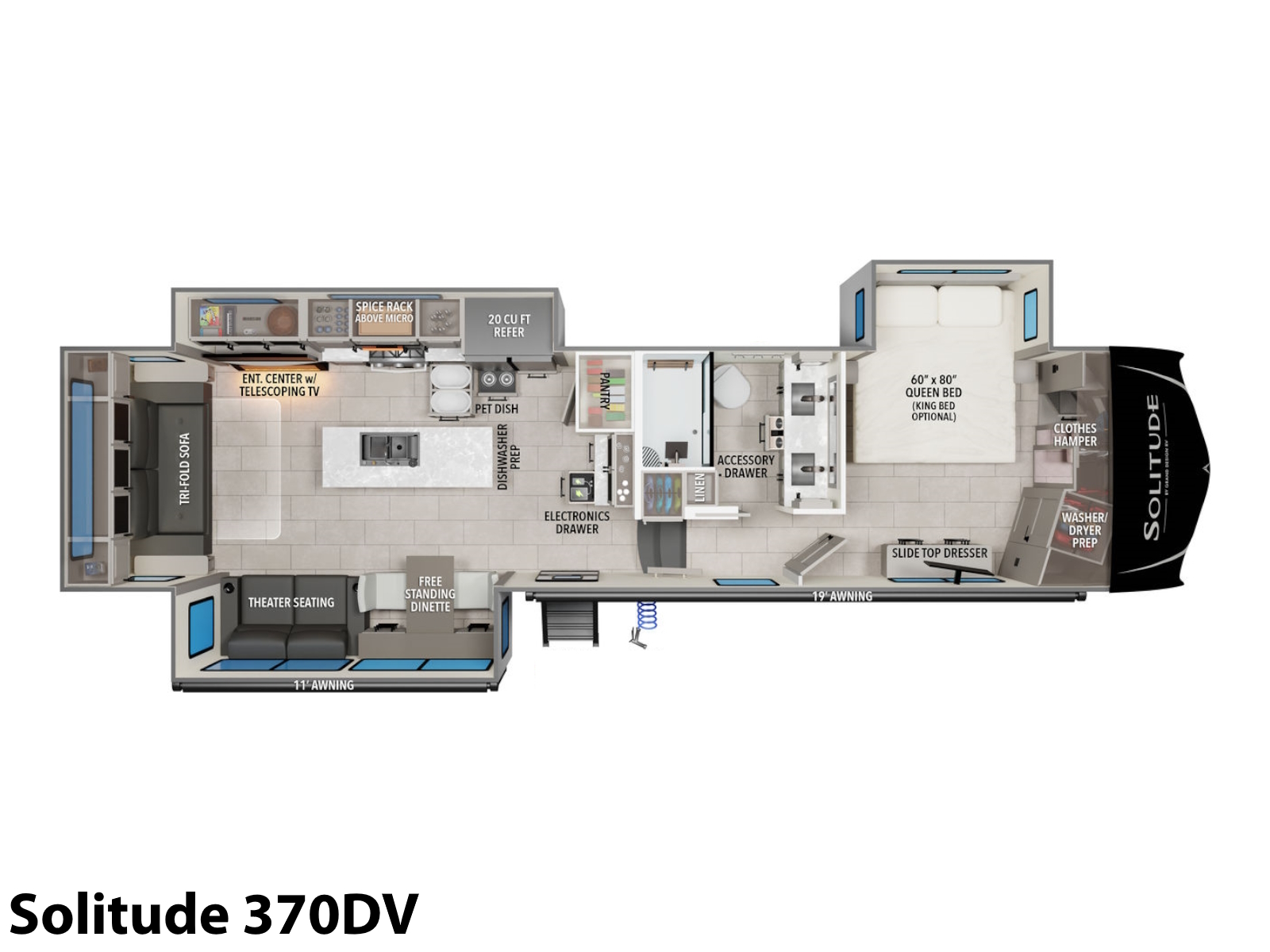 If you're looking for more room, Solitude is the most spacious Extended Stay Fifth Wheel ever built. Taller ceilings, bigger cabinets, and a sweeping scenic window all make the Solitude a dream that you wake up to as long as you like