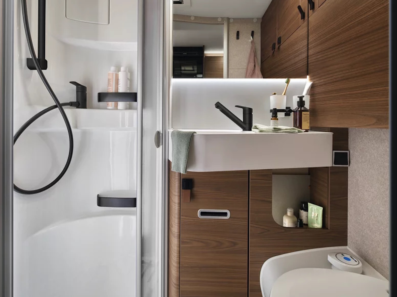 Bathroom. You can continue your daily care regime on holiday with the HYMER ML-T. The bathroom offers you home-from-home comfort.