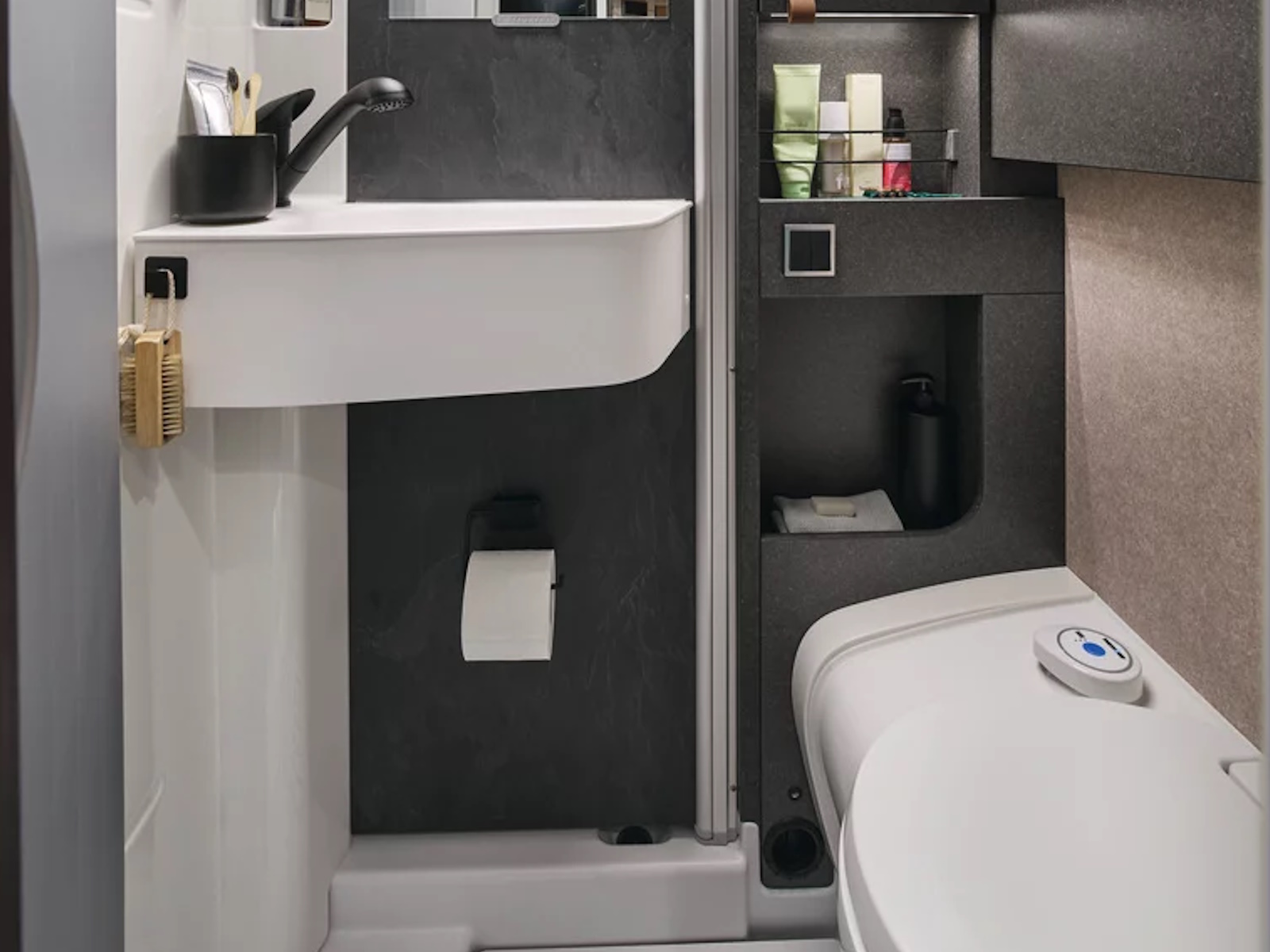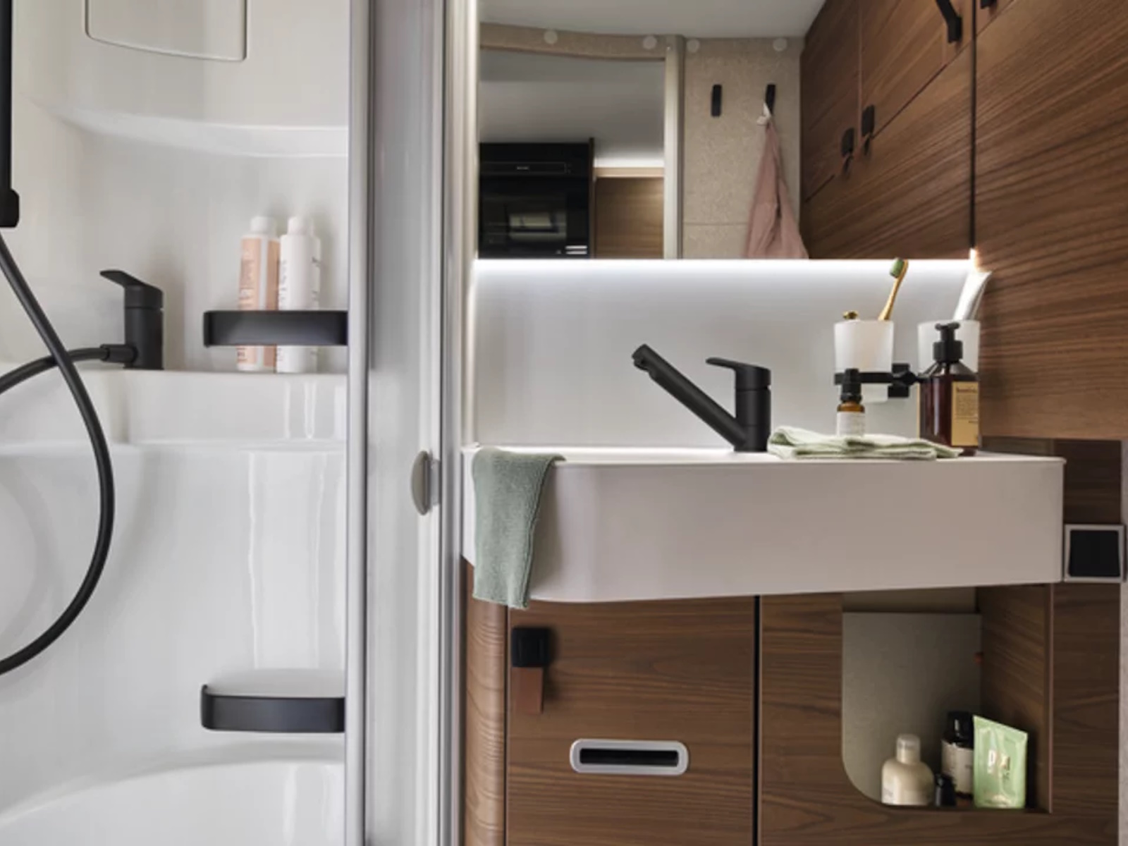 Bathroom. You can continue your daily care regime on holiday with the HYMER ML-T. The bathroom offers you home-from-home comfort.