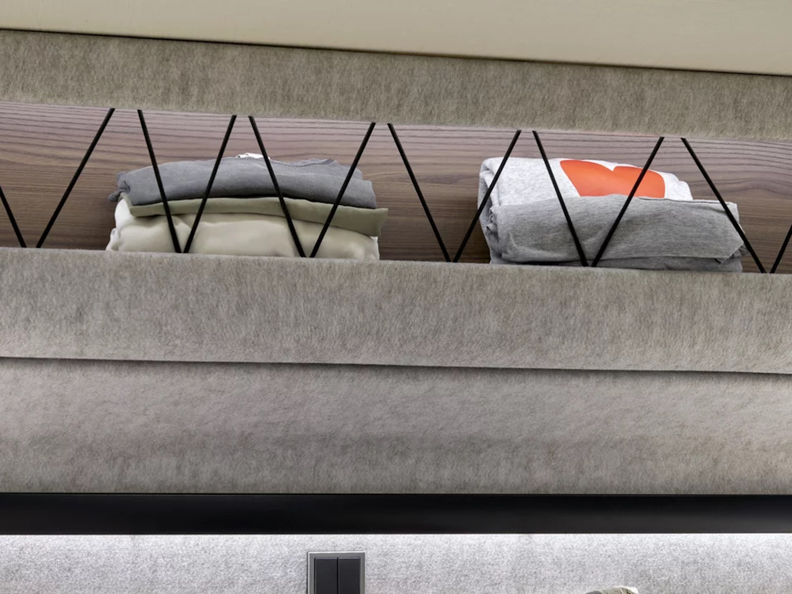 - The XXL bed available for specific layouts brings with it an extension of the lying surface on one side. This creates a longer bed and still leaves a semi-high wardrobe as well as a linen compartment.