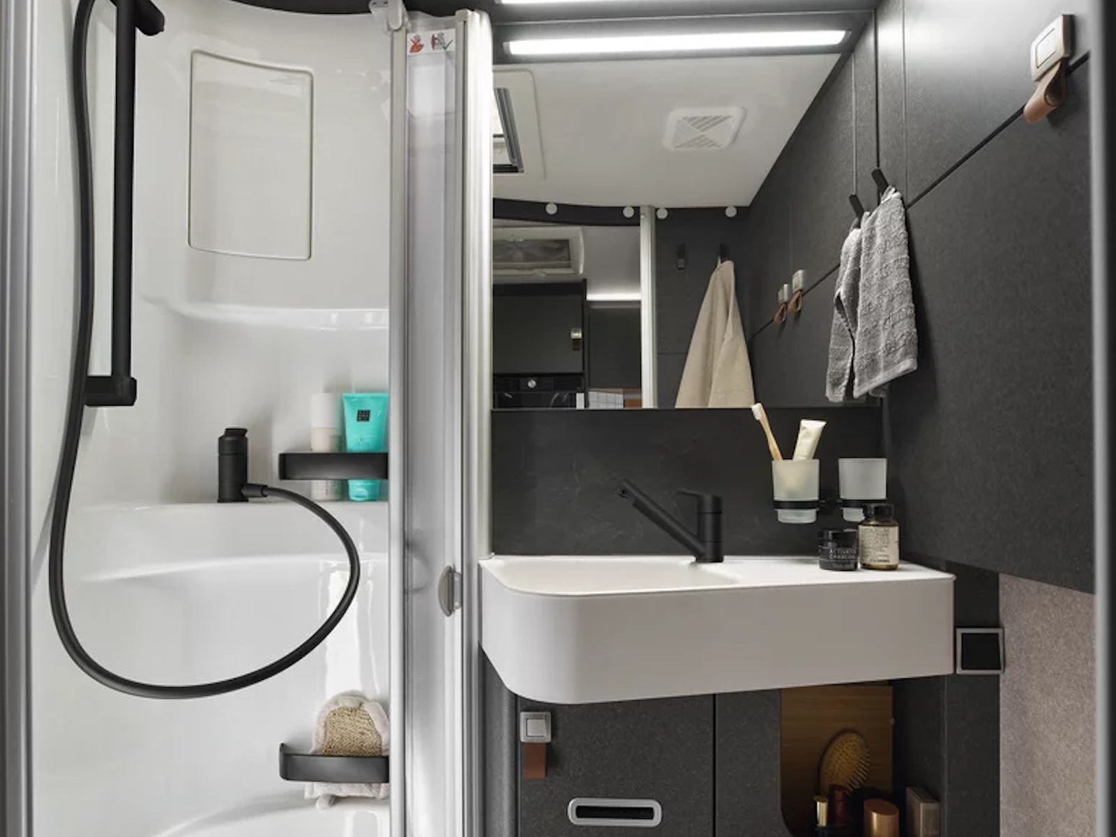 Bathroom. You can continue your daily care regime on holiday with the HYMER ML-T. The bathroom offers you home-from-home comfort.