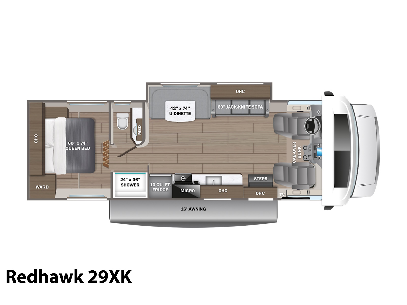 When you step up your Class C ownership with Jayco’s Redhawk, you're stepping into a new level of RV excellence. The differences between the Redhawk and Redhawk SE are clear from the start, beginning with the Redhawk’s sleek, frameless windows that give it a clean, automotive look while protecting seals from harmful sun exposure. That means a longer lifespan and fewer trips to the shop. Safety is also a priority, with side-view cameras offering full visibility down both sides of the coach while turning or changing lanes. The JRide® handling package adds to the smooth experience, with features like a computer-balanced driveshaft, front and rear stabilizer bars, Hellwig® helper springs, and rubber isolation body mounts. It all comes together for a ride that’s quiet, comfortable, and easy to enjoy—whether you're on a short getaway or a long haul. The one-piece seamless front cap is the only one of its kind on the market. This cap is designed to drastically reduce the risk of leaks in the most common location on a Class C motorhome. With Jayco’s extra attention to durability and detail, you’ll spend more time on the road and less time in the service bay. An automotive-bonded panoramic window in the cap adds to its appeal and provides stunning views from the overhead bunk. Staying cool is easy, too, with a standard 15,000 BTU ducted A/C or the option to upgrade to dual 13,500 BTU units with a power management system, so comfort is always part of the journey.
