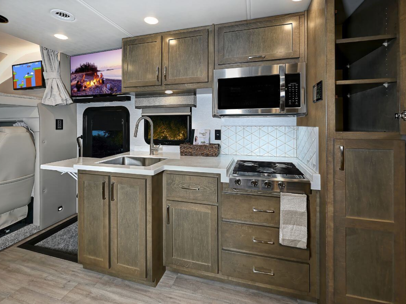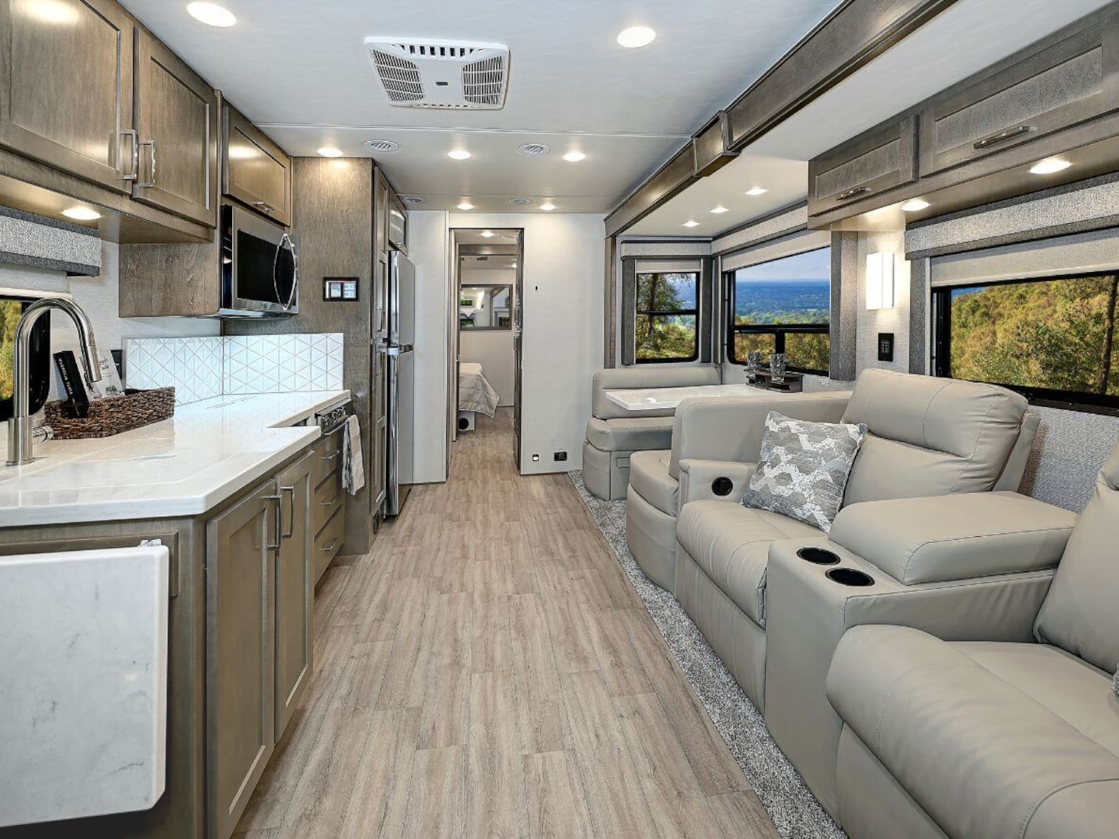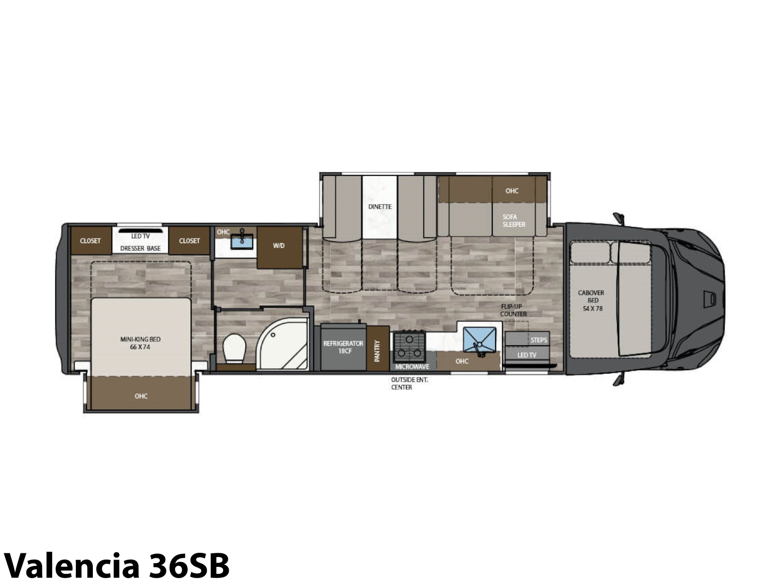 The 2025 Renegade RV Valencia is a Class C diesel that combines family-friendly features with stylish details to make living and traveling a pleasure. The Valencia’s functional design creates a spacious and inviting interior. Every Valencia is built with high-quality maple cabinets that provide ample storage to accommodate your needs. The ultra-soft furniture, polished solid surface countertops and stainless steel appliances are just a few of the beautifully designed features you will find in this RV.