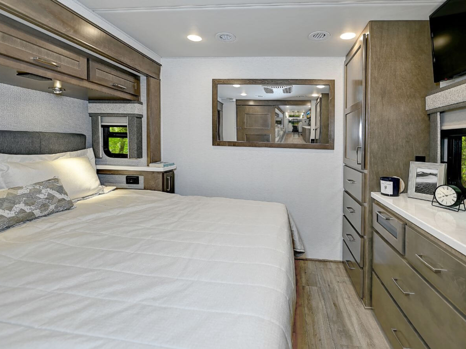 The 2025 Renegade RV Valencia is a Class C diesel that combines family-friendly features with stylish details to make living and traveling a pleasure. The Valencia’s functional design creates a spacious and inviting interior. Every Valencia is built with high-quality maple cabinets that provide ample storage to accommodate your needs. The ultra-soft furniture, polished solid surface countertops and stainless steel appliances are just a few of the beautifully designed features you will find in this RV.