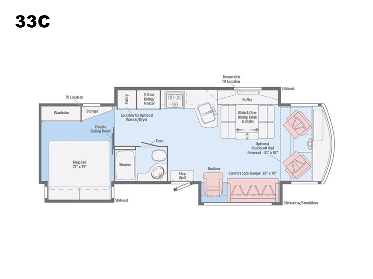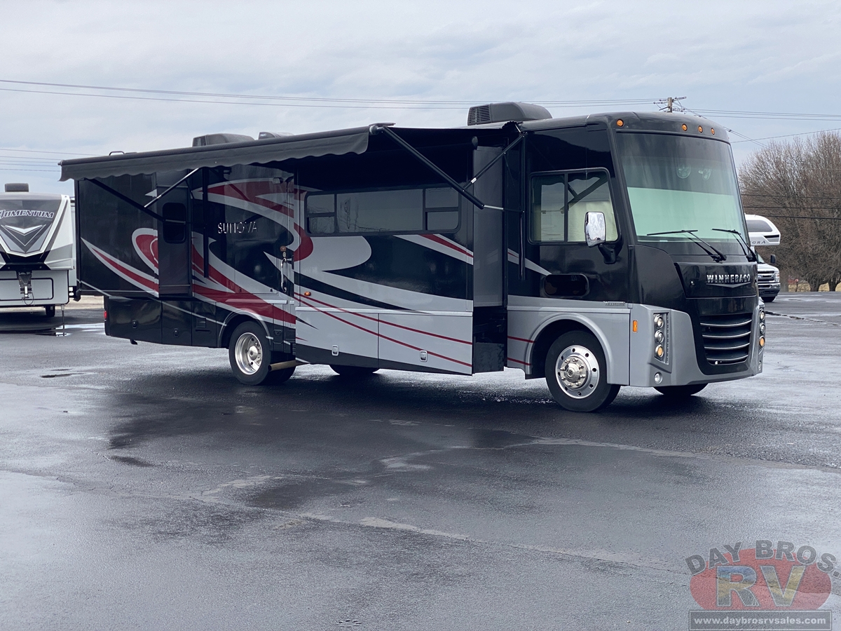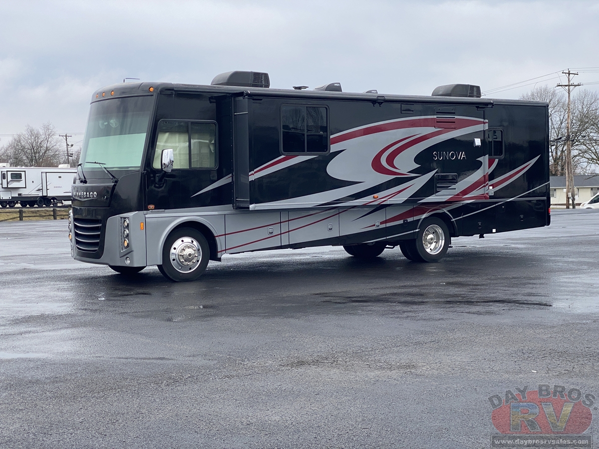 Fun-loving adventurers, meet your fun-loving Class A coach: the Sunova. Built to Winnebagos legendary quality standards, the newly-styled Sunova is packed with features that may have you wishing your trips would never end. Corian countertops, swivel Primera cab seats, and MCD solar/blackout roller shades are as functional as they are beautiful. This year the 36Z brings a new look to the Sunova lineup with a bath-and-a-half floorplan and a powered StudioLoft bed that adds sleeping space on demand. Each floorplan opens wide with three slideouts that offer plenty of relaxation and entertainment options such as a retractable HDTV, Glide & Dine table, an available Rest Easy sofa, and available Euro recliner. Dont miss another year of fun and adventure in your very own Sunova.
