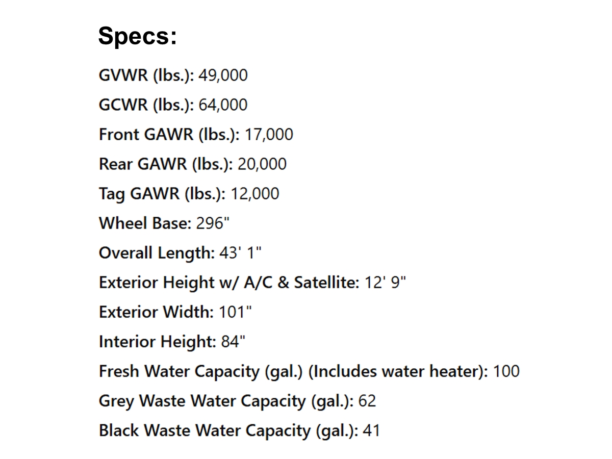 - Exterior Height w/ A/C & Satellite: 12' 9"