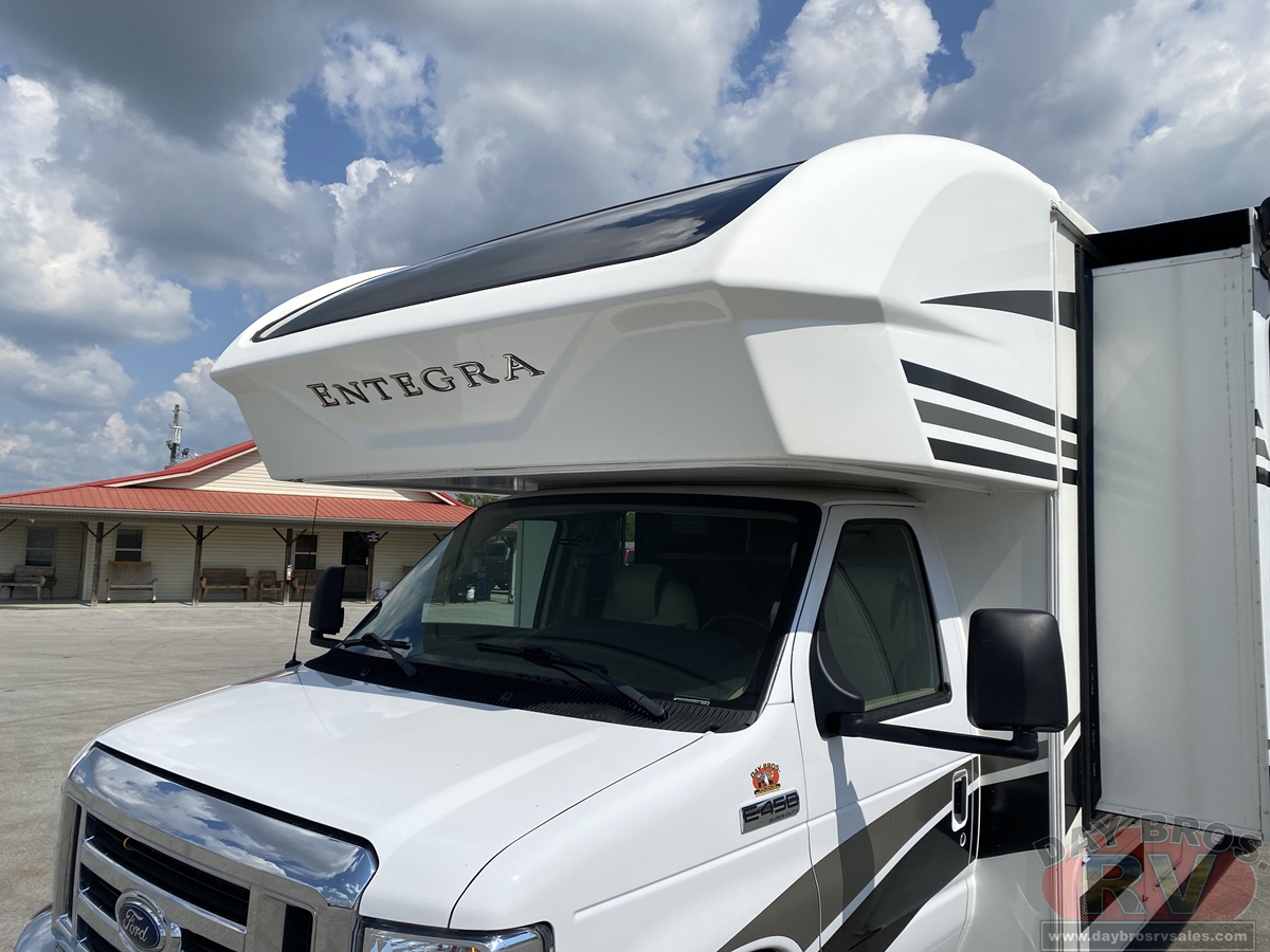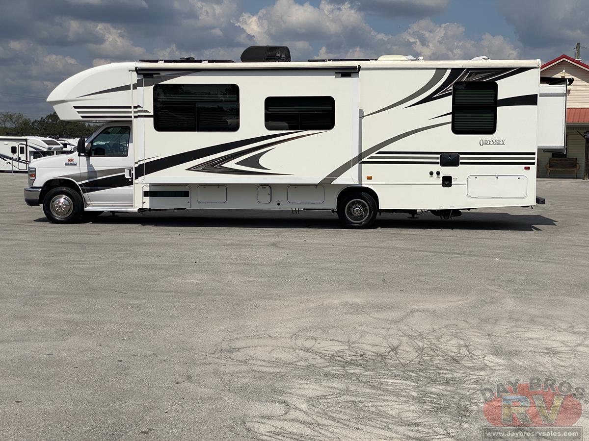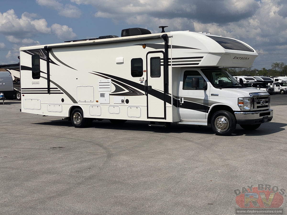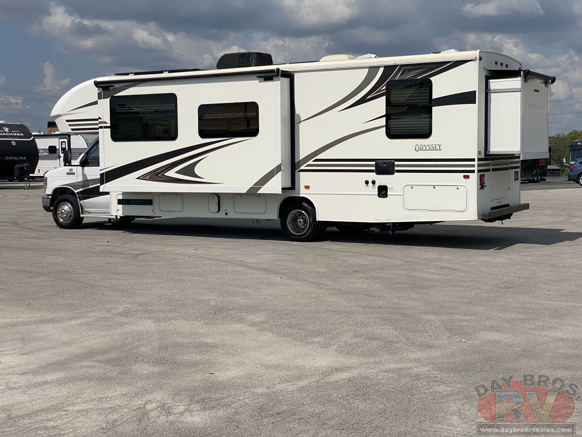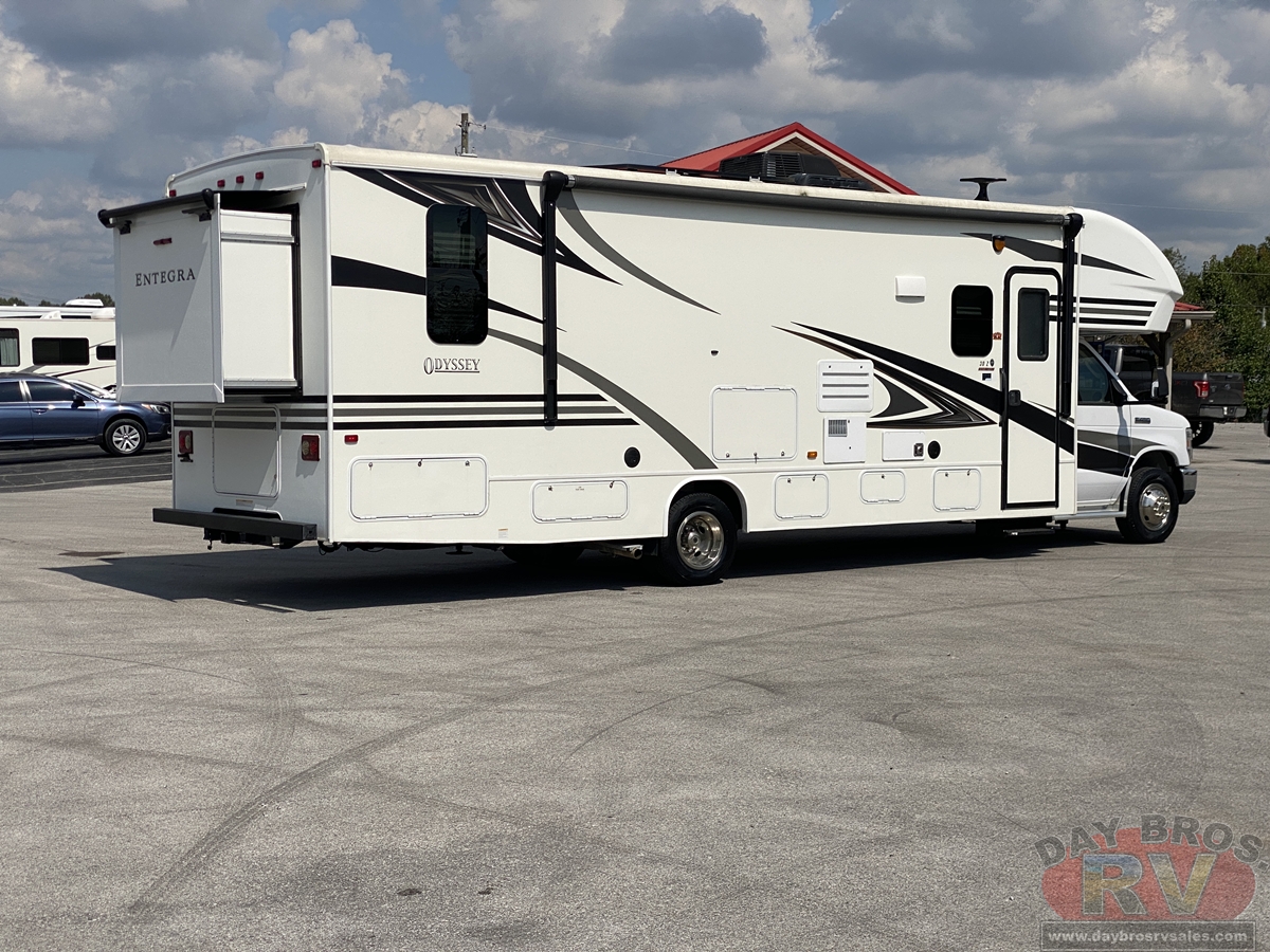 The 2019 Entegra Odyssey Class C RV 30Z features a one piece seamless fiberglass roof, frameless windows, Hellwig Helper Springs, front and rear stabilizer bars, Ford E-450 chassis and a Triton 6.8L V-10 engine. You will also love the Entegra Coach Odyssey's amazing new molded front cap that distinguishes this class C from any other on the market today. The distinctive design also enables the front cab-over to feature a huge built-in skylight with power shade. Just push a button and let Mother Nature light up the beautiful decor that can only be found in an Entegra RV or lie in bed and gaze at the stars at the end of a fun filled day. This amazing RVs options also include the beautiful partial paint exterior, theater seats, bedroom TV, automatic hydraulic leveling jacks and the Customer Value Package option which includes LED TV, large refrigerator, backup camera with monitor, electric awning, infotainment system, and tank heating pads. The Entegra Odyssey also has an incredible list of standard features including a 15,000 BTU A/C, water filtration system, Onan generator, luxurious foam mattress, 3 burner range, running boards, exterior speakers, electric entrance step, infotainment system, exterior shower, ball-bearing drawer guides and much more.