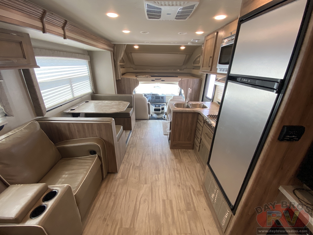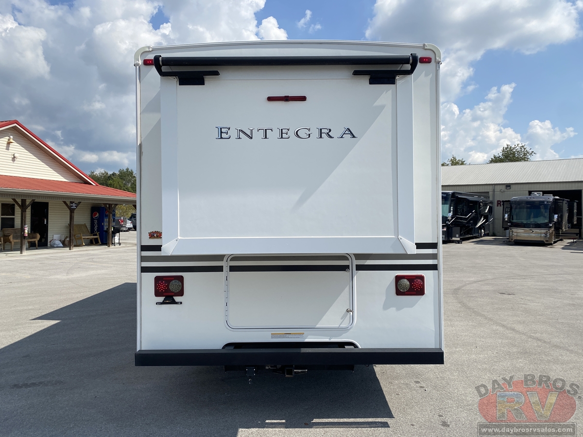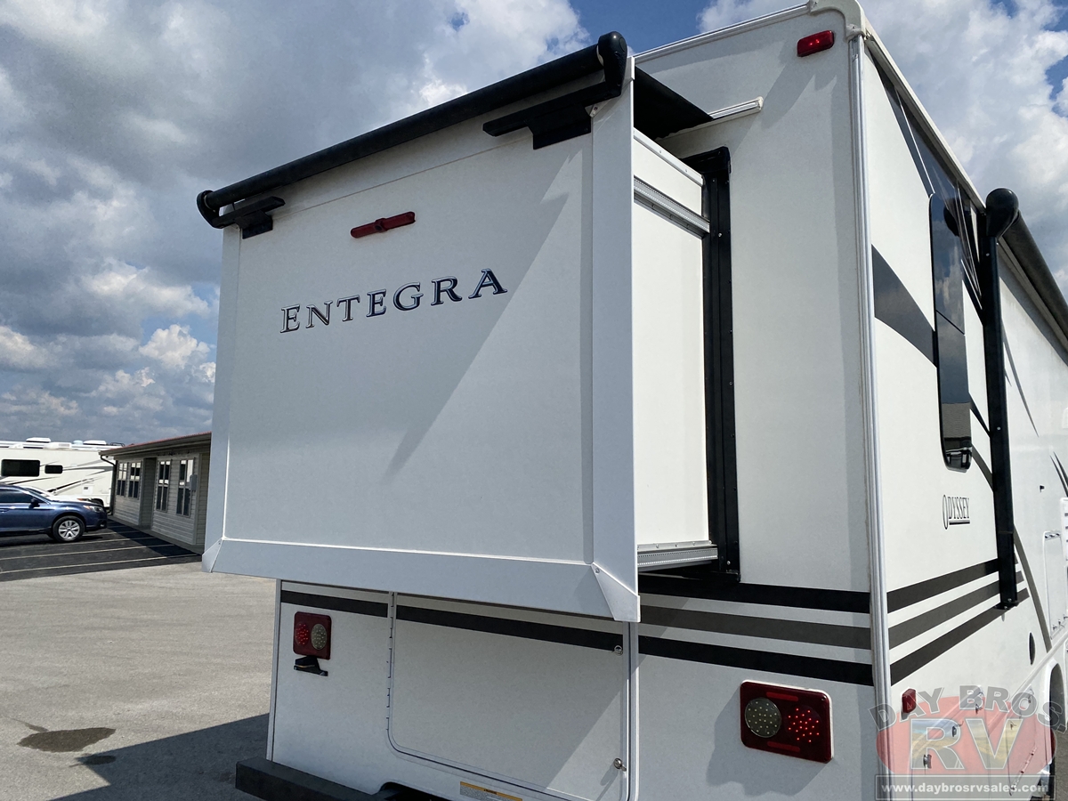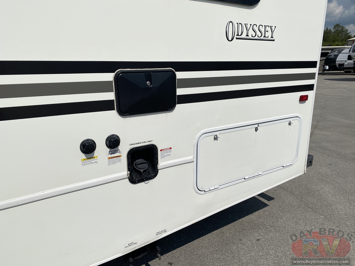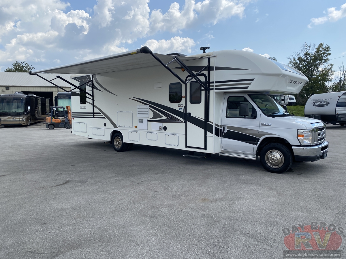 The 2019 Entegra Odyssey Class C RV 30Z features a one piece seamless fiberglass roof, frameless windows, Hellwig Helper Springs, front and rear stabilizer bars, Ford E-450 chassis and a Triton 6.8L V-10 engine. You will also love the Entegra Coach Odyssey's amazing new molded front cap that distinguishes this class C from any other on the market today. The distinctive design also enables the front cab-over to feature a huge built-in skylight with power shade. Just push a button and let Mother Nature light up the beautiful decor that can only be found in an Entegra RV or lie in bed and gaze at the stars at the end of a fun filled day. This amazing RVs options also include the beautiful partial paint exterior, theater seats, bedroom TV, automatic hydraulic leveling jacks and the Customer Value Package option which includes LED TV, large refrigerator, backup camera with monitor, electric awning, infotainment system, and tank heating pads. The Entegra Odyssey also has an incredible list of standard features including a 15,000 BTU A/C, water filtration system, Onan generator, luxurious foam mattress, 3 burner range, running boards, exterior speakers, electric entrance step, infotainment system, exterior shower, ball-bearing drawer guides and much more.