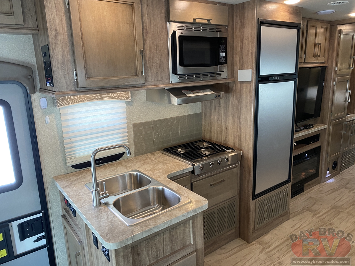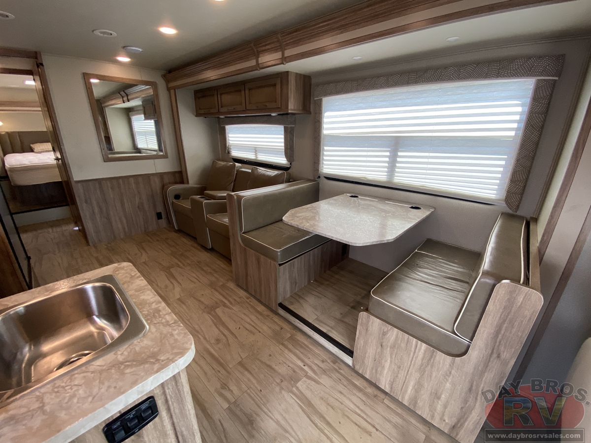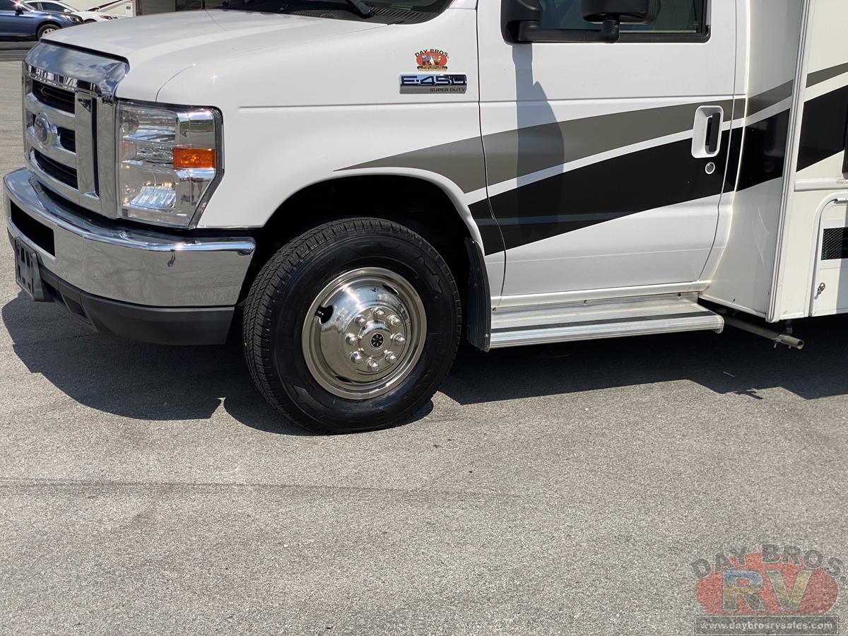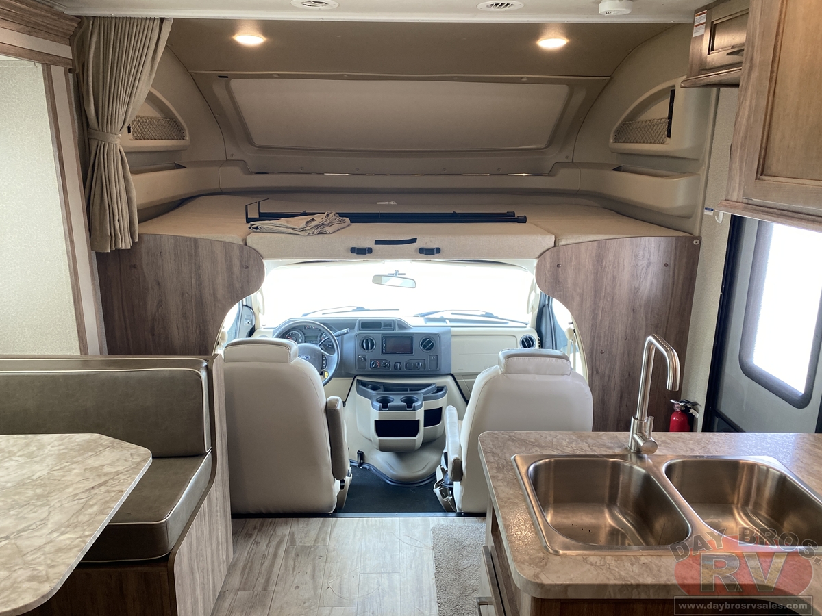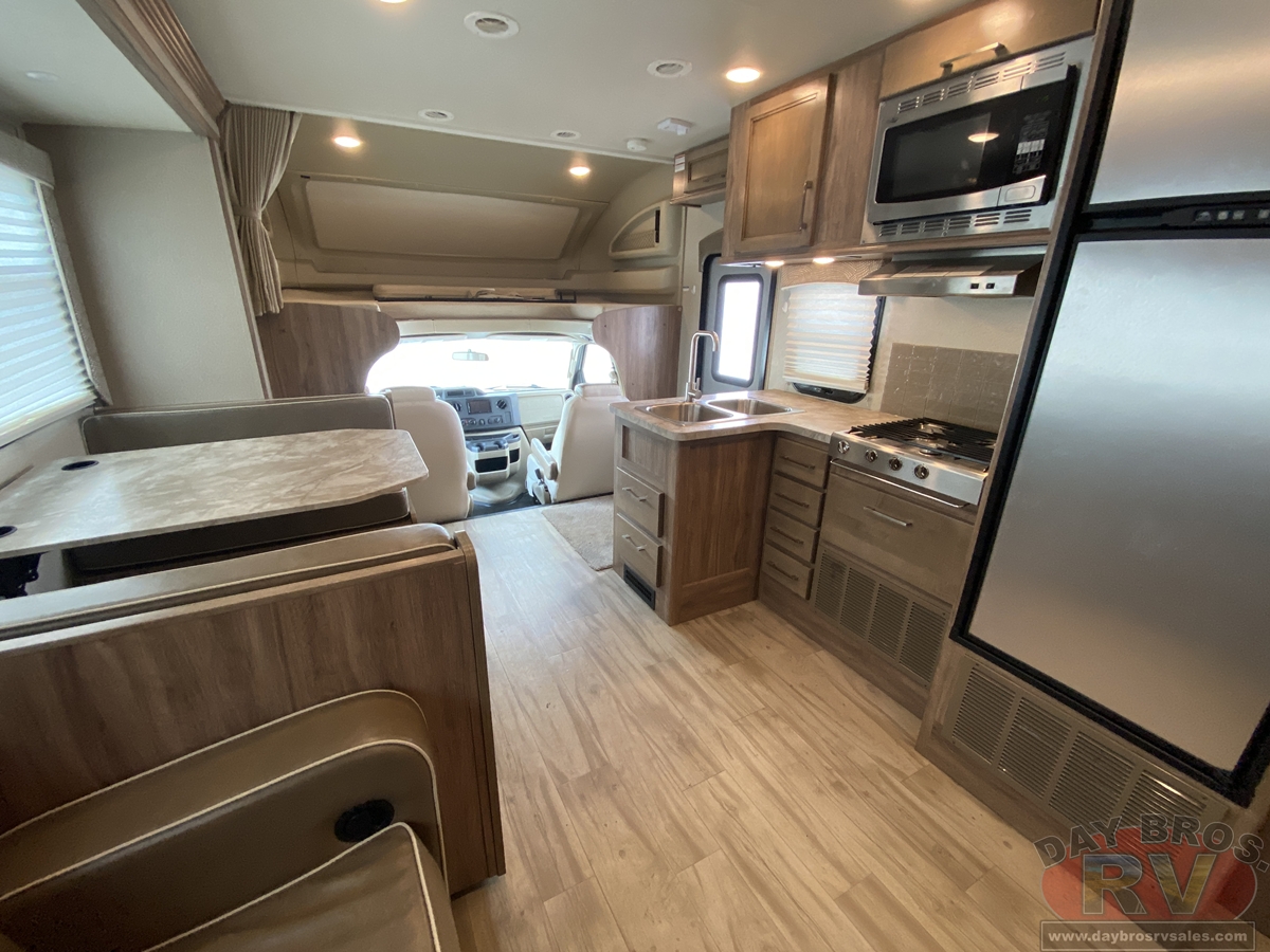 The 2019 Entegra Odyssey Class C RV 30Z features a one piece seamless fiberglass roof, frameless windows, Hellwig Helper Springs, front and rear stabilizer bars, Ford E-450 chassis and a Triton 6.8L V-10 engine. You will also love the Entegra Coach Odyssey's amazing new molded front cap that distinguishes this class C from any other on the market today. The distinctive design also enables the front cab-over to feature a huge built-in skylight with power shade. Just push a button and let Mother Nature light up the beautiful decor that can only be found in an Entegra RV or lie in bed and gaze at the stars at the end of a fun filled day. This amazing RVs options also include the beautiful partial paint exterior, theater seats, bedroom TV, automatic hydraulic leveling jacks and the Customer Value Package option which includes LED TV, large refrigerator, backup camera with monitor, electric awning, infotainment system, and tank heating pads. The Entegra Odyssey also has an incredible list of standard features including a 15,000 BTU A/C, water filtration system, Onan generator, luxurious foam mattress, 3 burner range, running boards, exterior speakers, electric entrance step, infotainment system, exterior shower, ball-bearing drawer guides and much more.