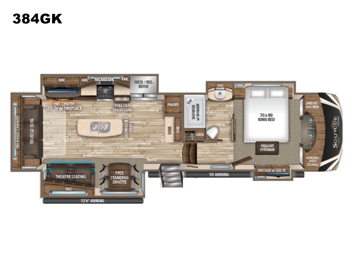 If more room is what you desire, Solitude is the most spacious Extended Stay Fifth Wheel ever built! The Solitude RV delivers taller ceilings, taller, deeper cabinets, larger scenic window areas, a full 6' 8" tall slide-out, and a body width that measures a full 101 inches!