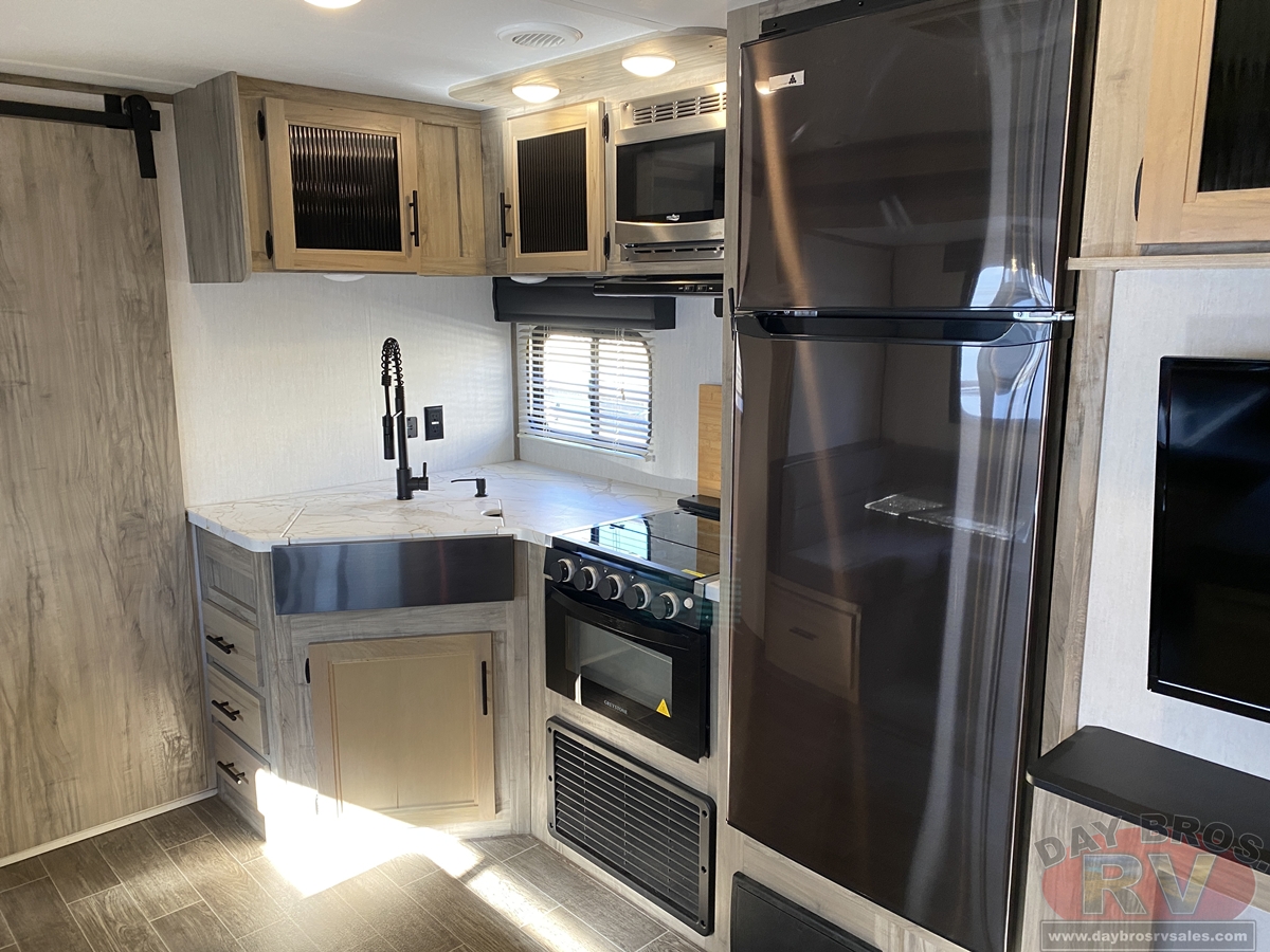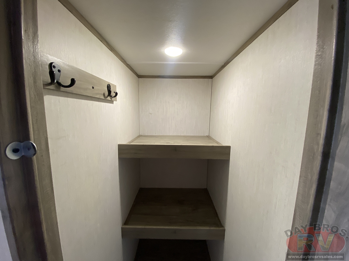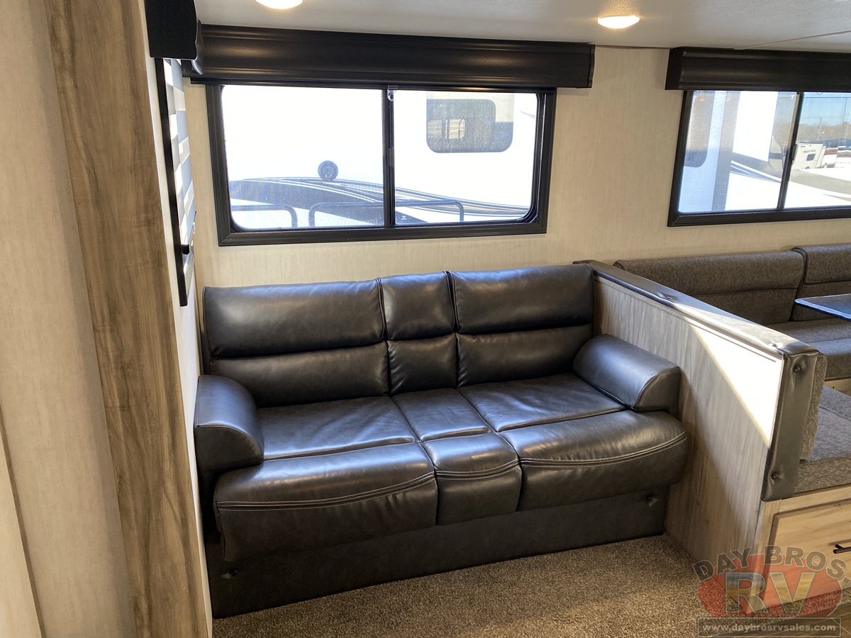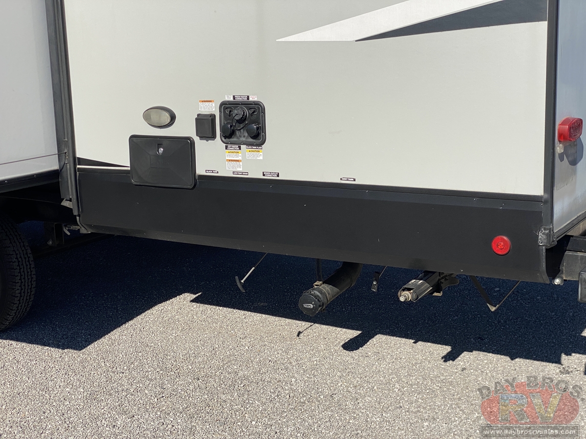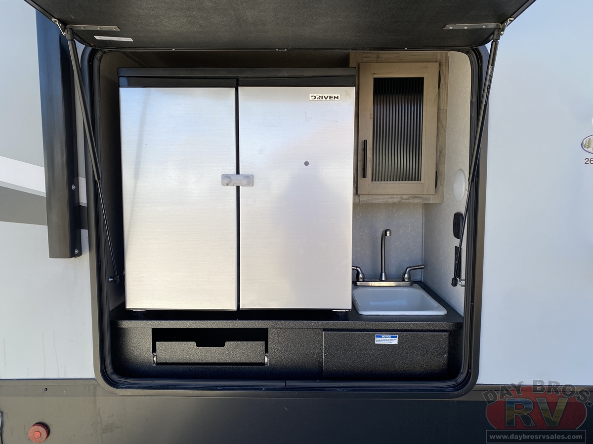 Perfect for the two of you that want to get out and tour or spend the summer at your favorite camp site! Some interior appointments include, abundant interior storage capacity, oversized rear bath with additional linen cabinet, oversized u-dinette seating surface, dual pots and pans drawers, farm-style sink and dual barn-style doors. Some exterior refinements include an oversized 20’ exterior awning and a full outside kitchen with fridge/freezer, working sink and cabinet storage!